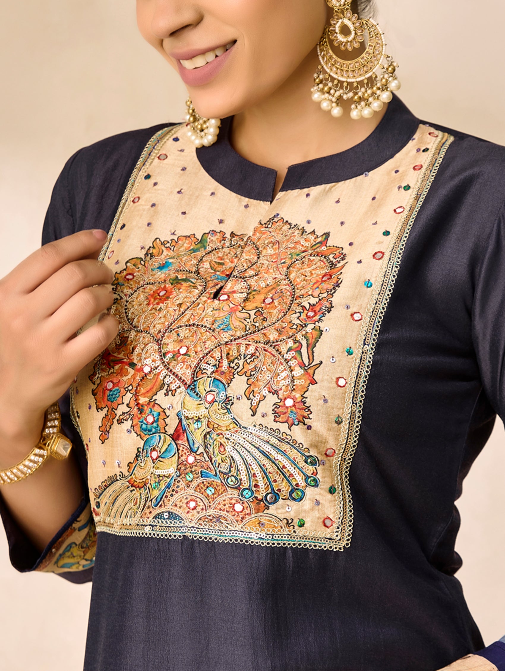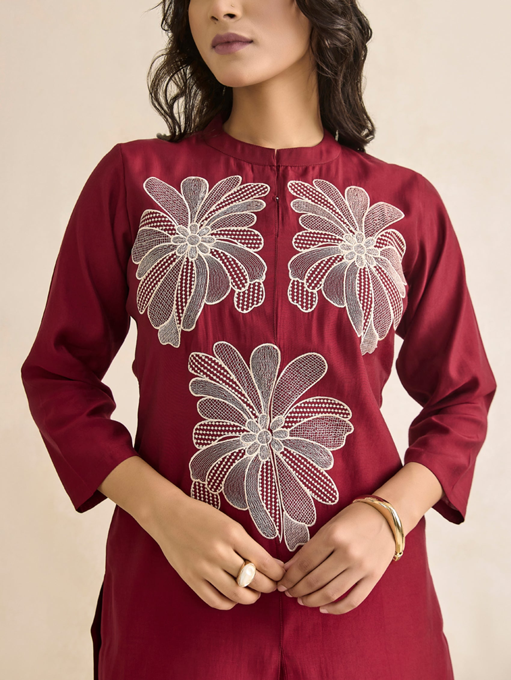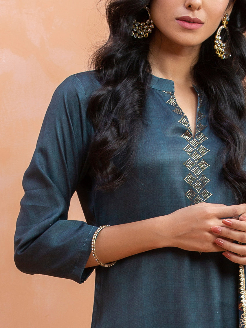 • Kurta with round neckline, three-fourth sleeves, and side slits open