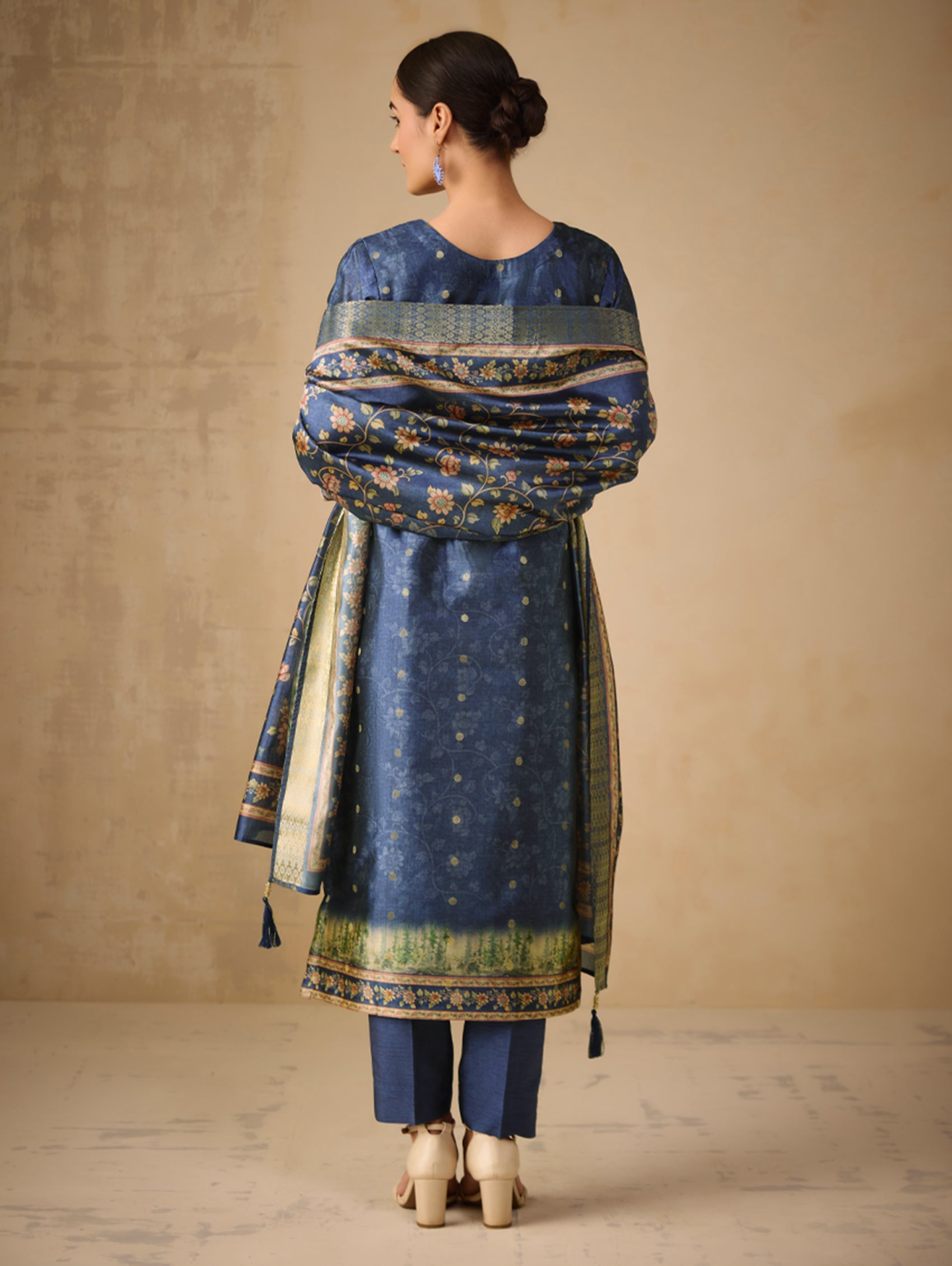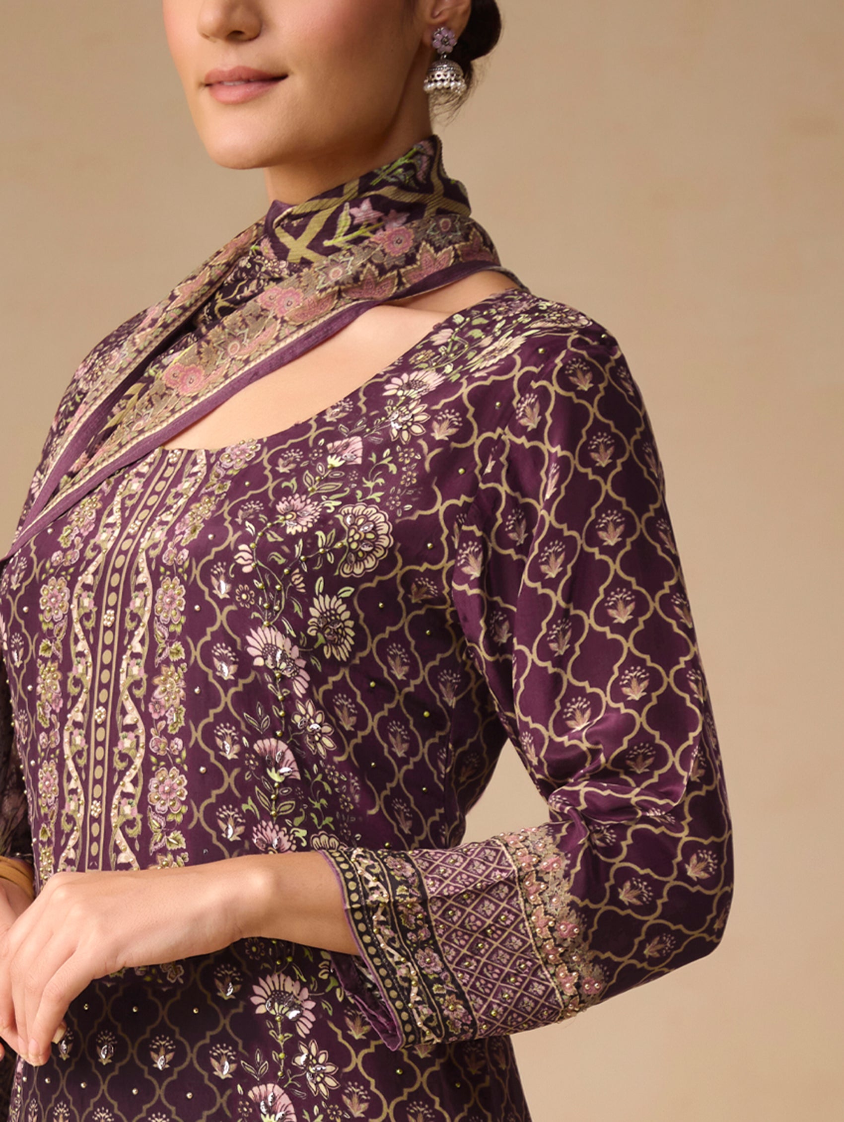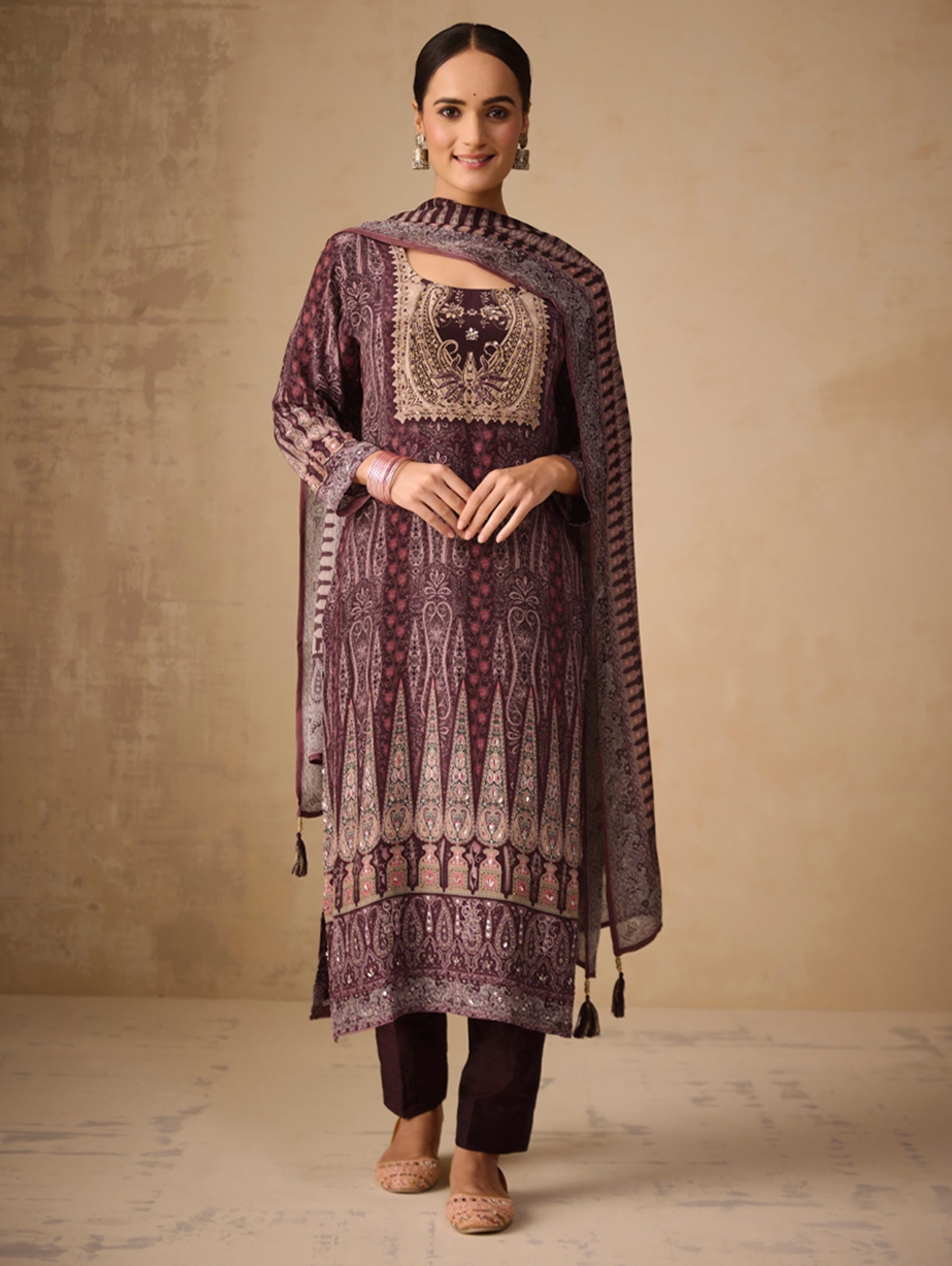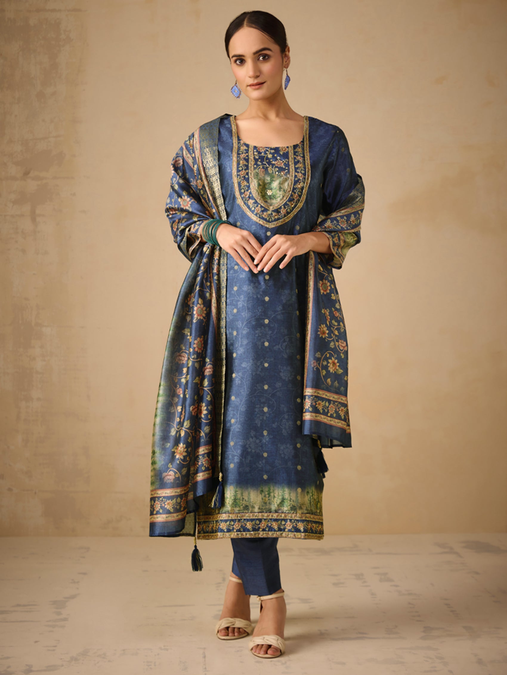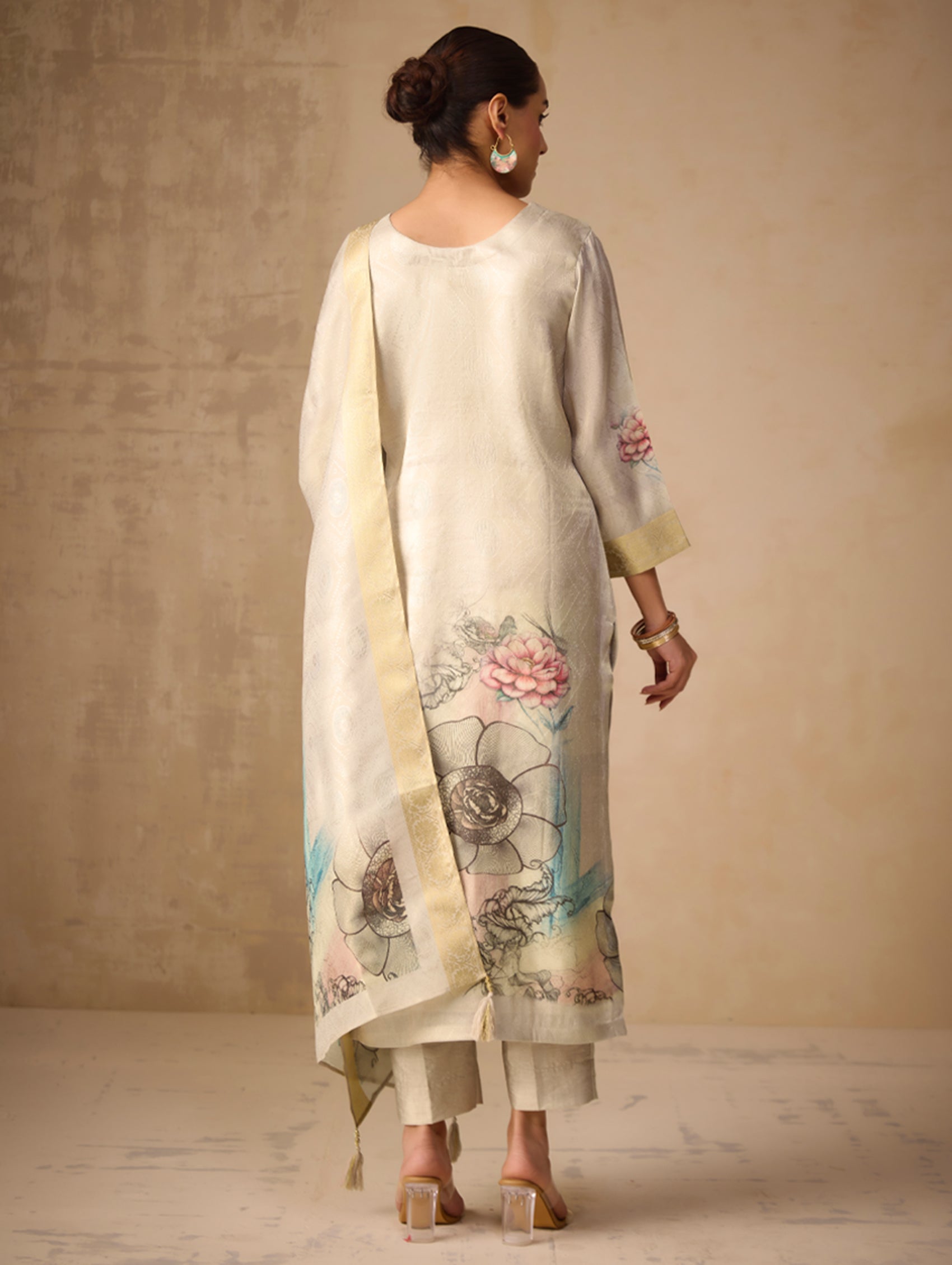 Experience the elegance of this digitally printed viscose muslin silk suit set, showcasing a kurta embellished with detailed computerised thread and hand embroidery. It comes with timeless pants and a matching digitally printed muslin silk dupatta. Perfect for those who value sophisticated fashion, this exquisite set adds lasting grace to your collection. Don’t miss out on owning this distinctive and stylish ensemble!