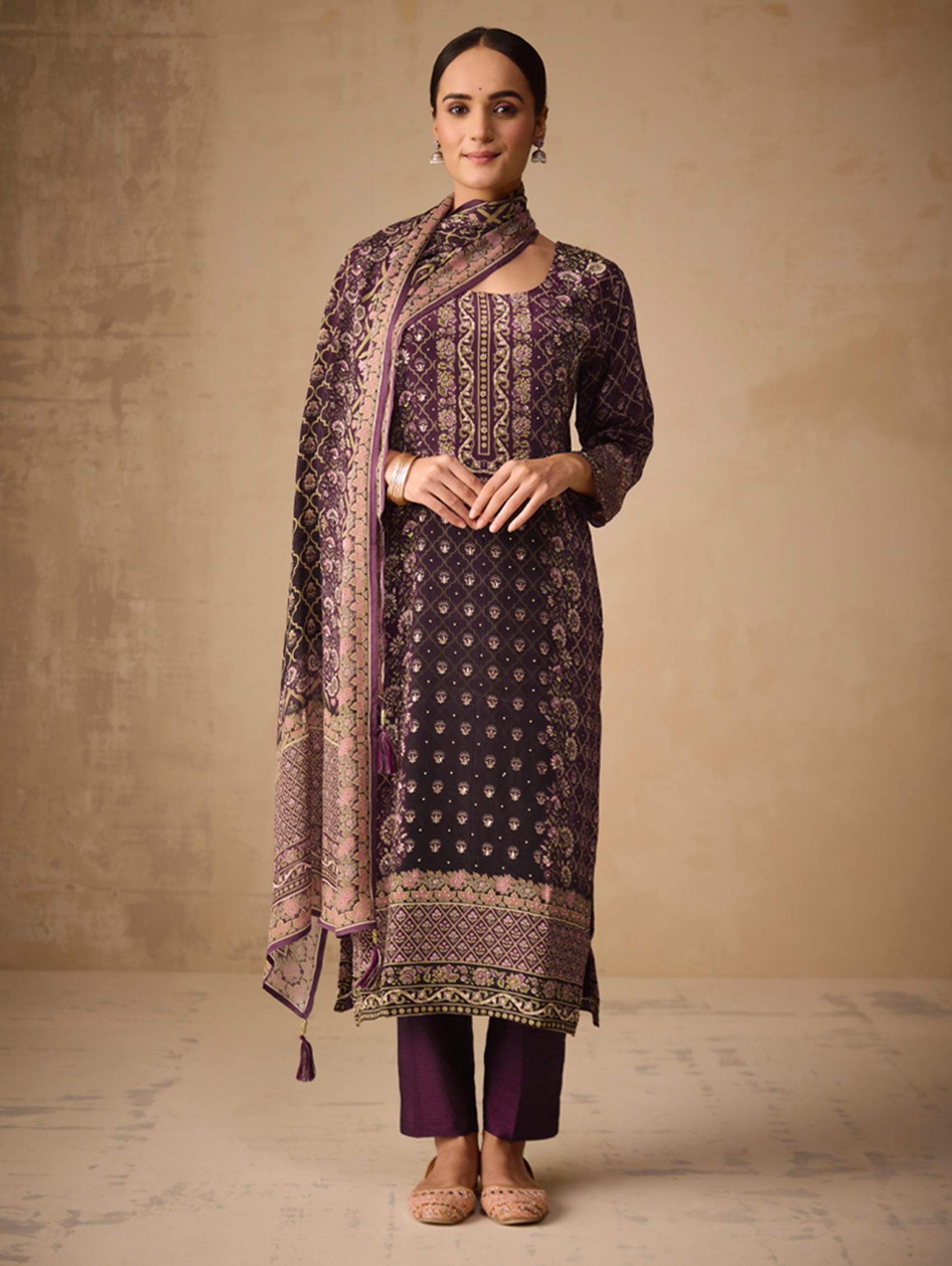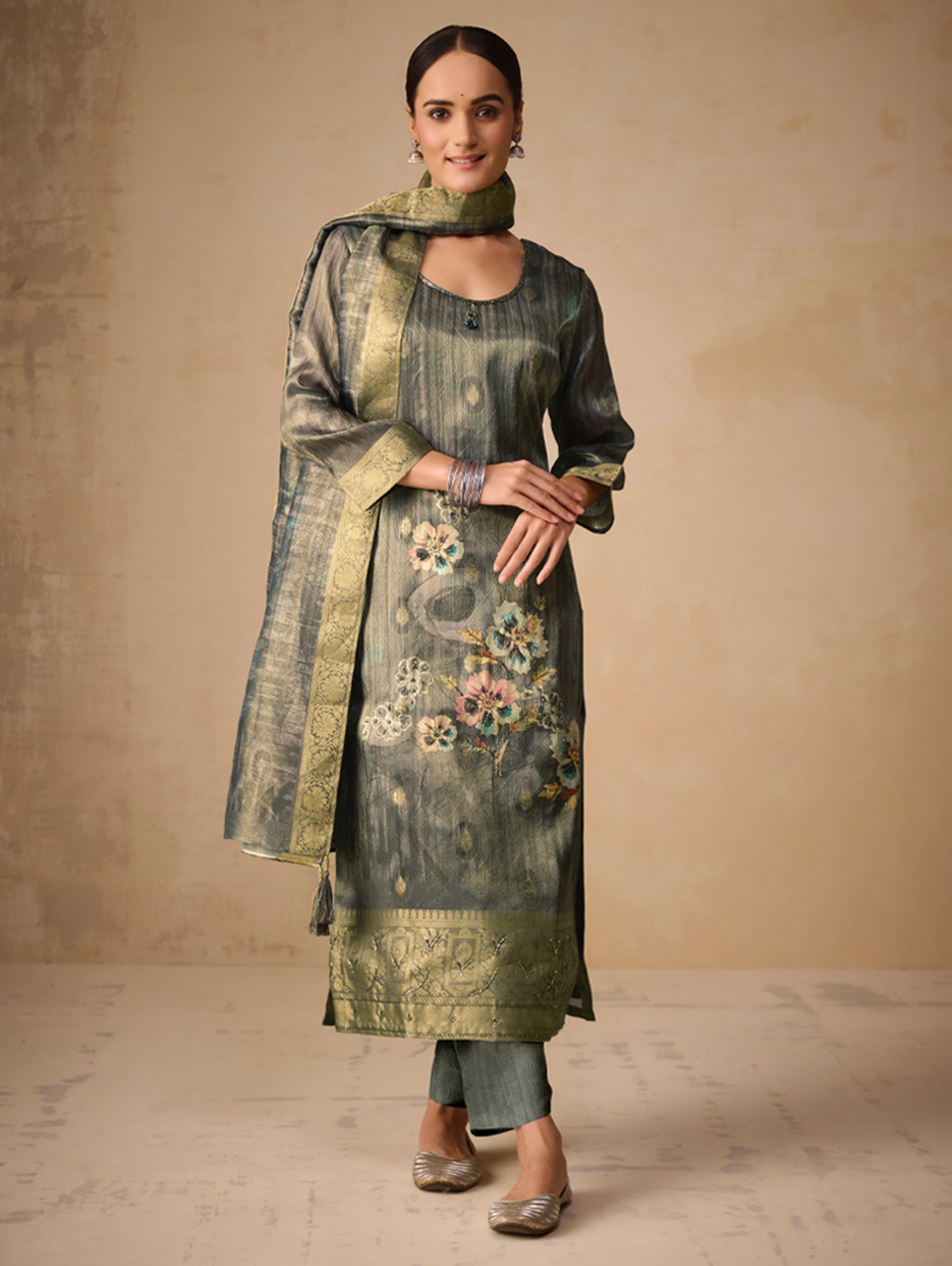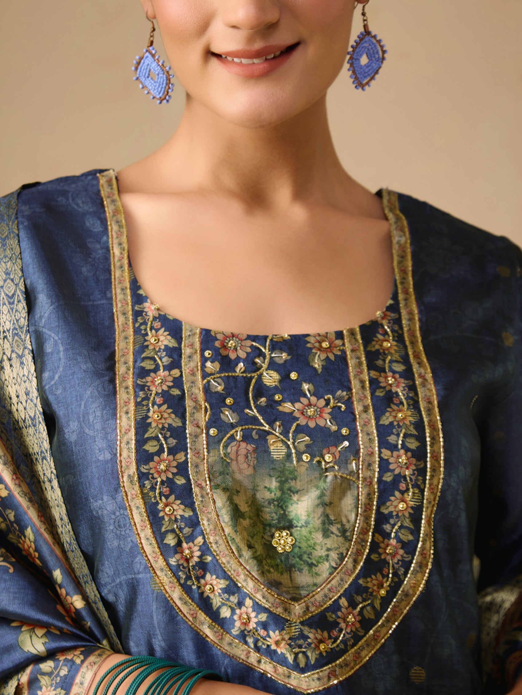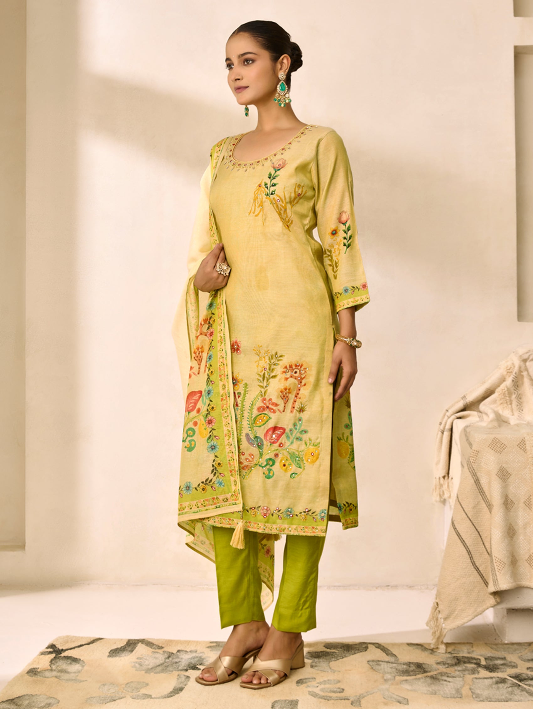 Experience the elegance of this digitally printed viscose muslin silk suit set, showcasing a kurta embellished with detailed computerised thread and hand embroidery. It comes with timeless pants and a matching digitally printed muslin silk dupatta. Perfect for those who value sophisticated fashion, this exquisite set adds lasting grace to your collection. Don’t miss out on owning this distinctive and stylish ensemble!