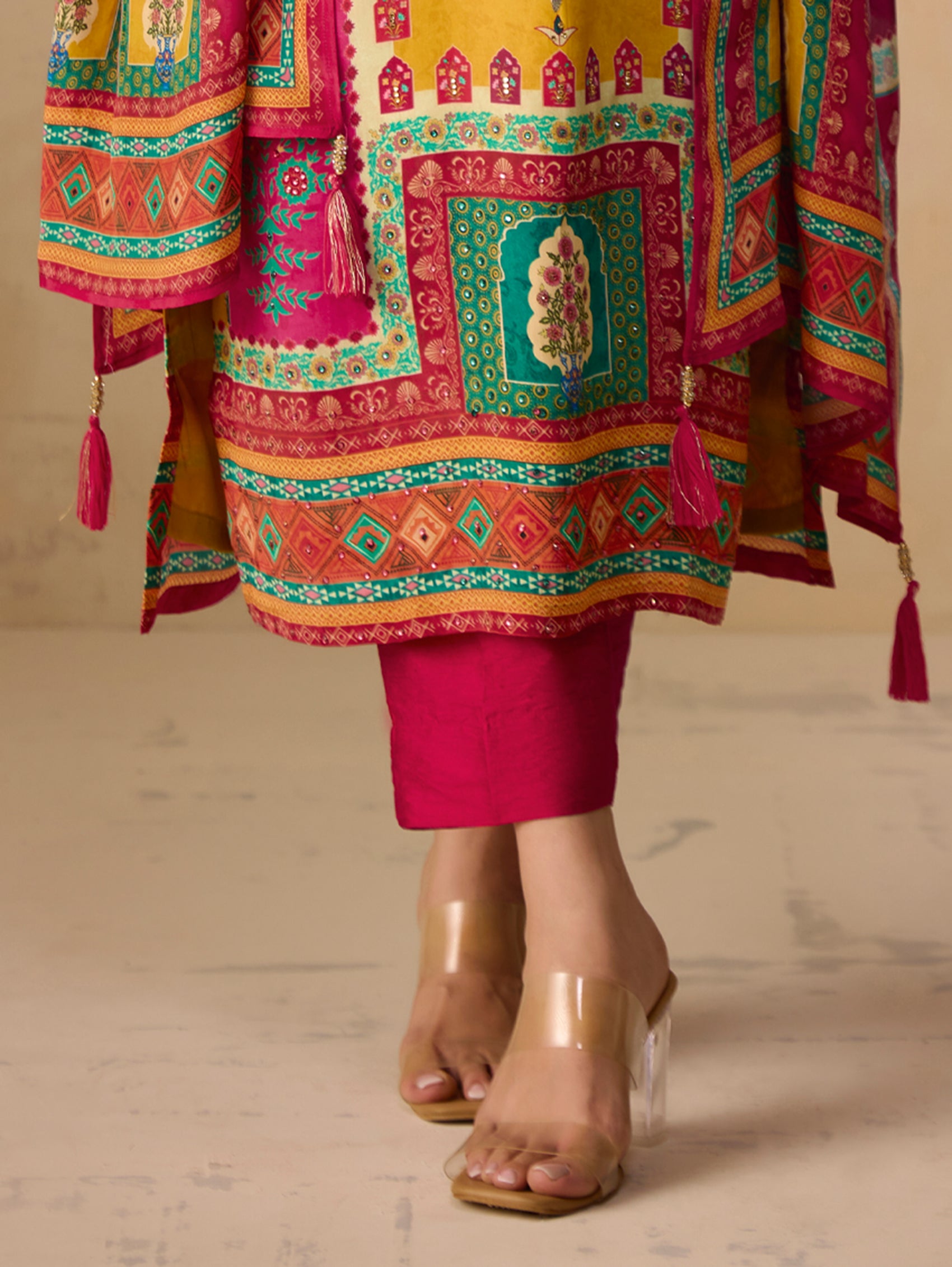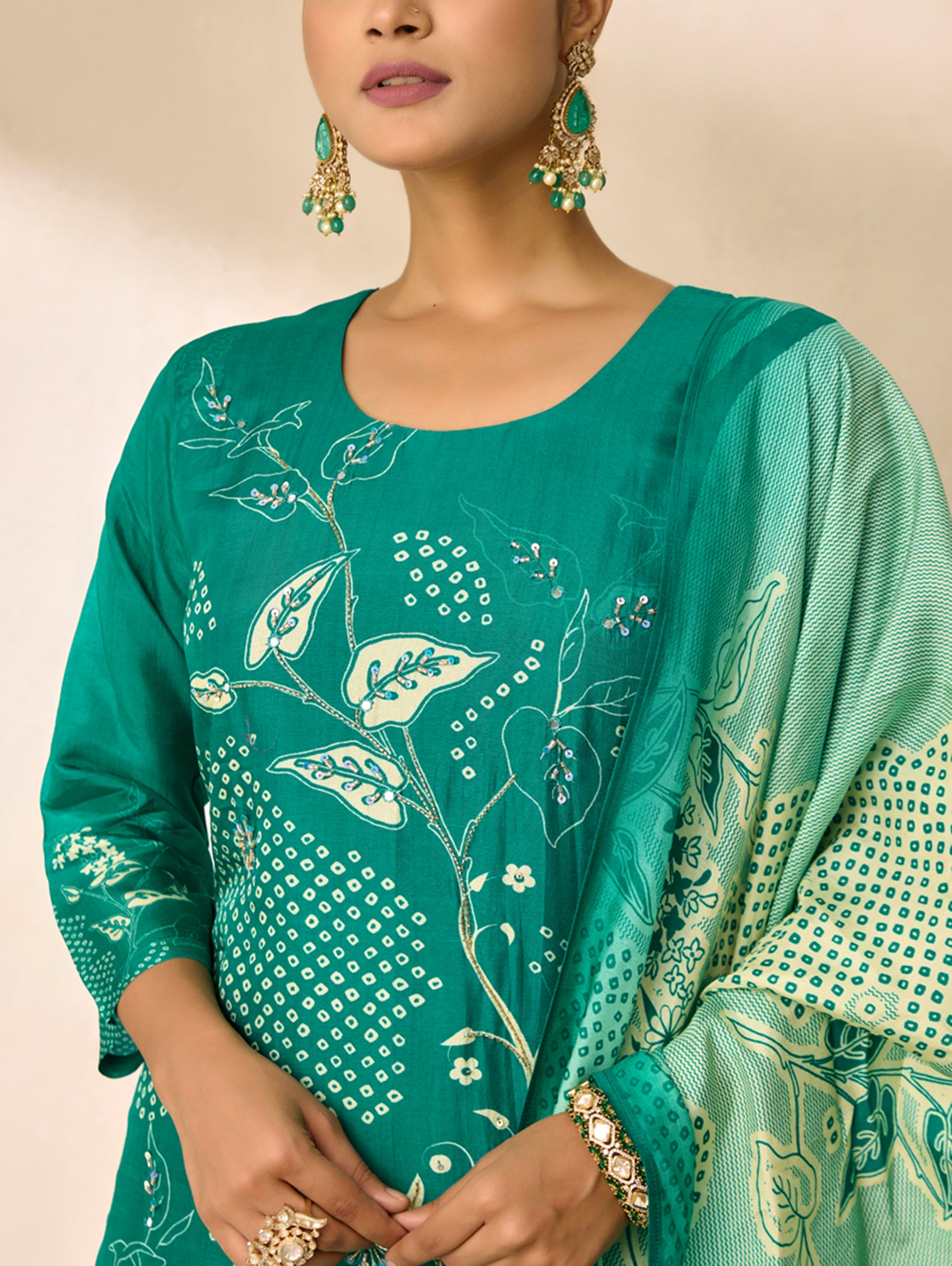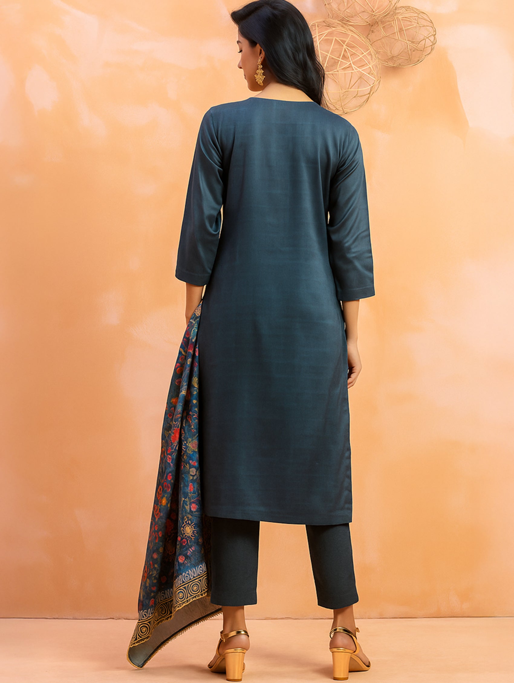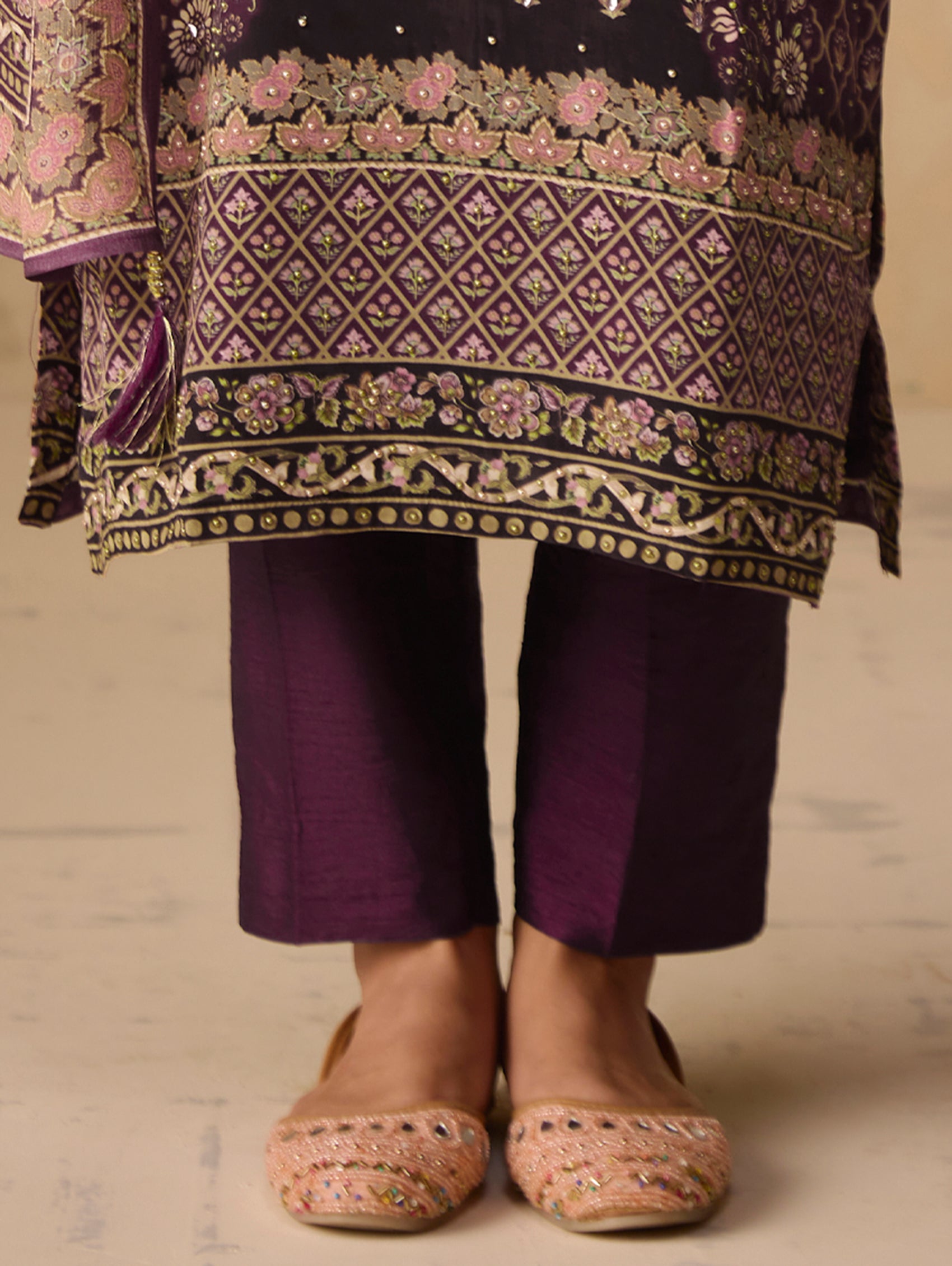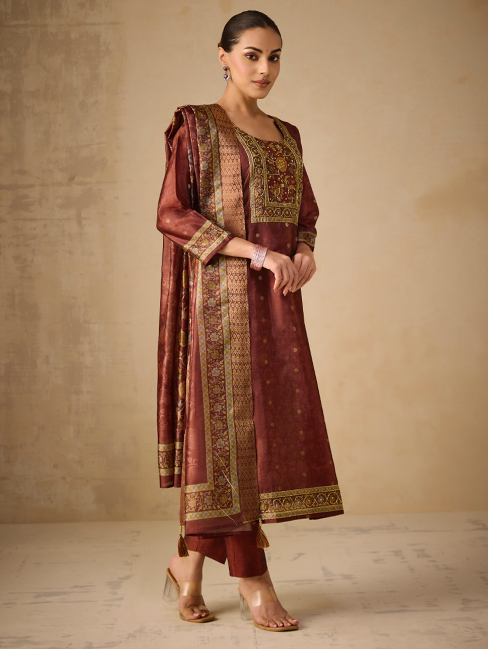 Experience the elegance of this digitally printed viscose muslin silk suit set, showcasing a kurta embellished with detailed computerised thread and hand embroidery. It comes with timeless pants and a matching digitally printed muslin silk dupatta. Perfect for those who value sophisticated fashion, this exquisite set adds lasting grace to your collection. Don’t miss out on owning this distinctive and stylish ensemble!