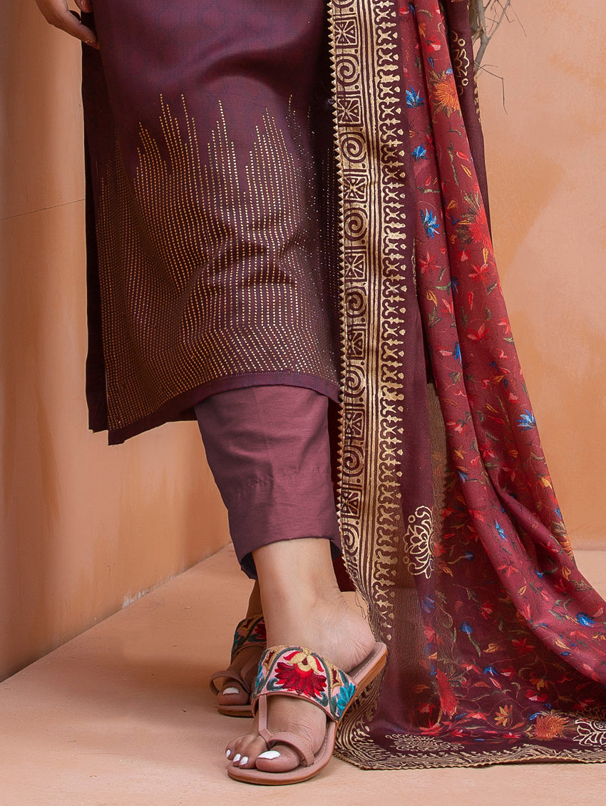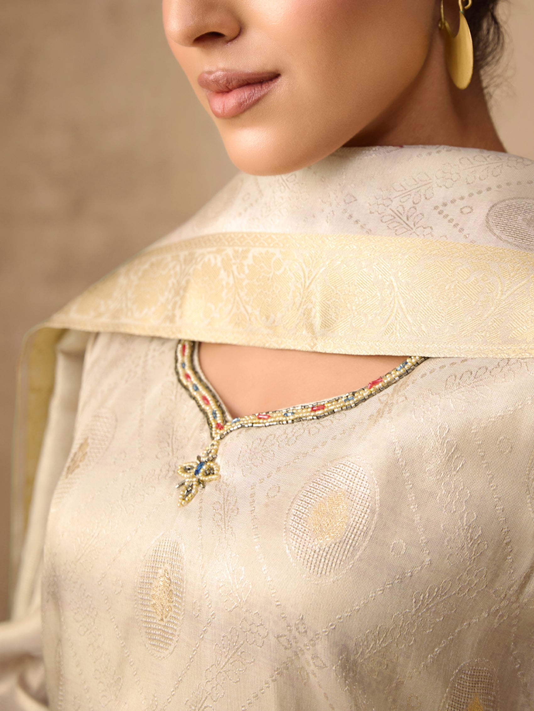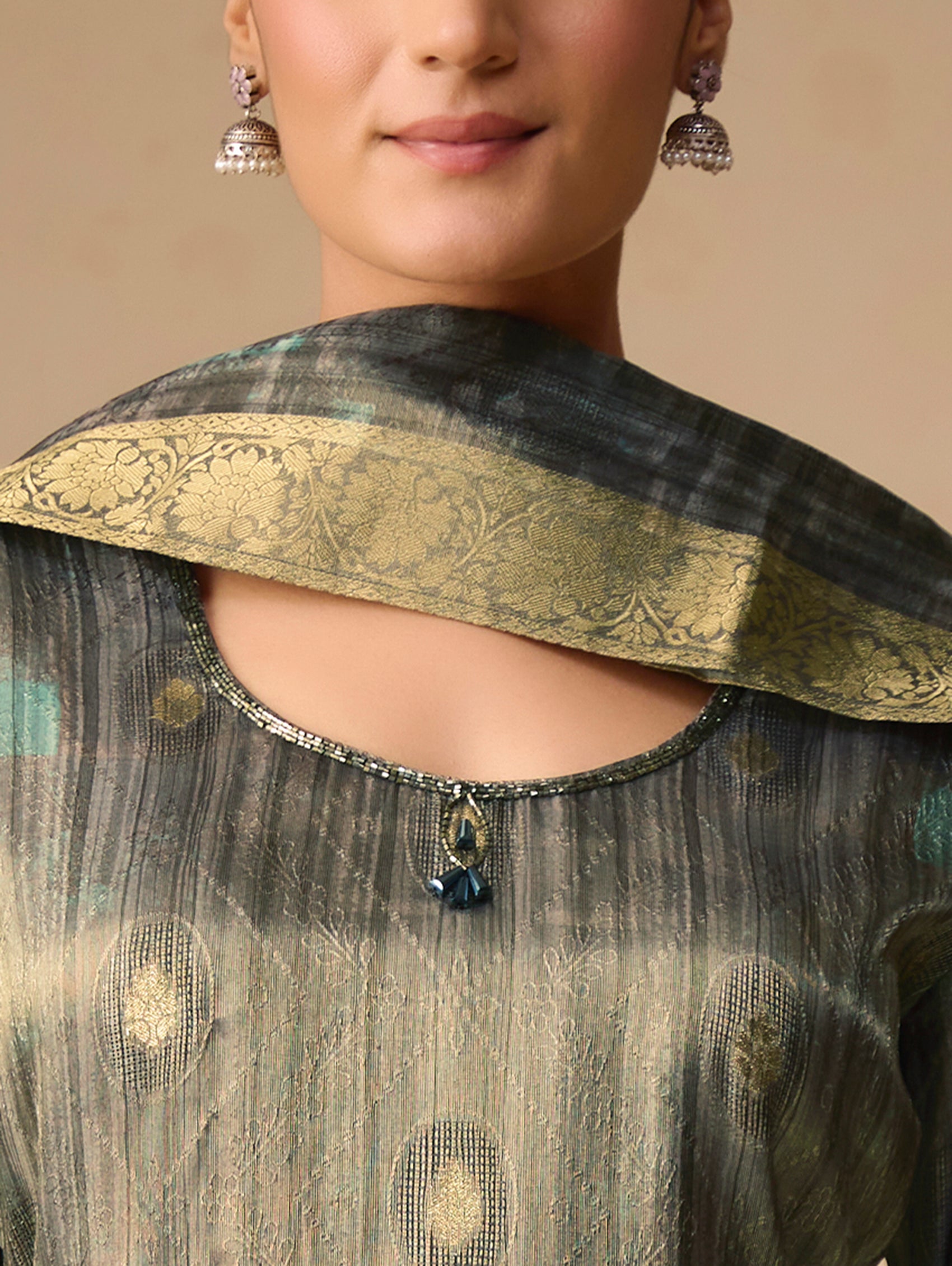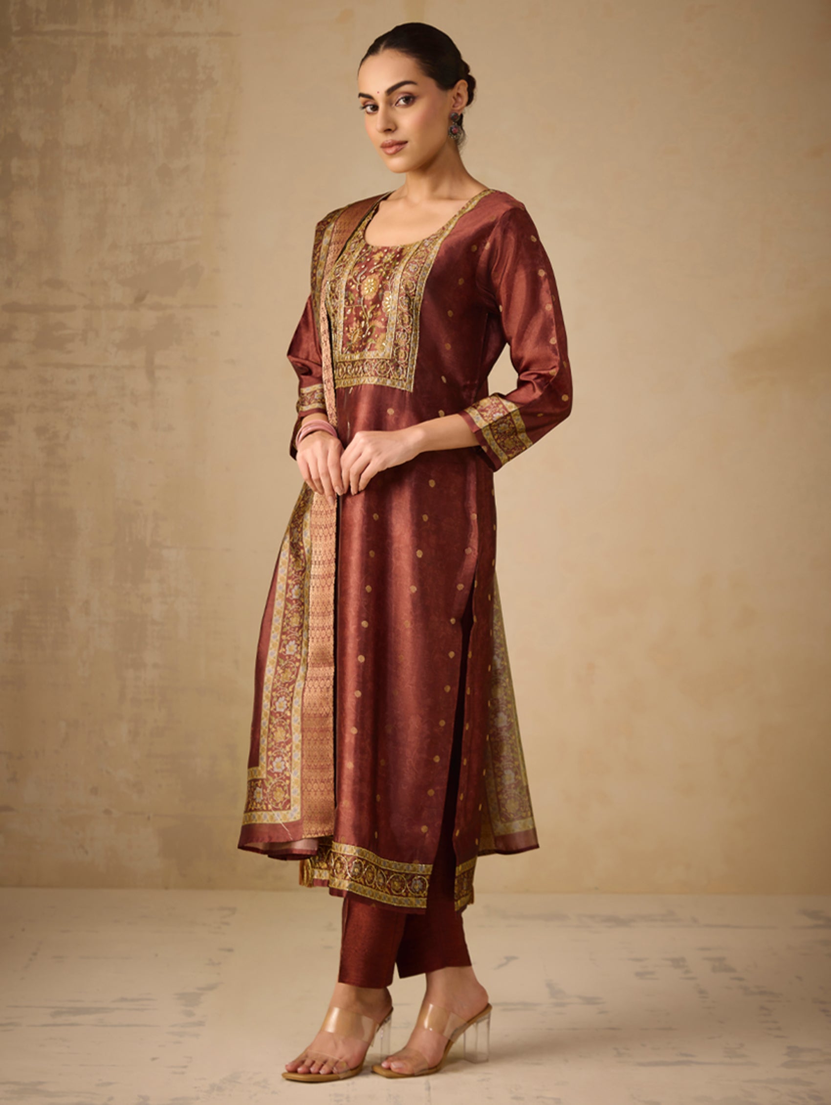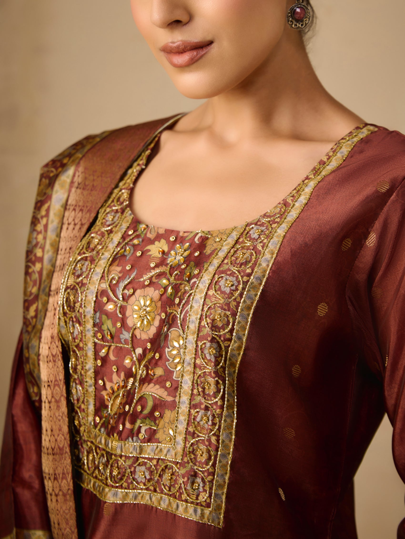 Experience the elegance of this digitally printed viscose muslin silk suit set, showcasing a kurta embellished with detailed computerised thread and hand embroidery. It comes with timeless pants and a matching digitally printed muslin silk dupatta. Perfect for those who value sophisticated fashion, this exquisite set adds lasting grace to your collection. Don’t miss out on owning this distinctive and stylish ensemble!