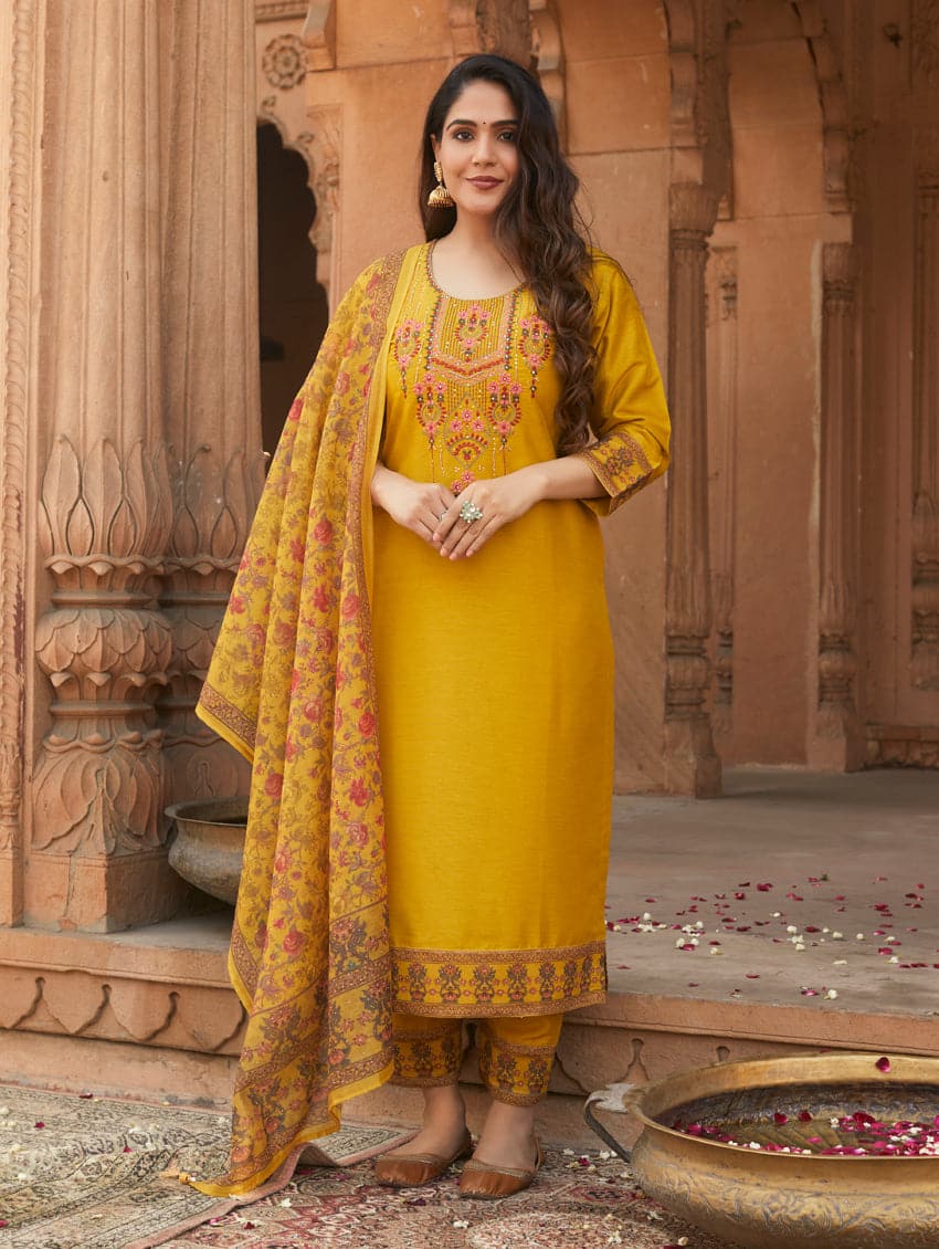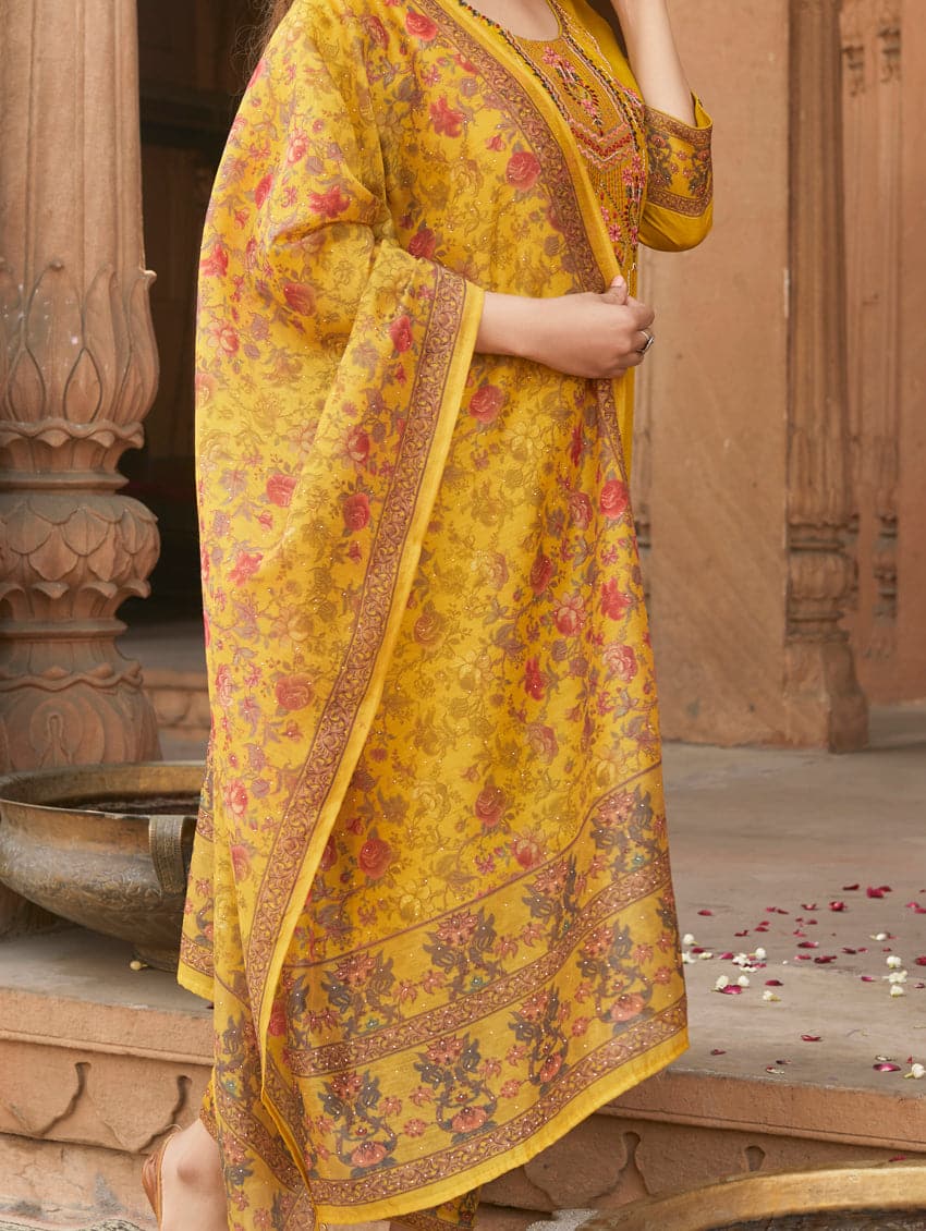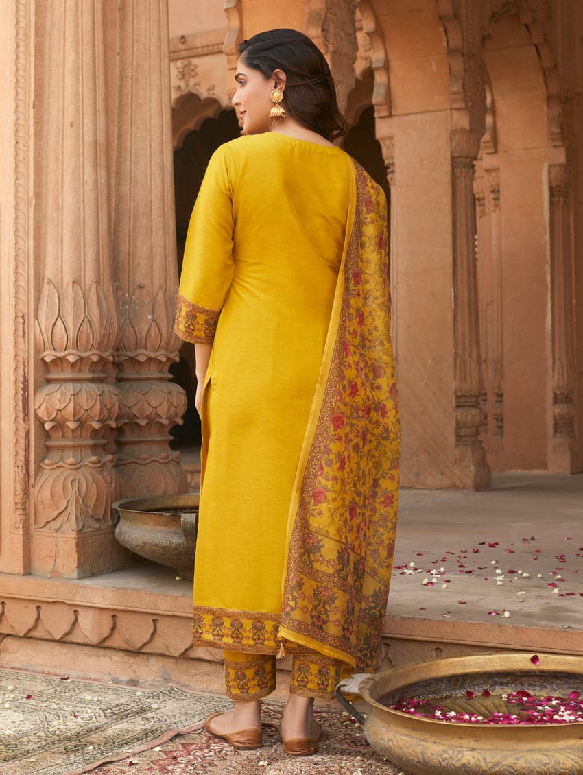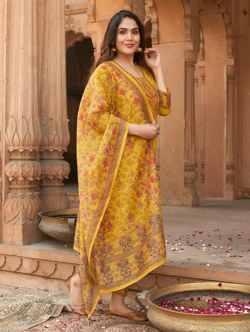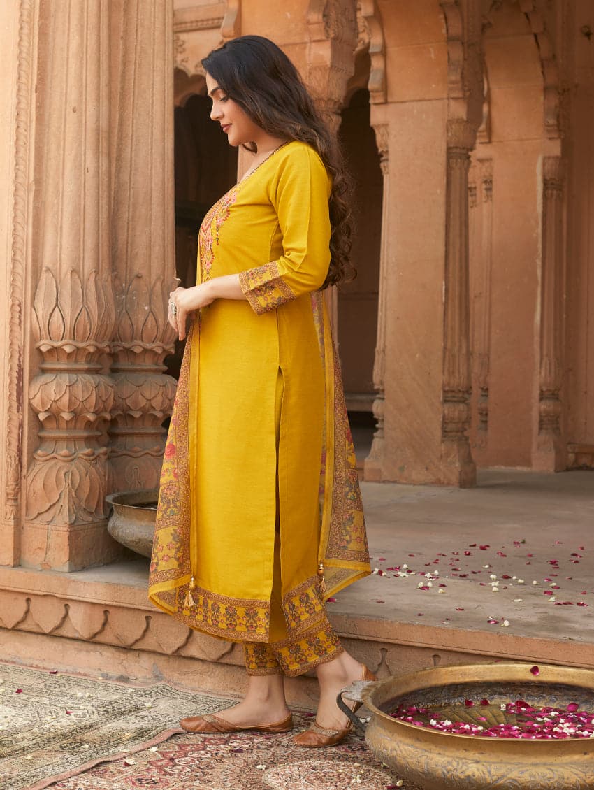 A straight-fit suit set from our latest collection. The set combines an embroidered rayon kurta and regular pants in printed cotton fabric, and a printed dupatta in mul fabric. Kurta comes accentuated with embroidery.