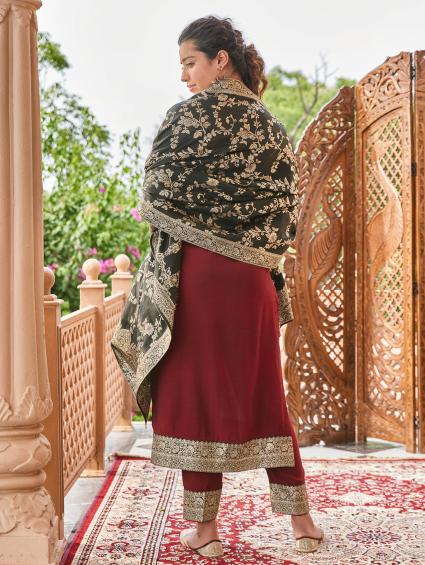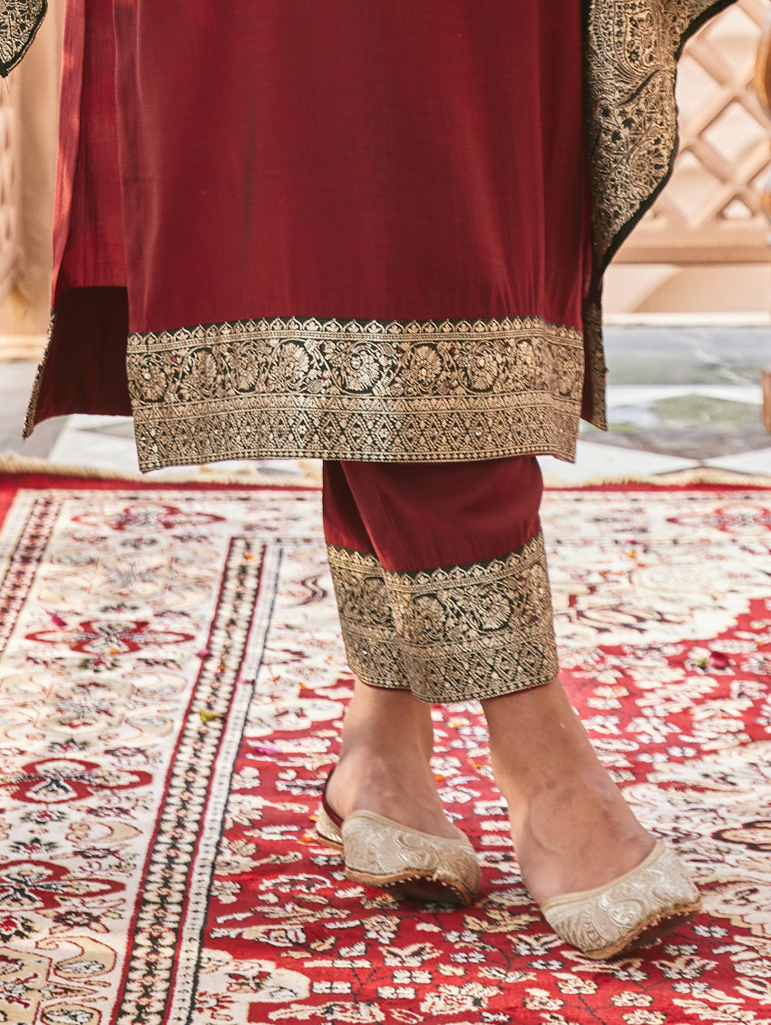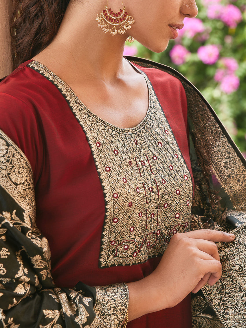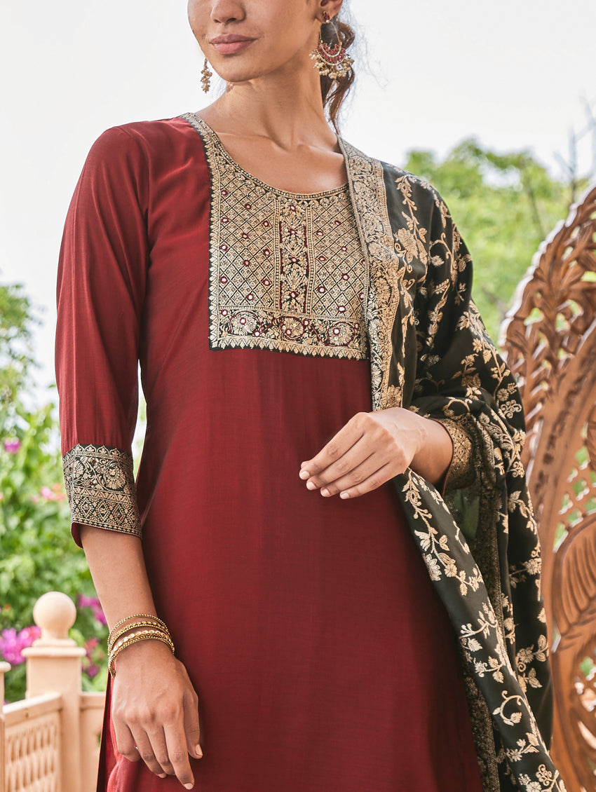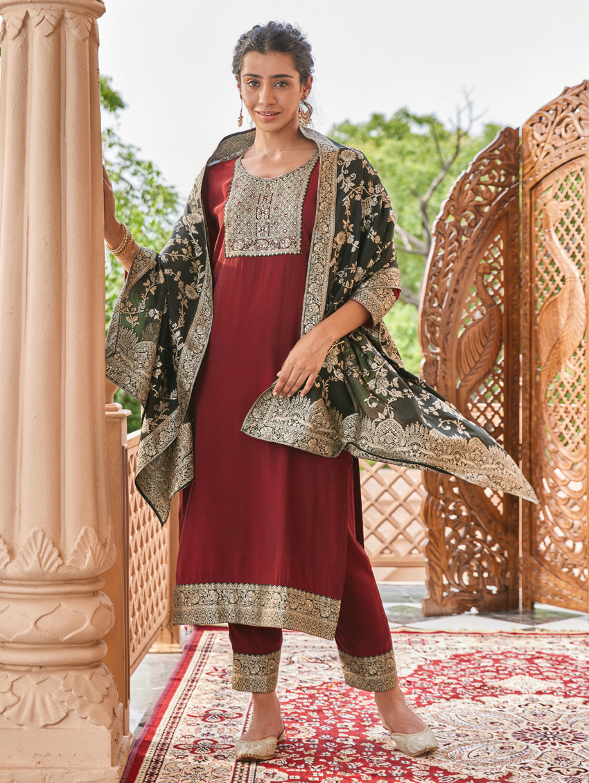 Update your casual collection with this suit set from our latest collection. The set includes a straight-fit silk kurta with computerized thread and hand embroidery, regular pants, and a digitally printed chanderi silk dupatta.