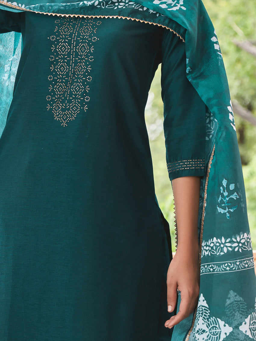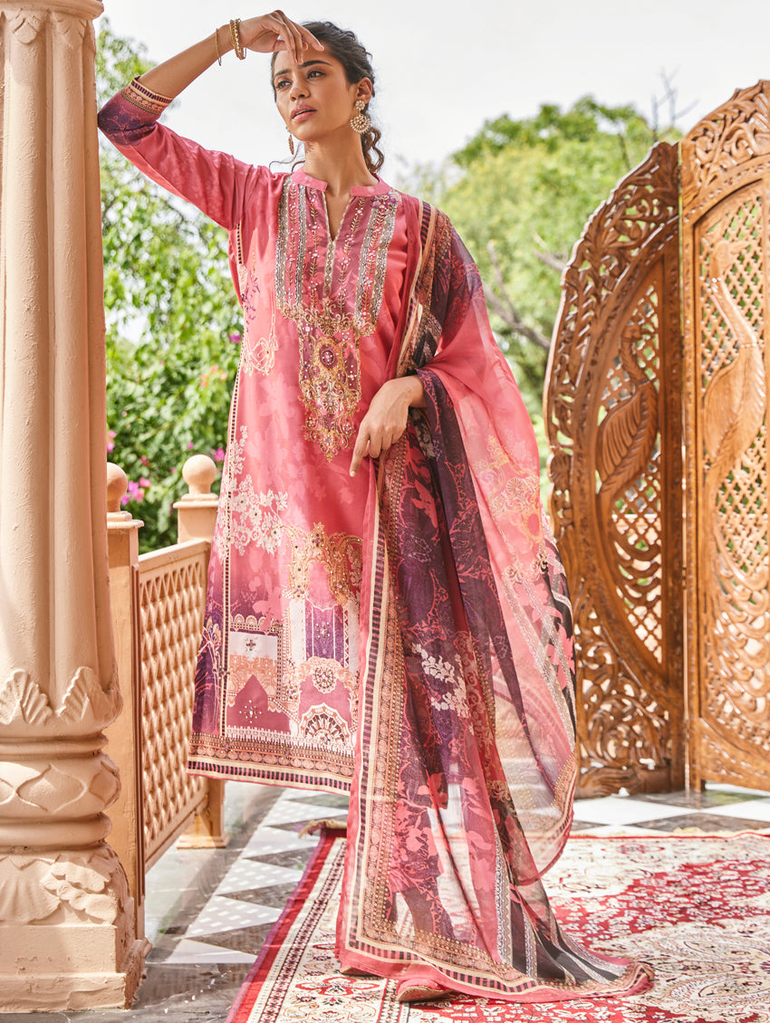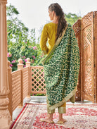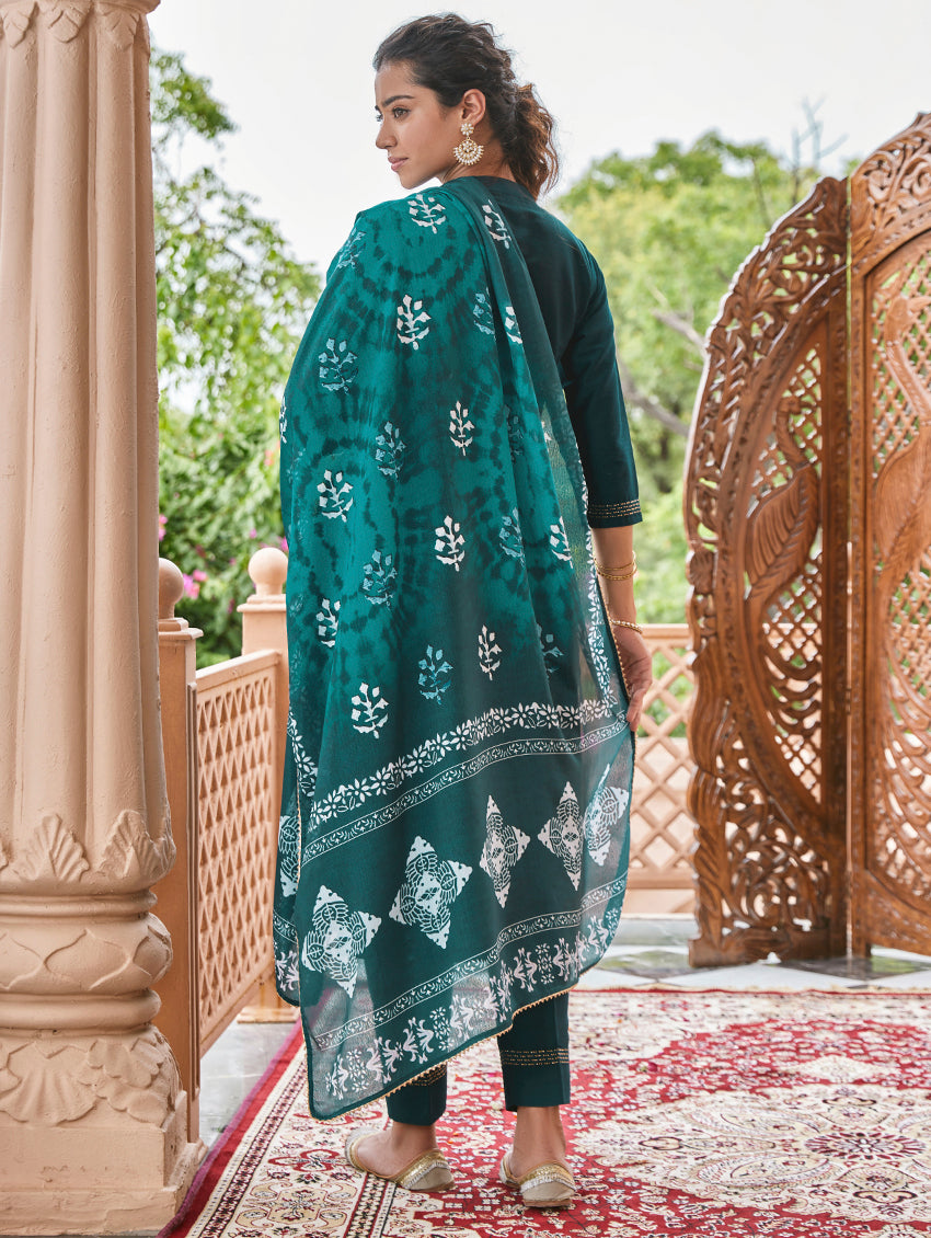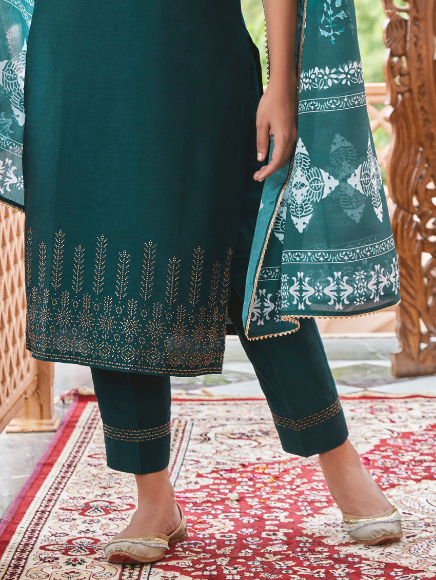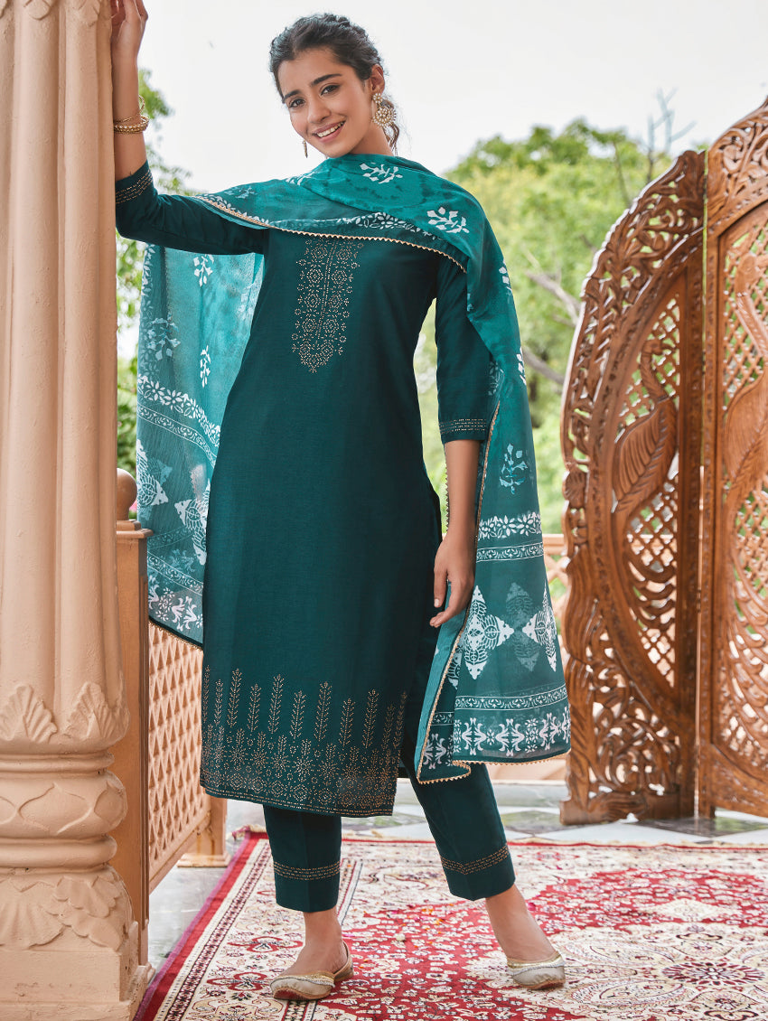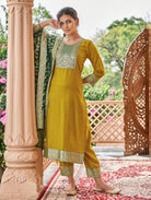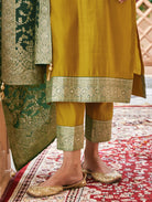 A straight-fit suit set from our latest collection. The set combines a kurta and regular pants in silk fabric and a jacquard weave silk dupatta. Kurta comes accentuated with hand embroidery on the jacquard weave silk yoke.