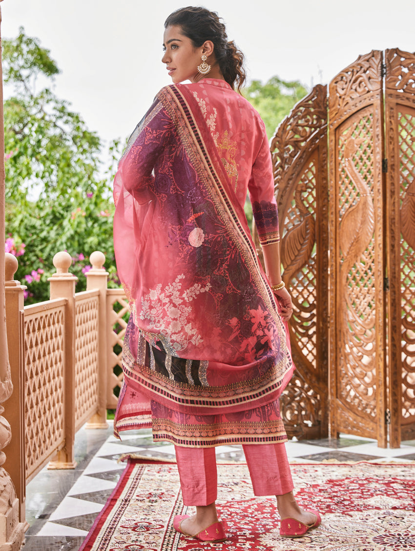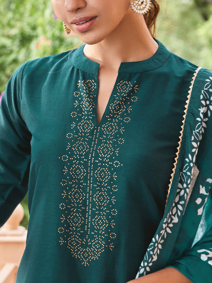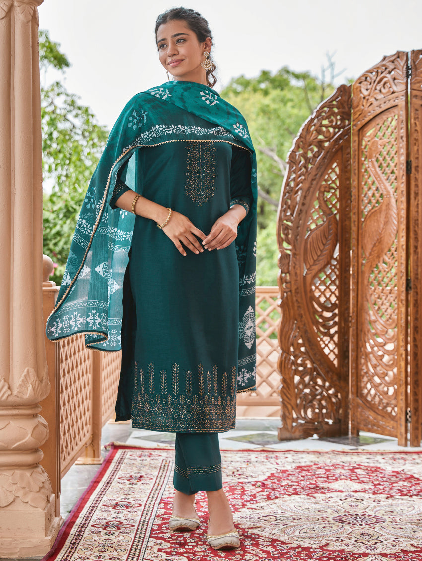 * Solid-coloured kurta with pants and jacquard weave silk dupatta