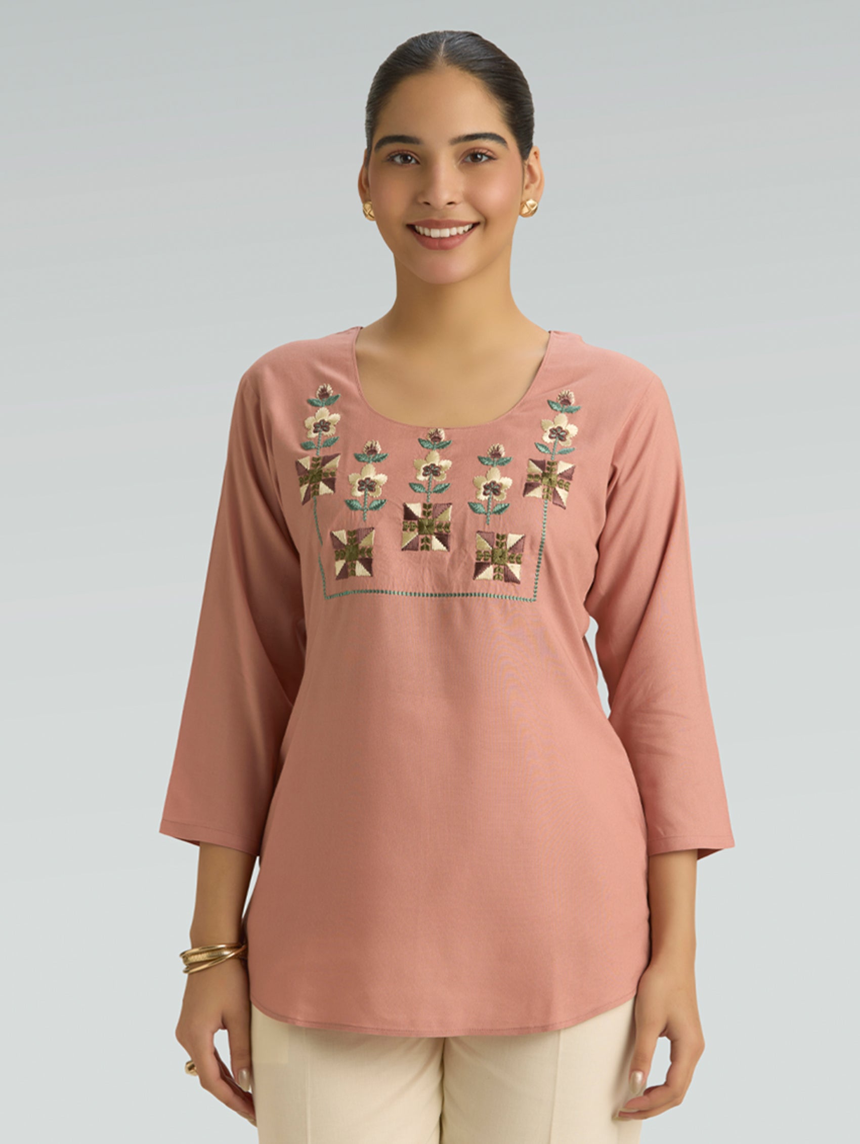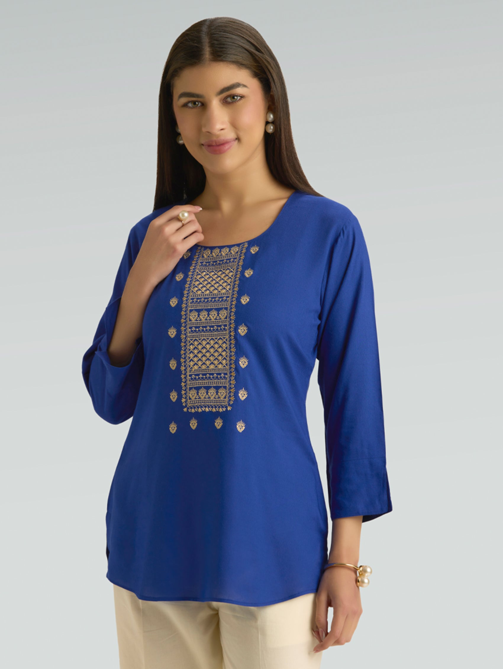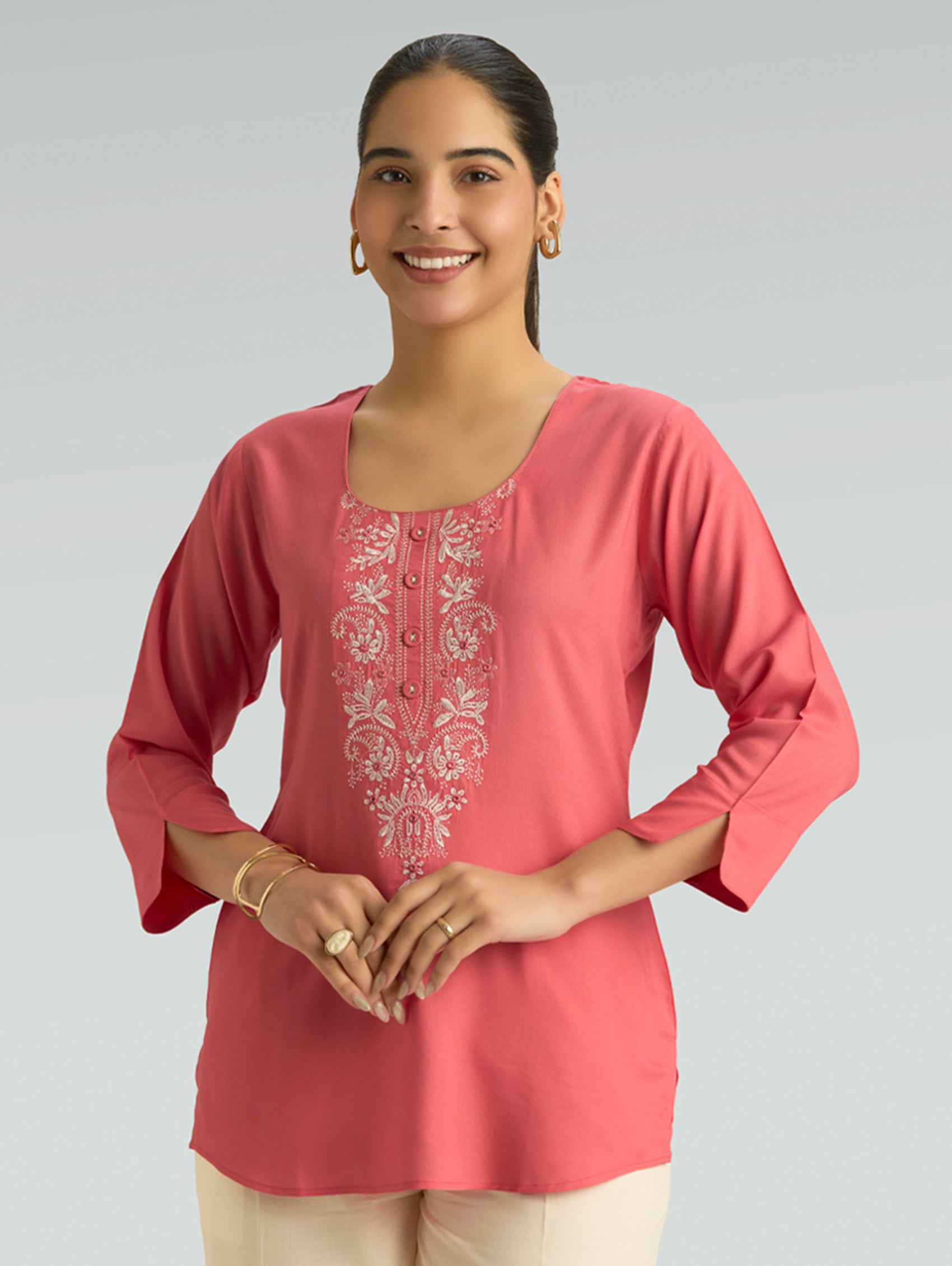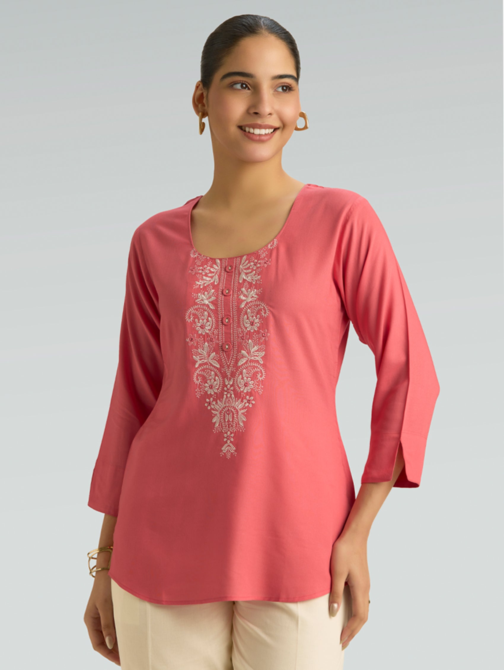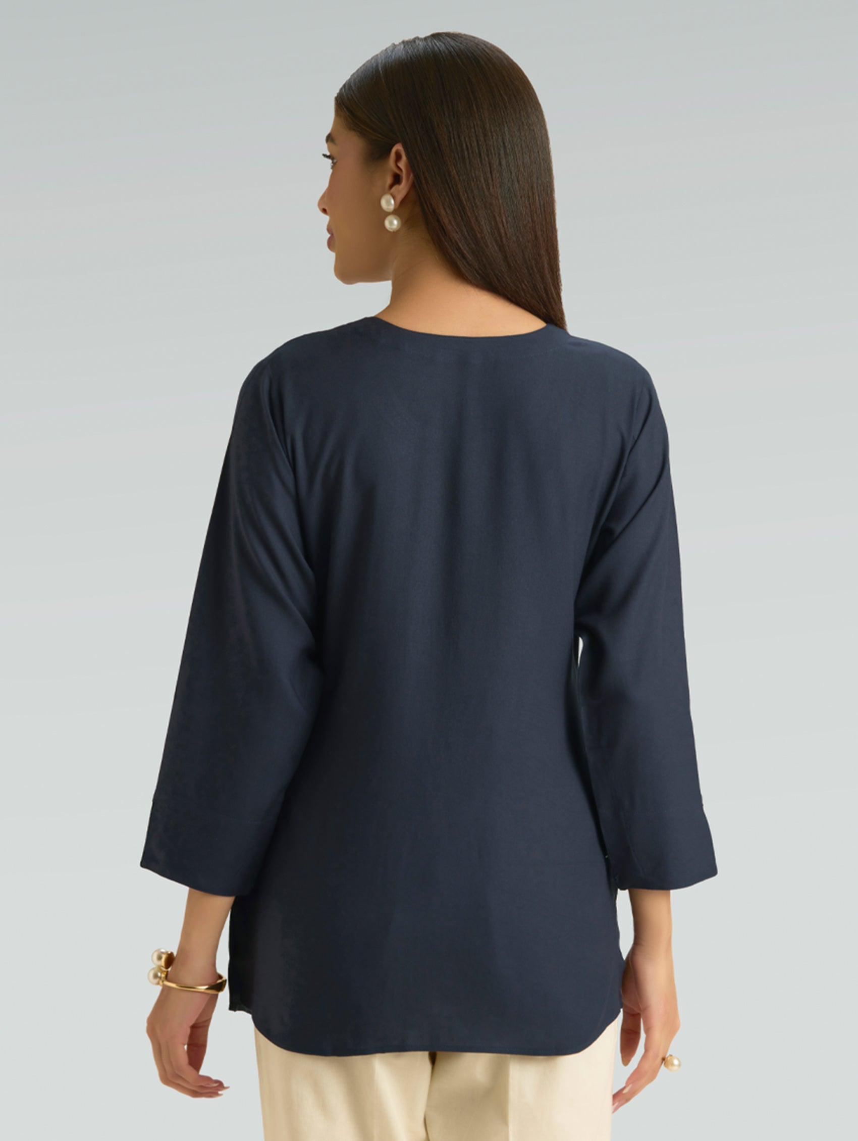 • Tunic with a keyhole round neckline, and three-fourth sleeves.