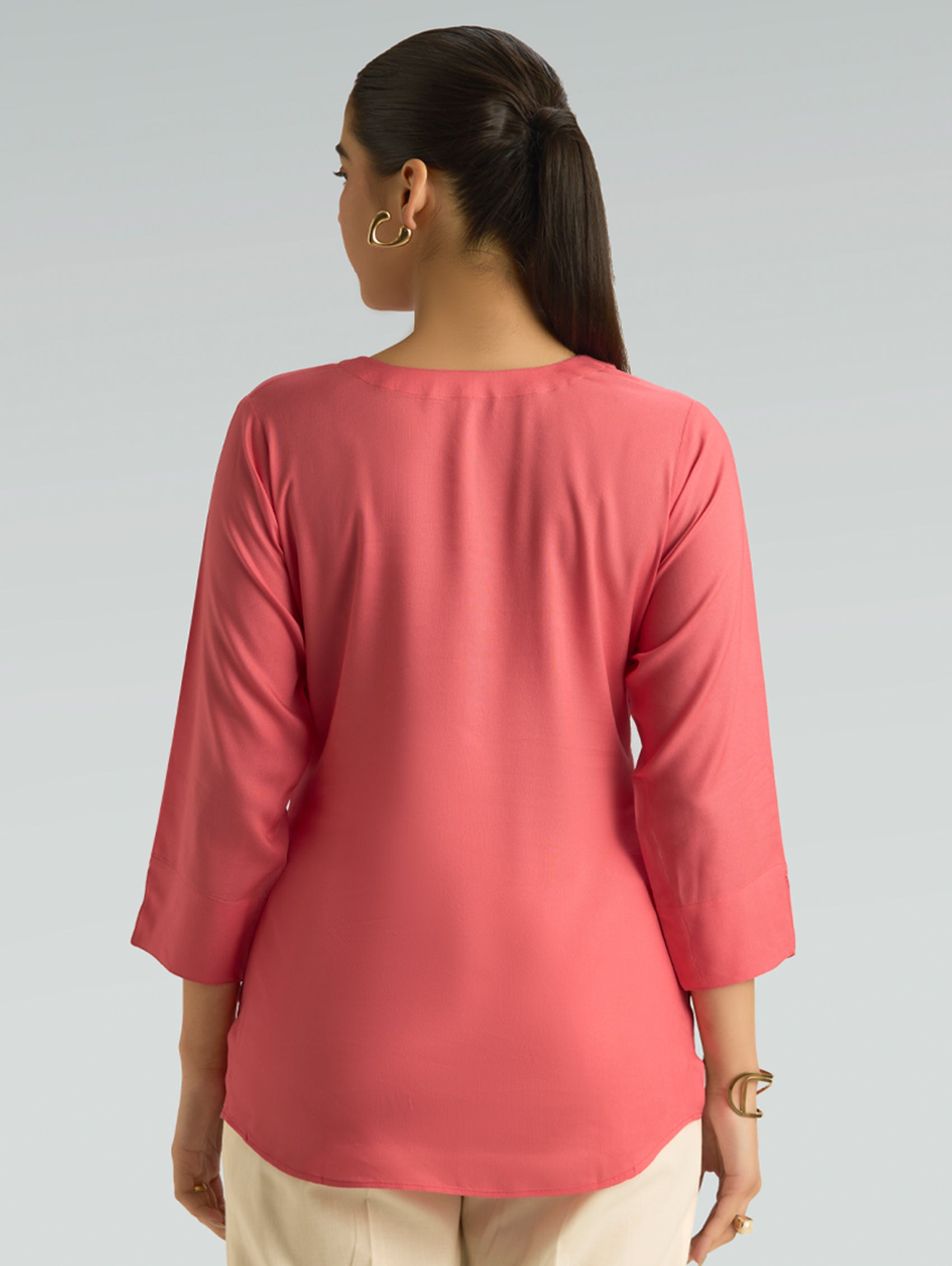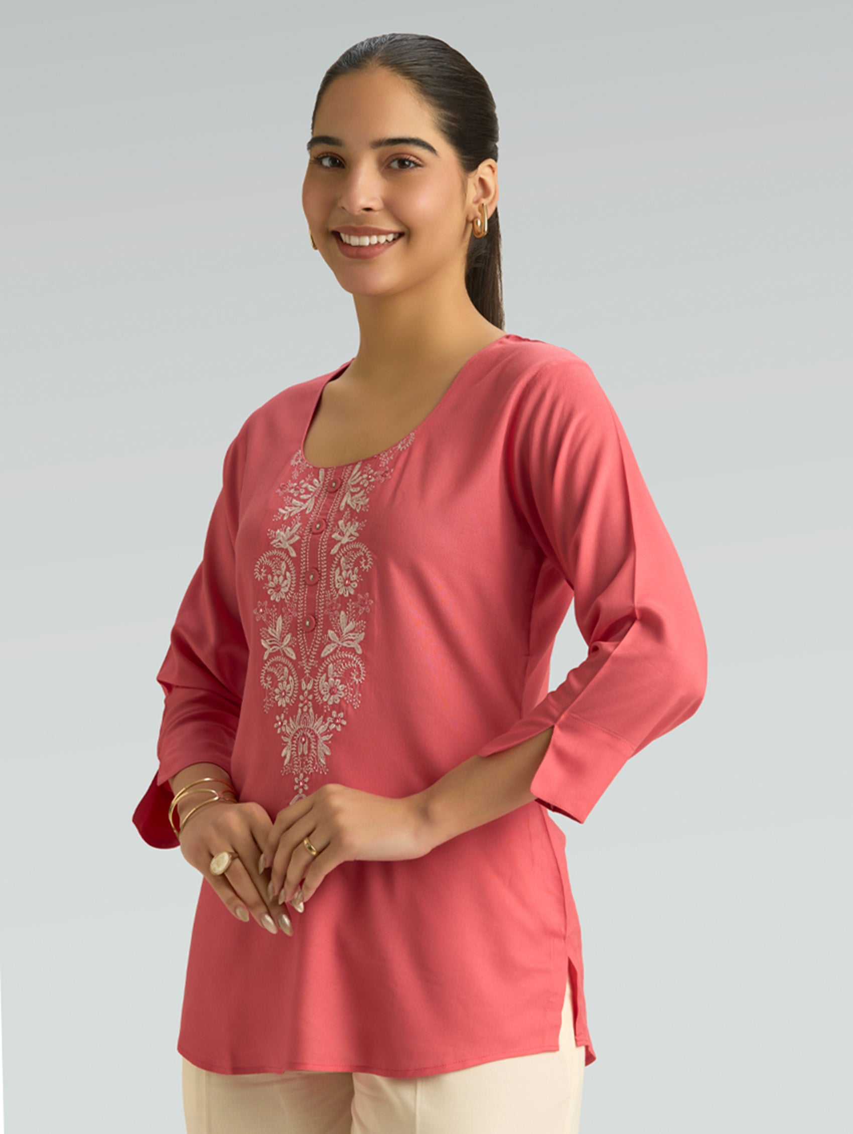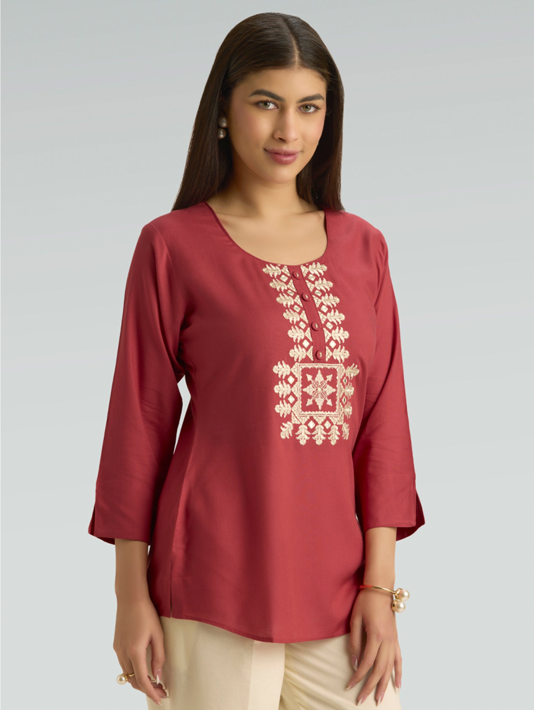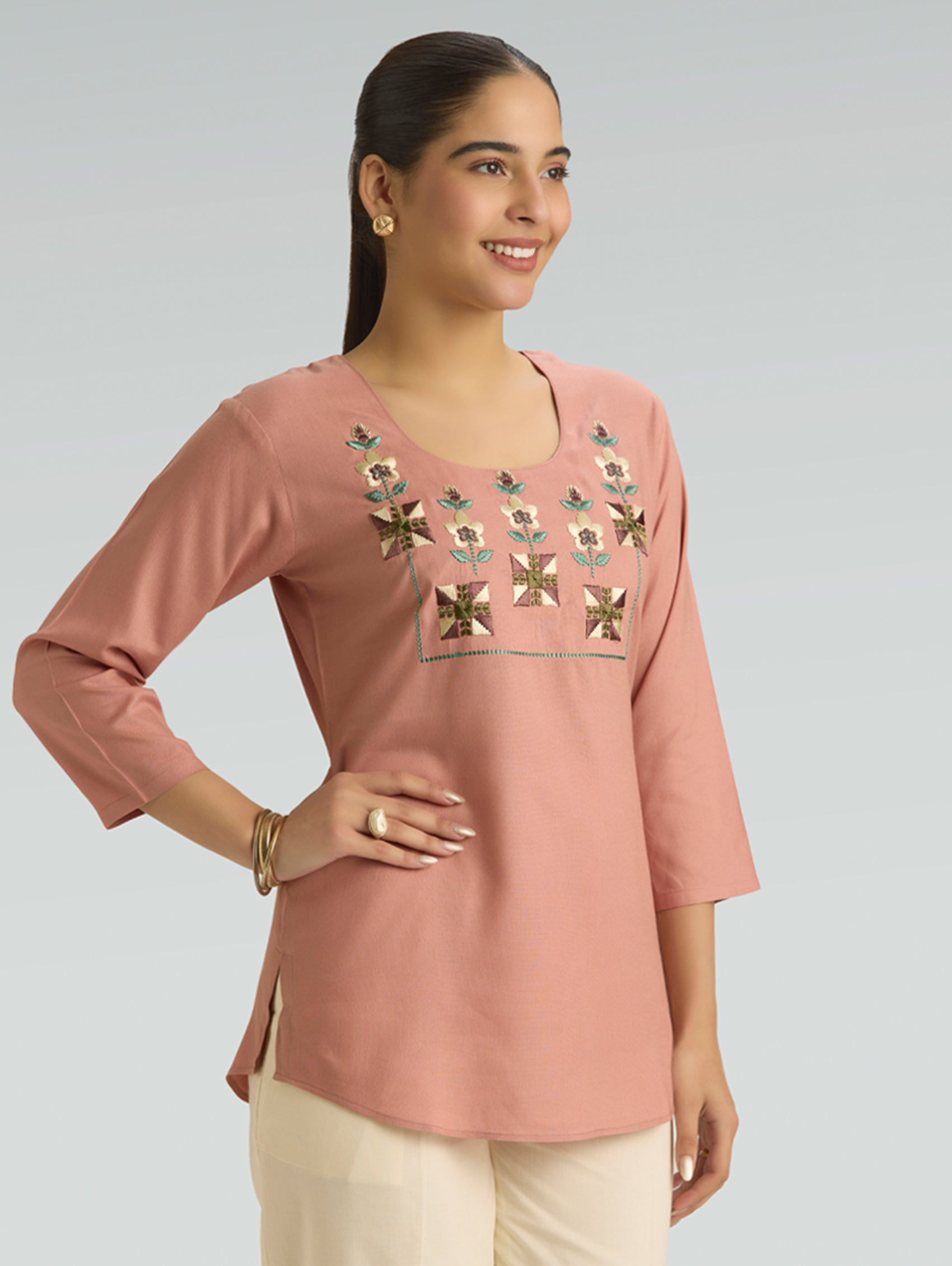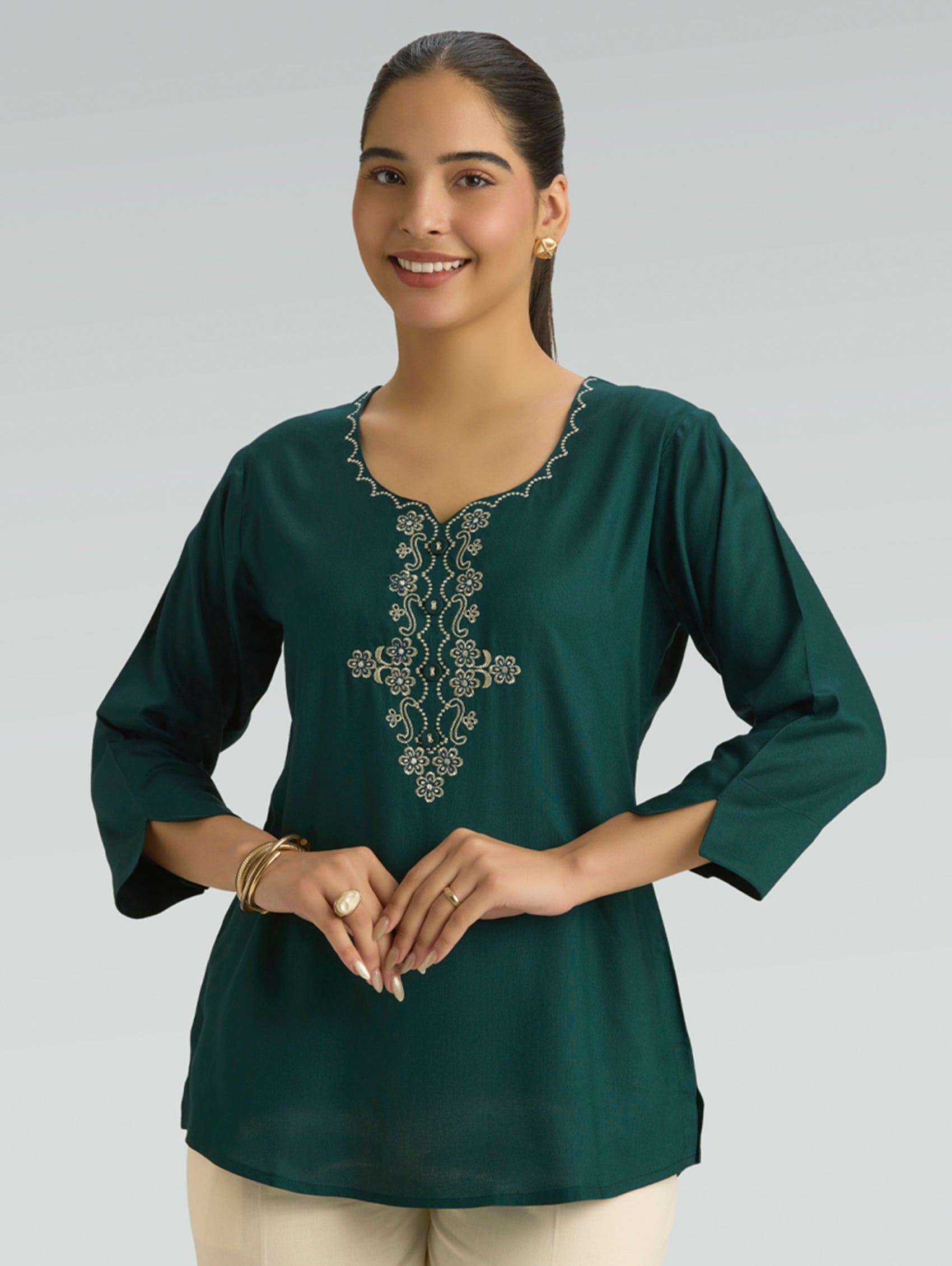• Tunic with a keyhole round neckline, and three-fourth sleeves.