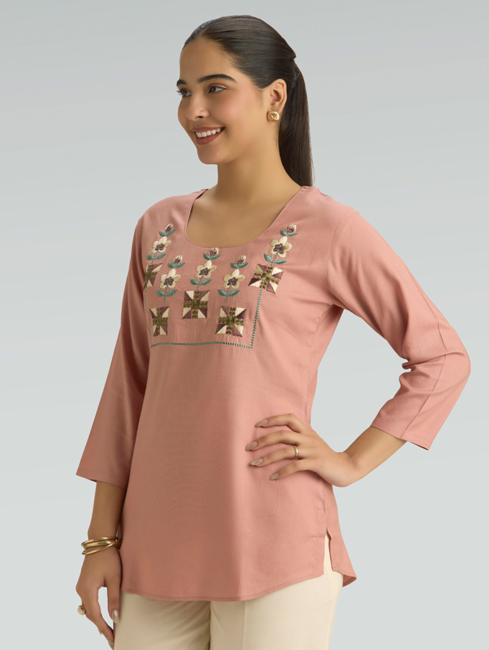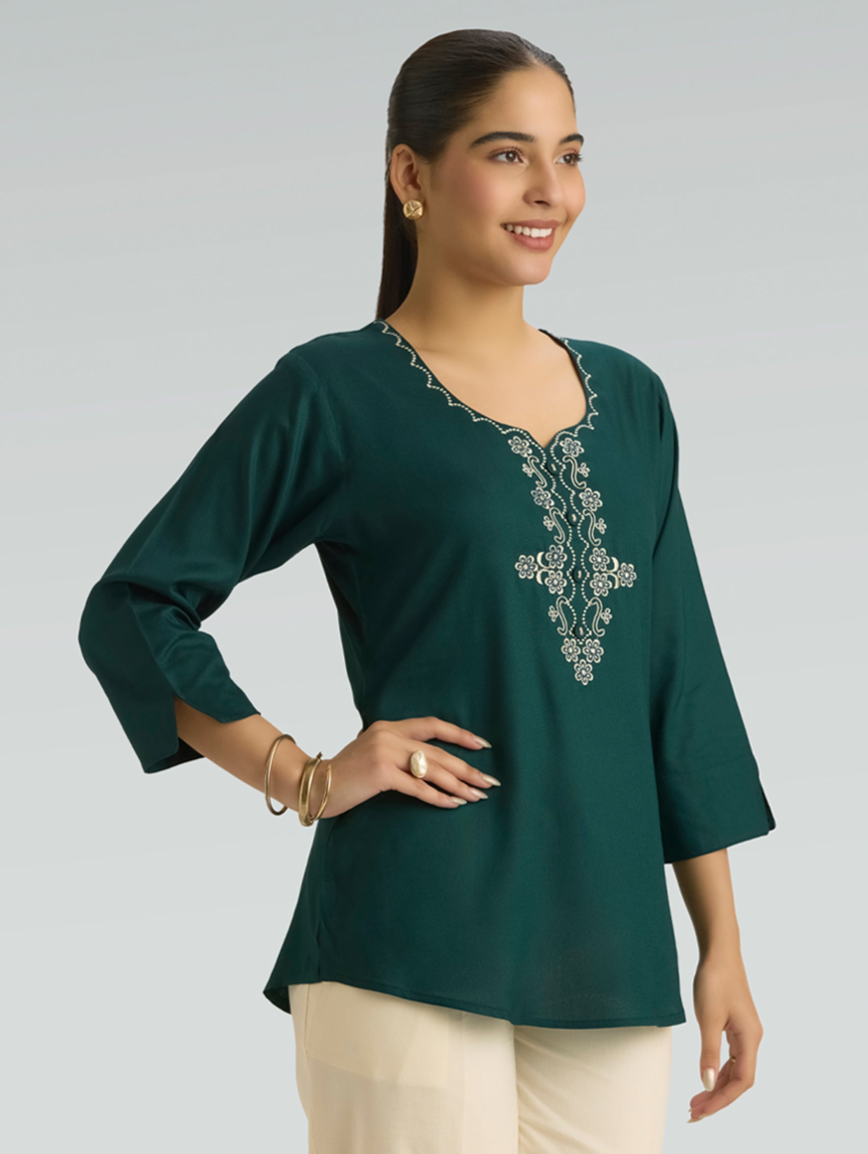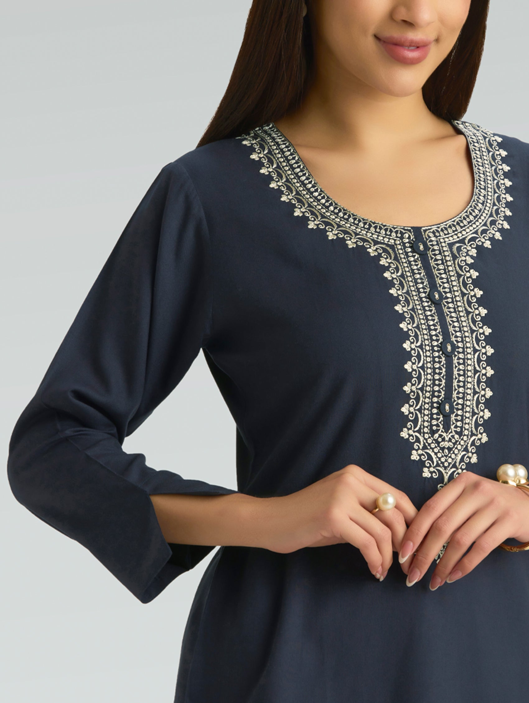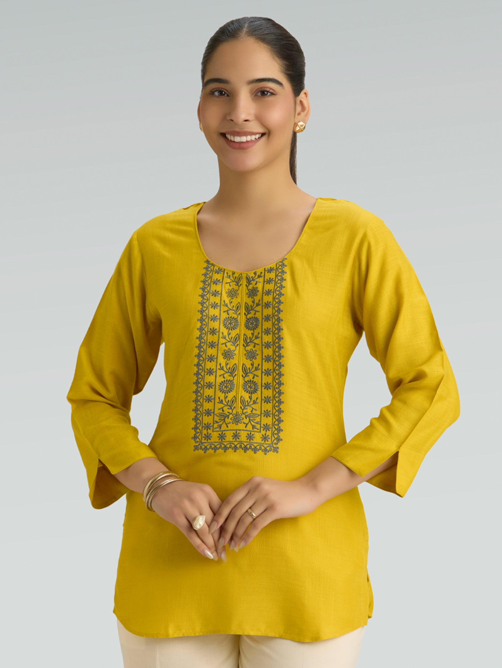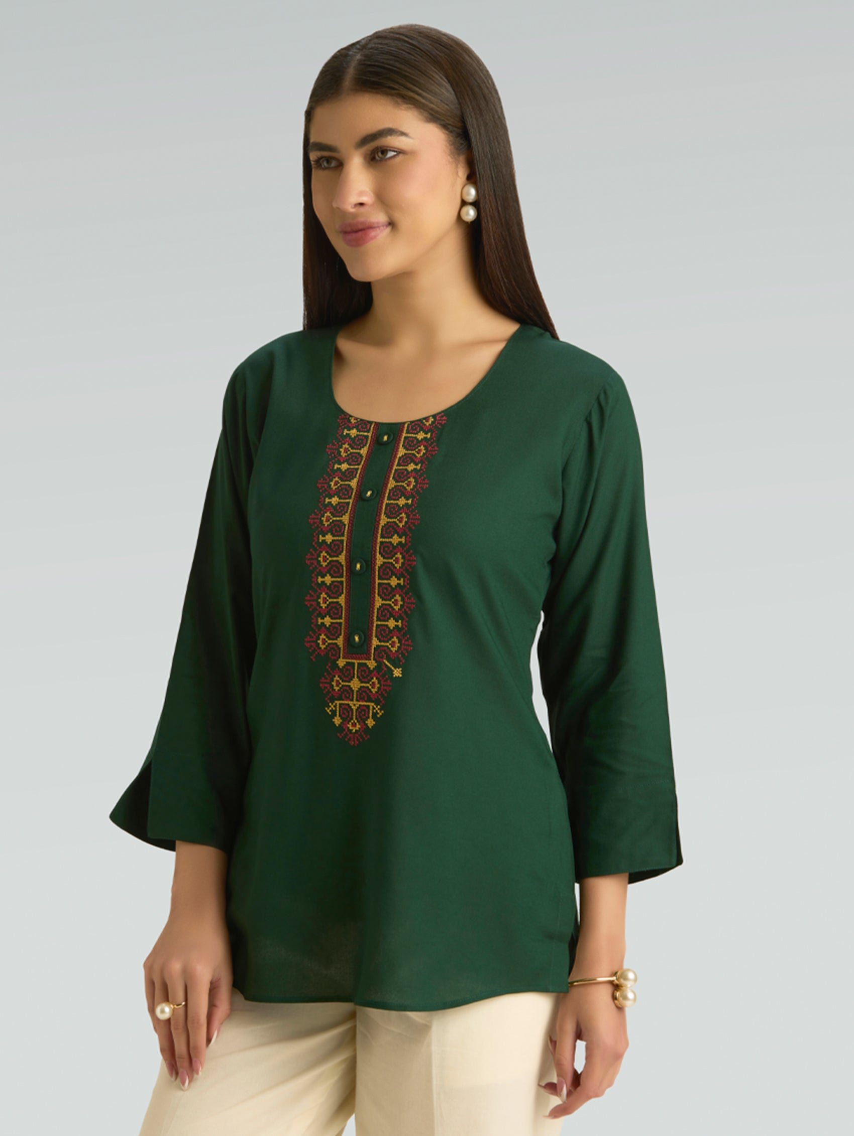 • Tunic with a keyhole round neckline, and three-fourth sleeves.