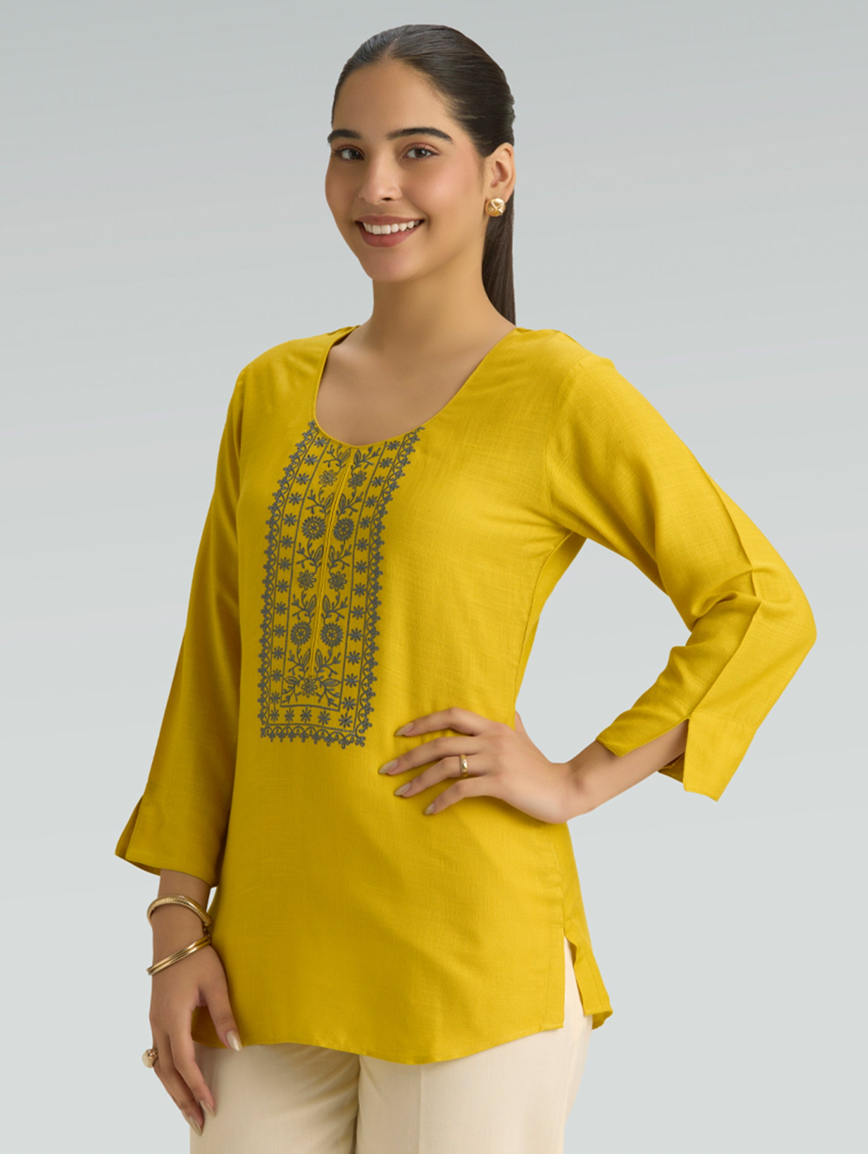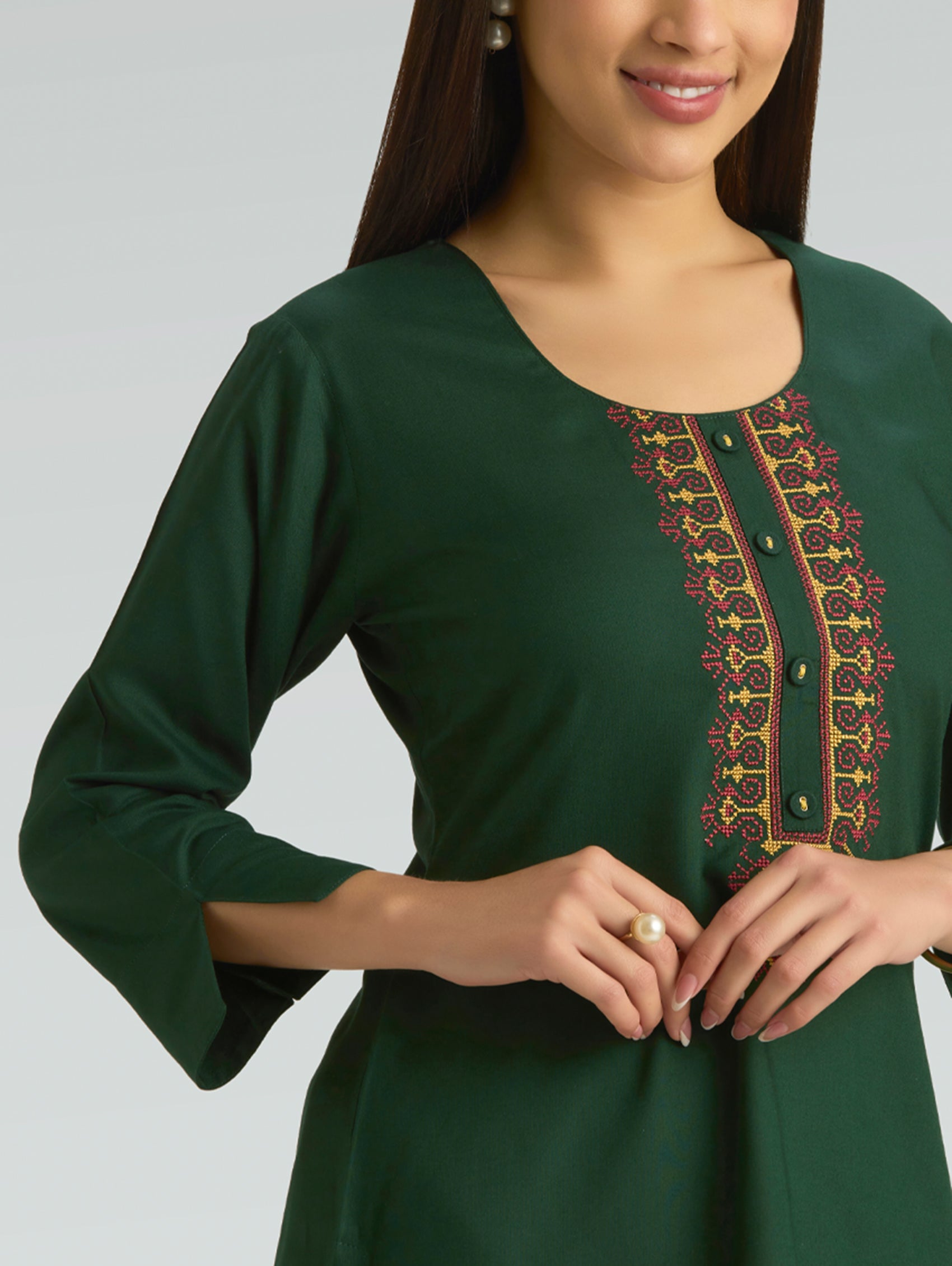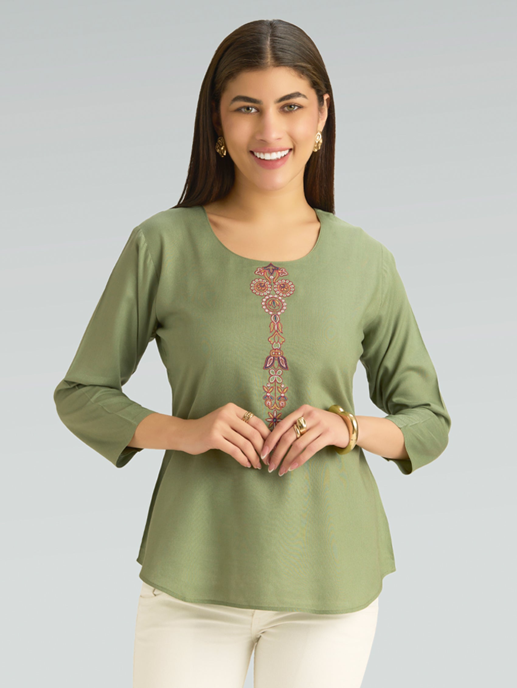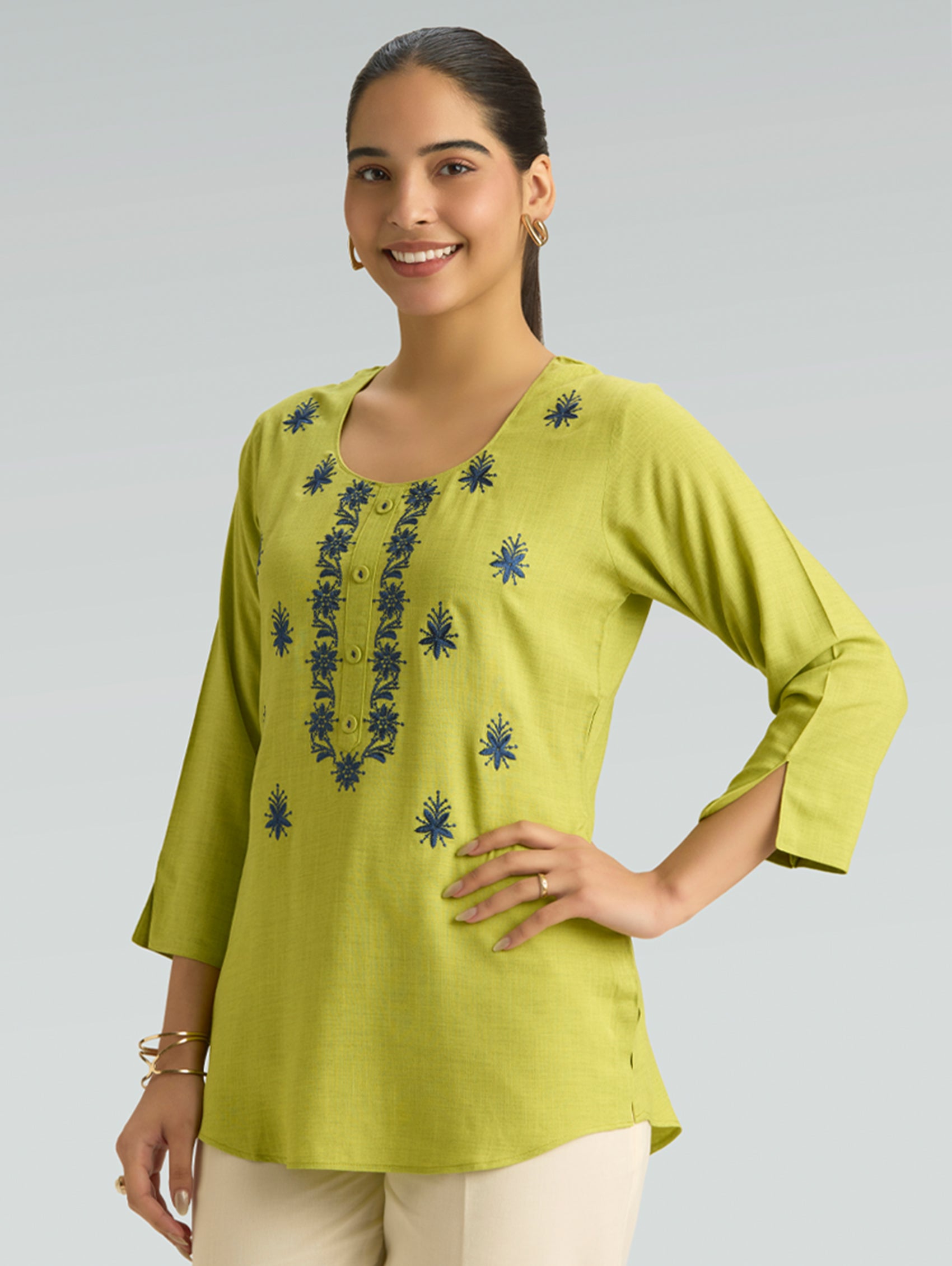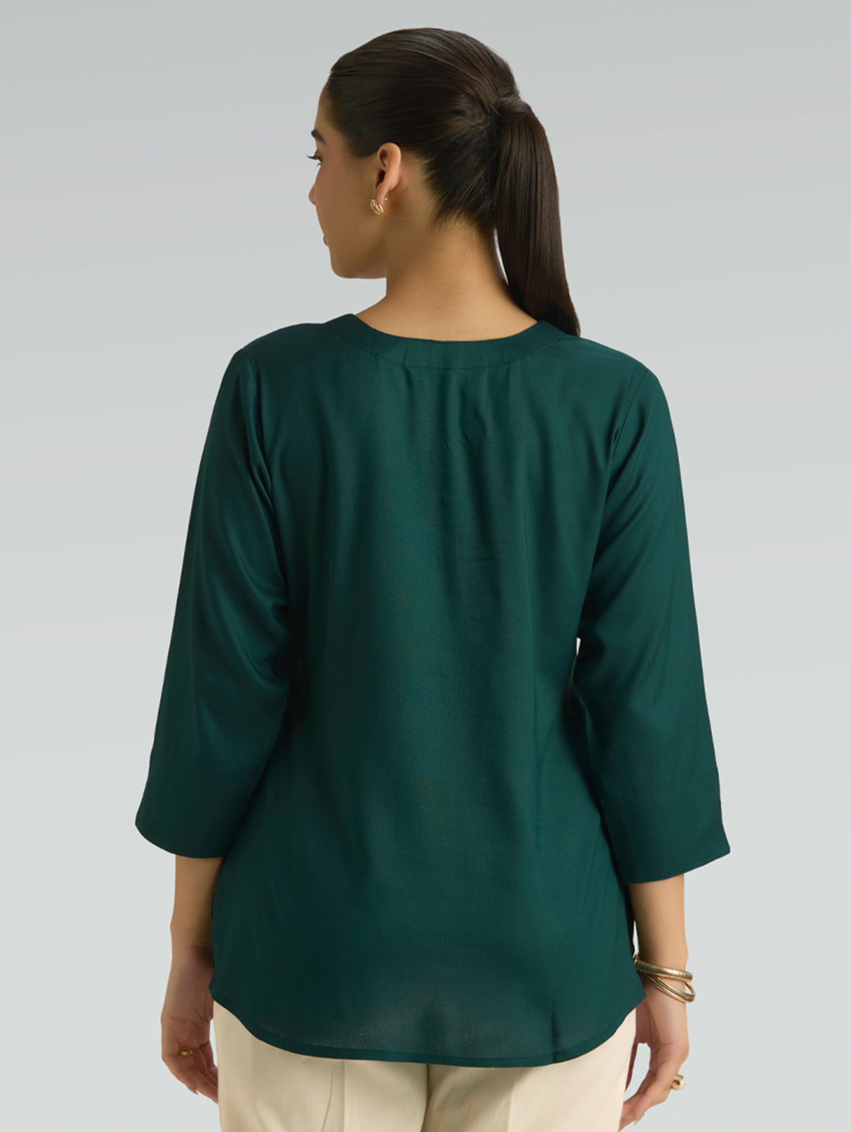 • Tunic with a keyhole round neckline, and three-fourth sleeves.
