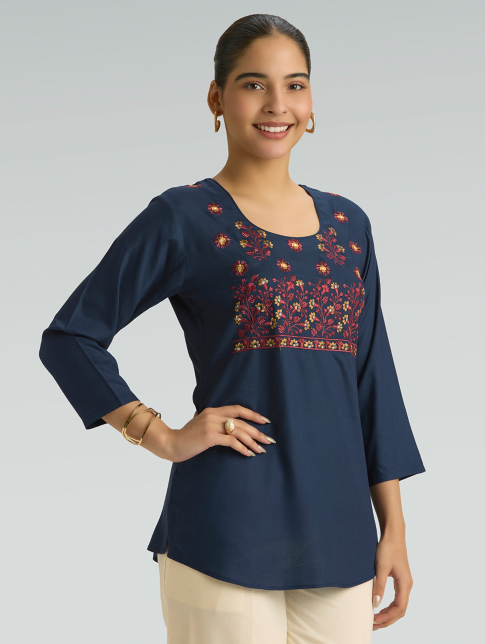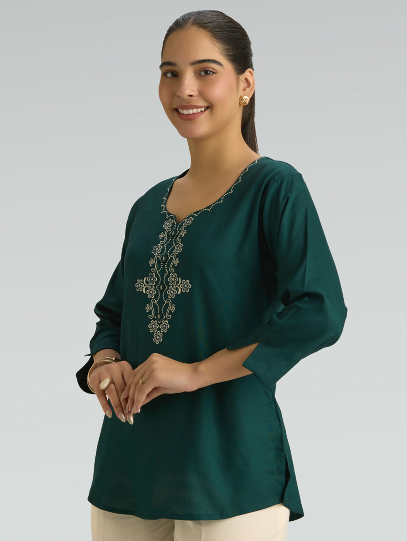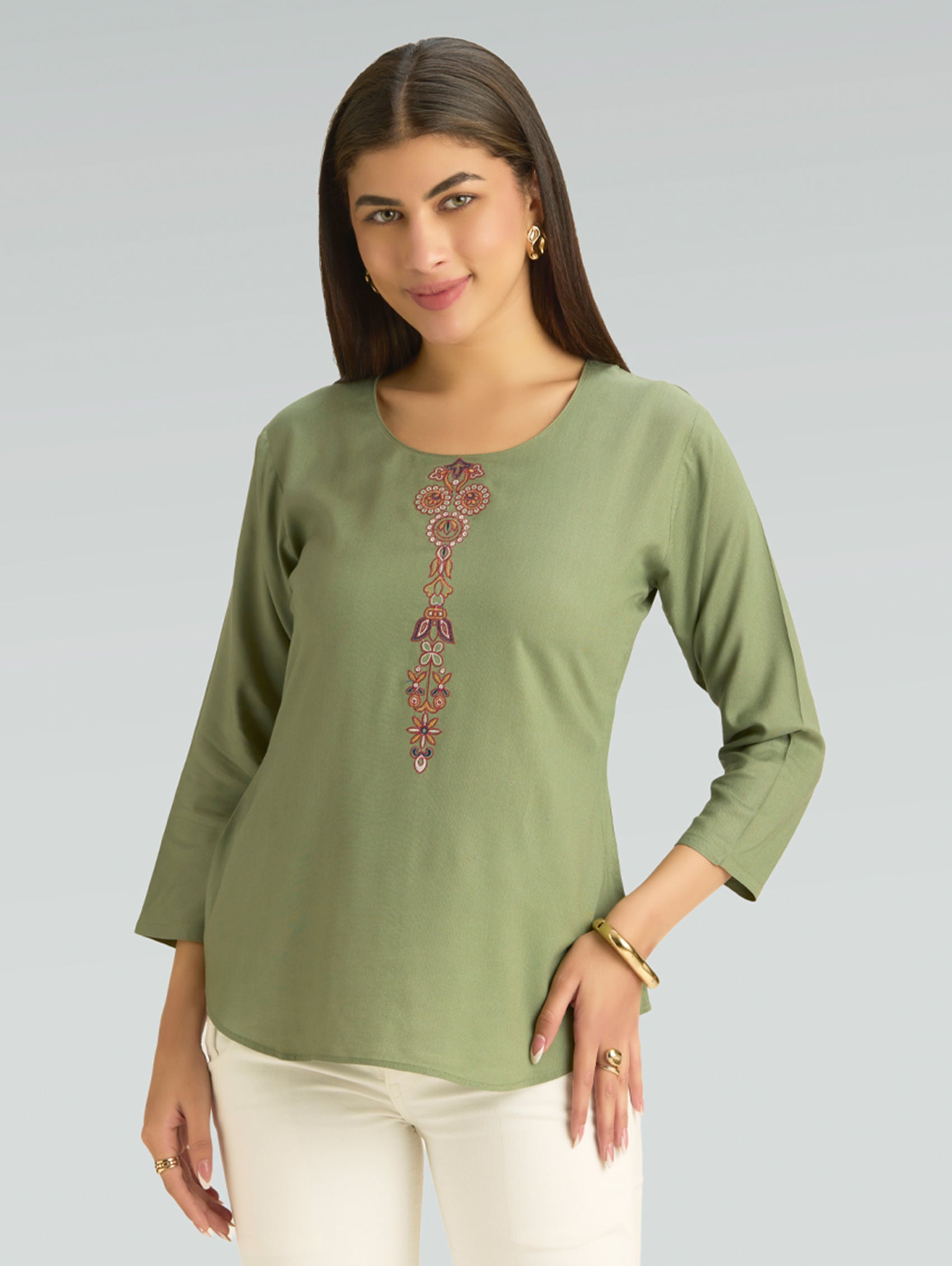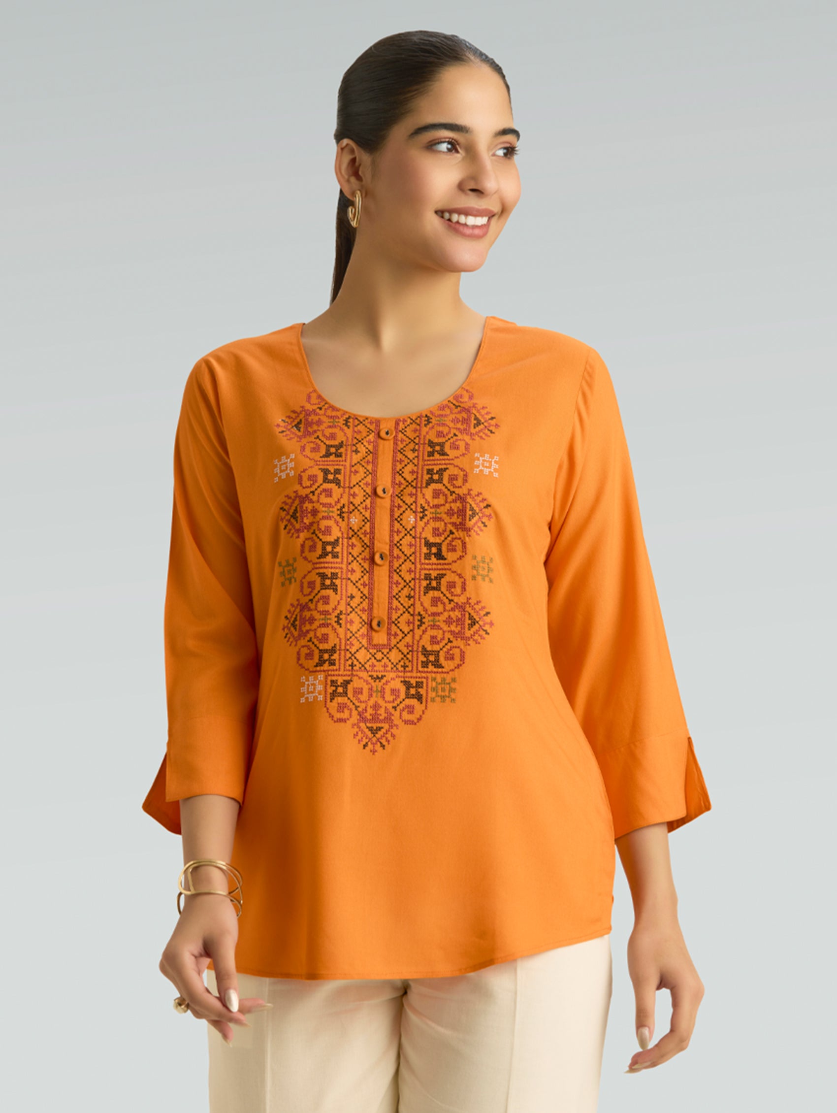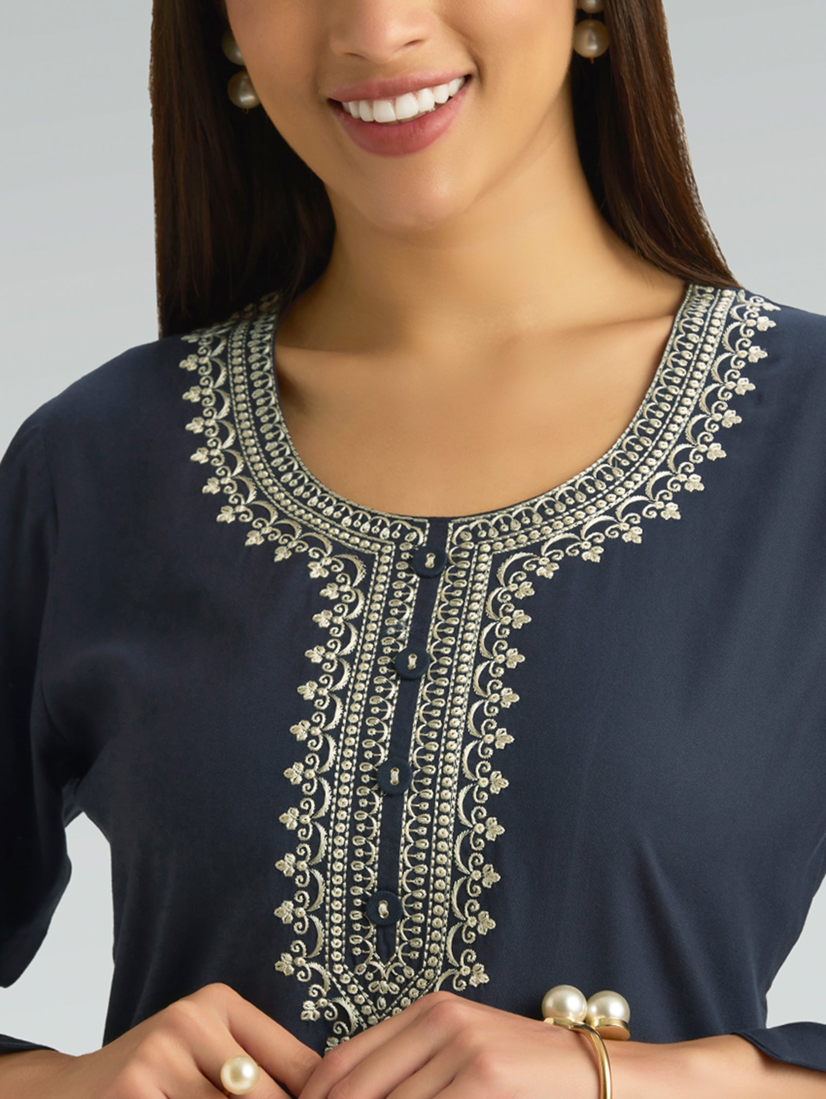 • Tunic with a keyhole round neckline, and three-fourth sleeves.