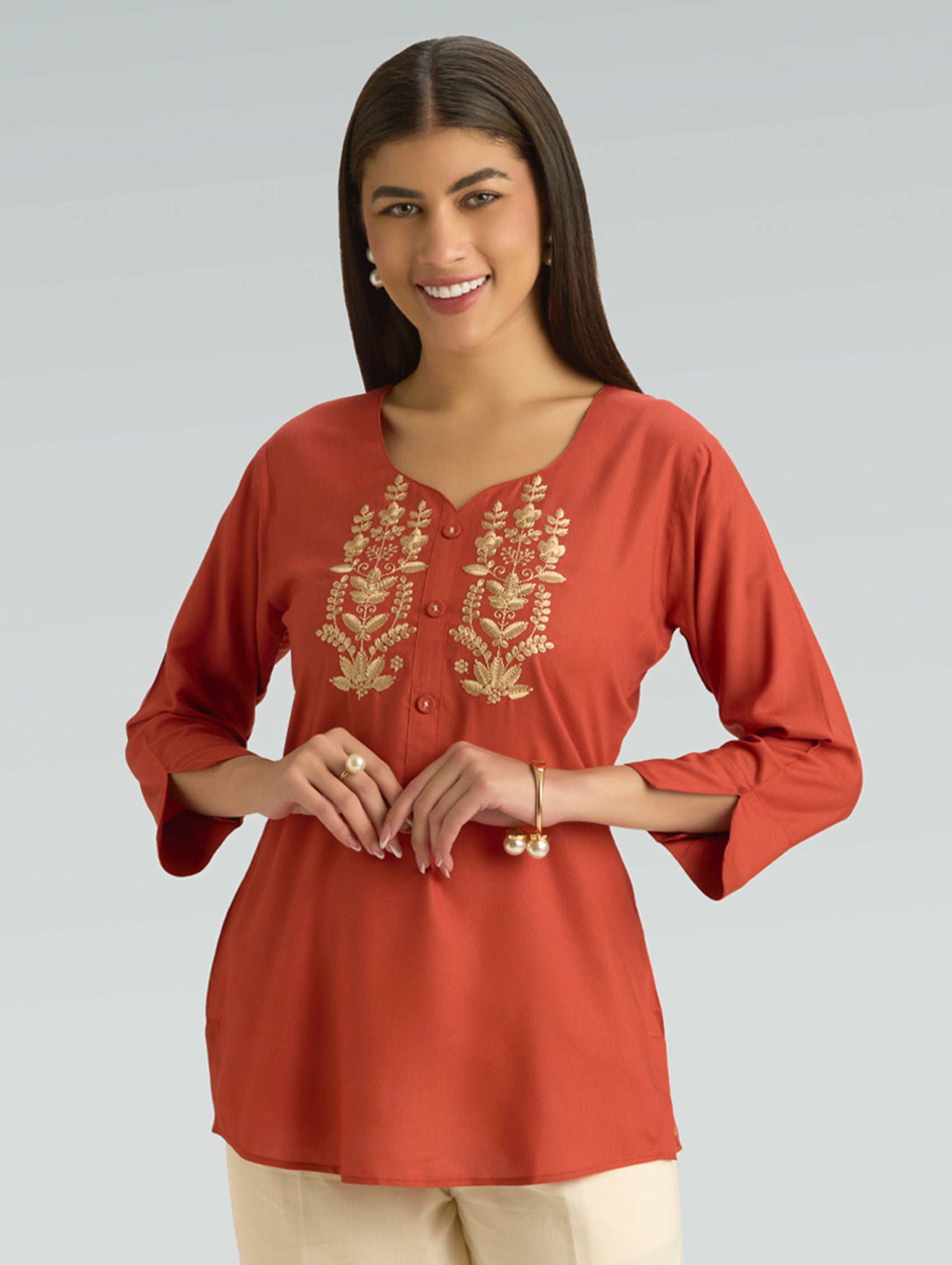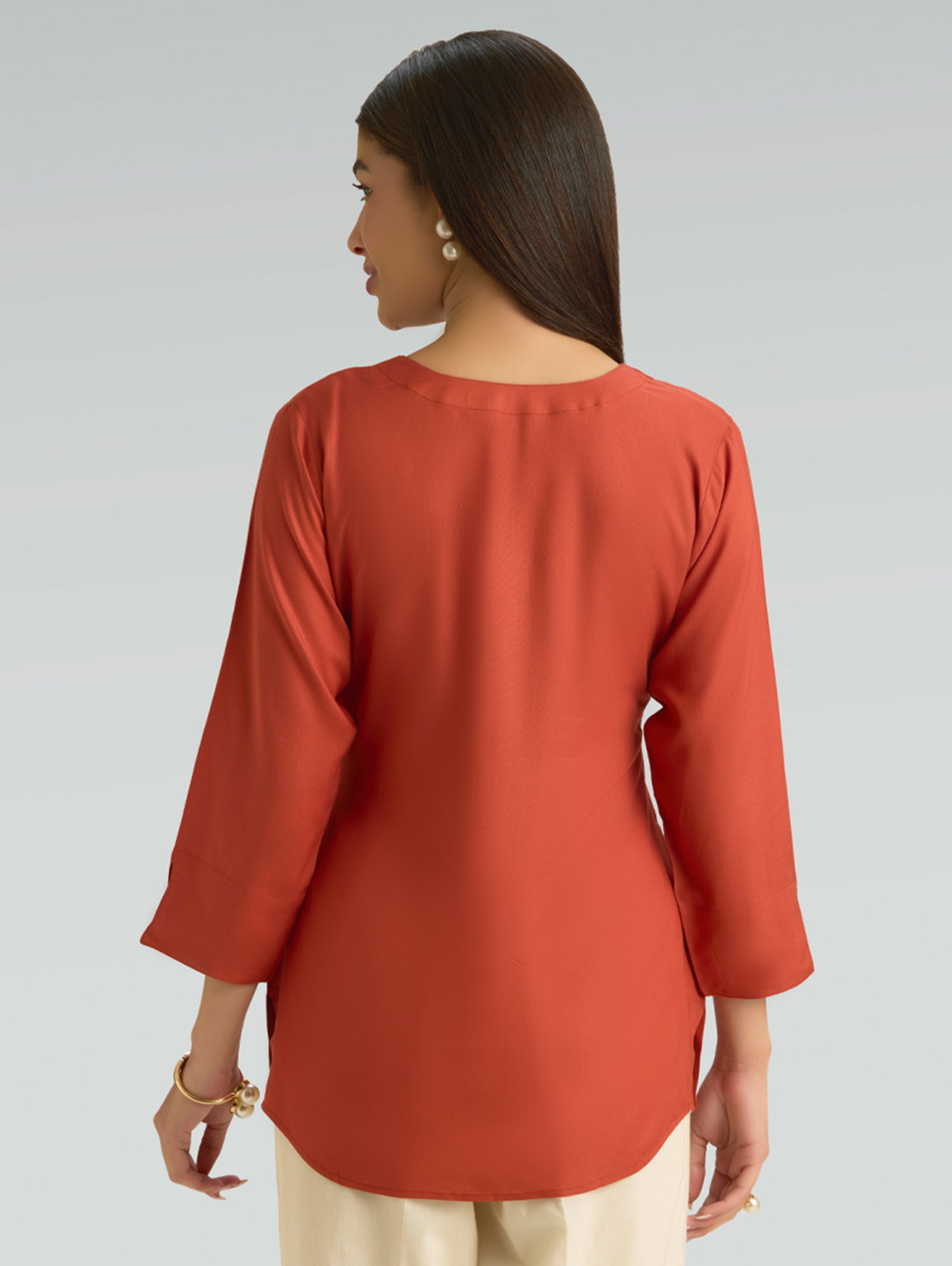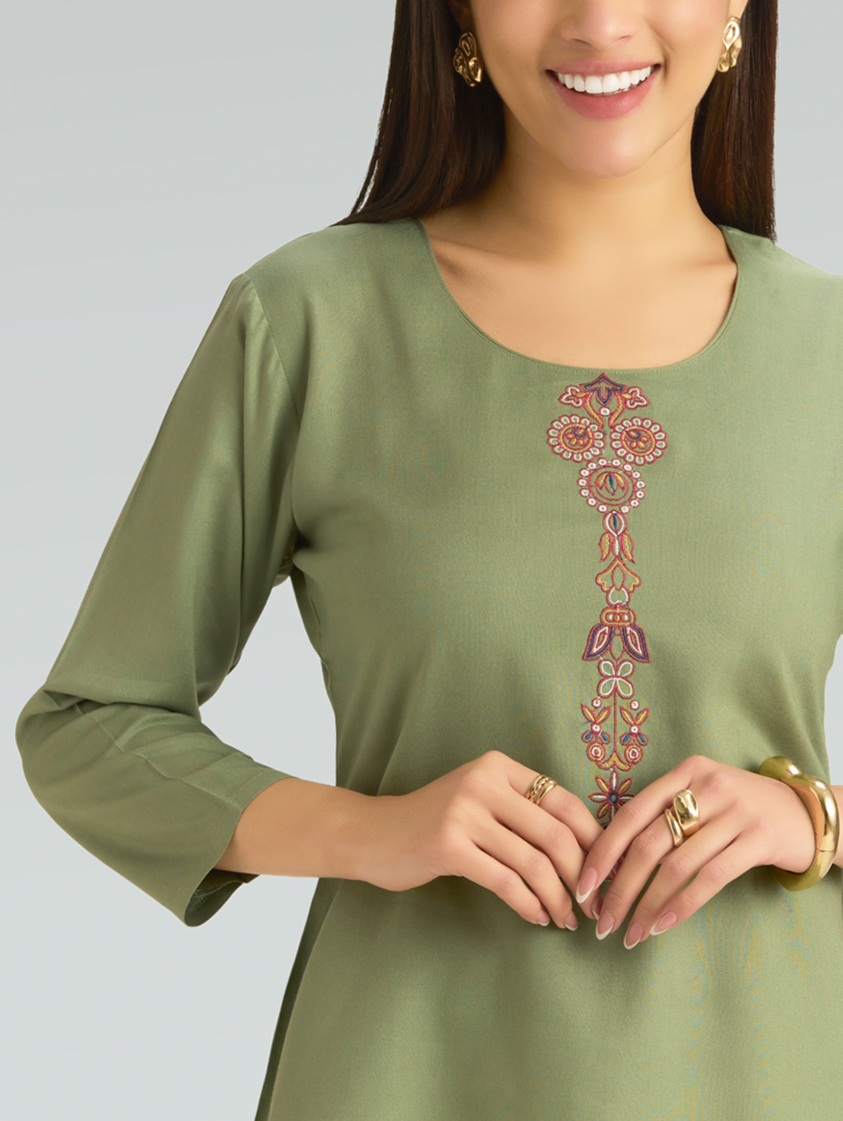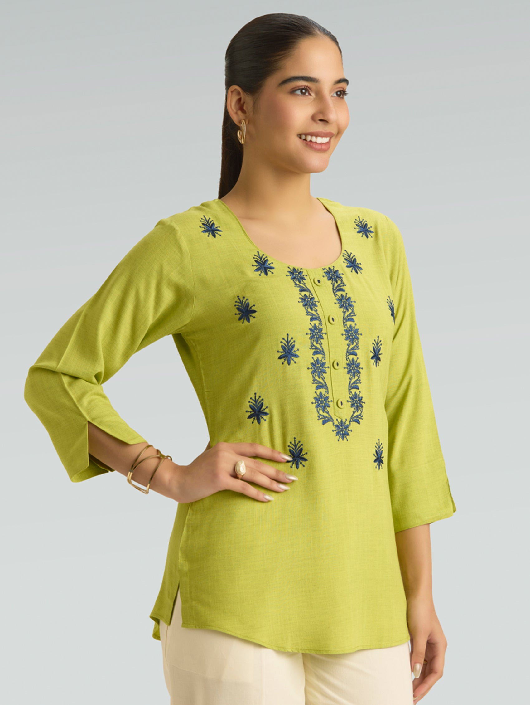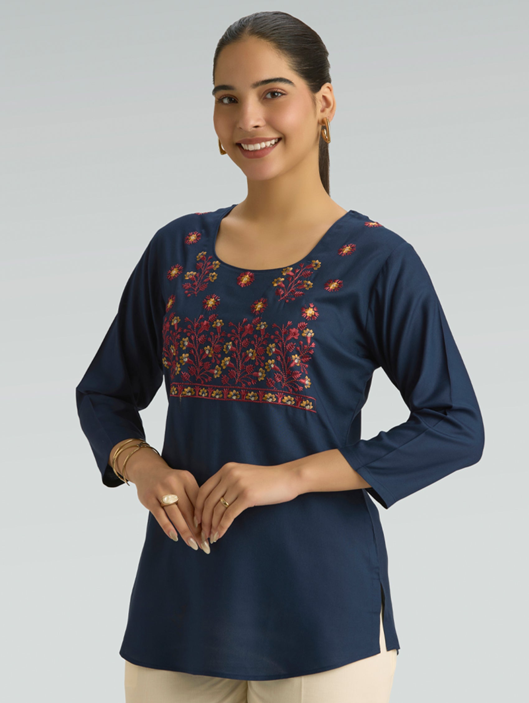 • Tunic with a keyhole round neckline, and three-fourth sleeves.