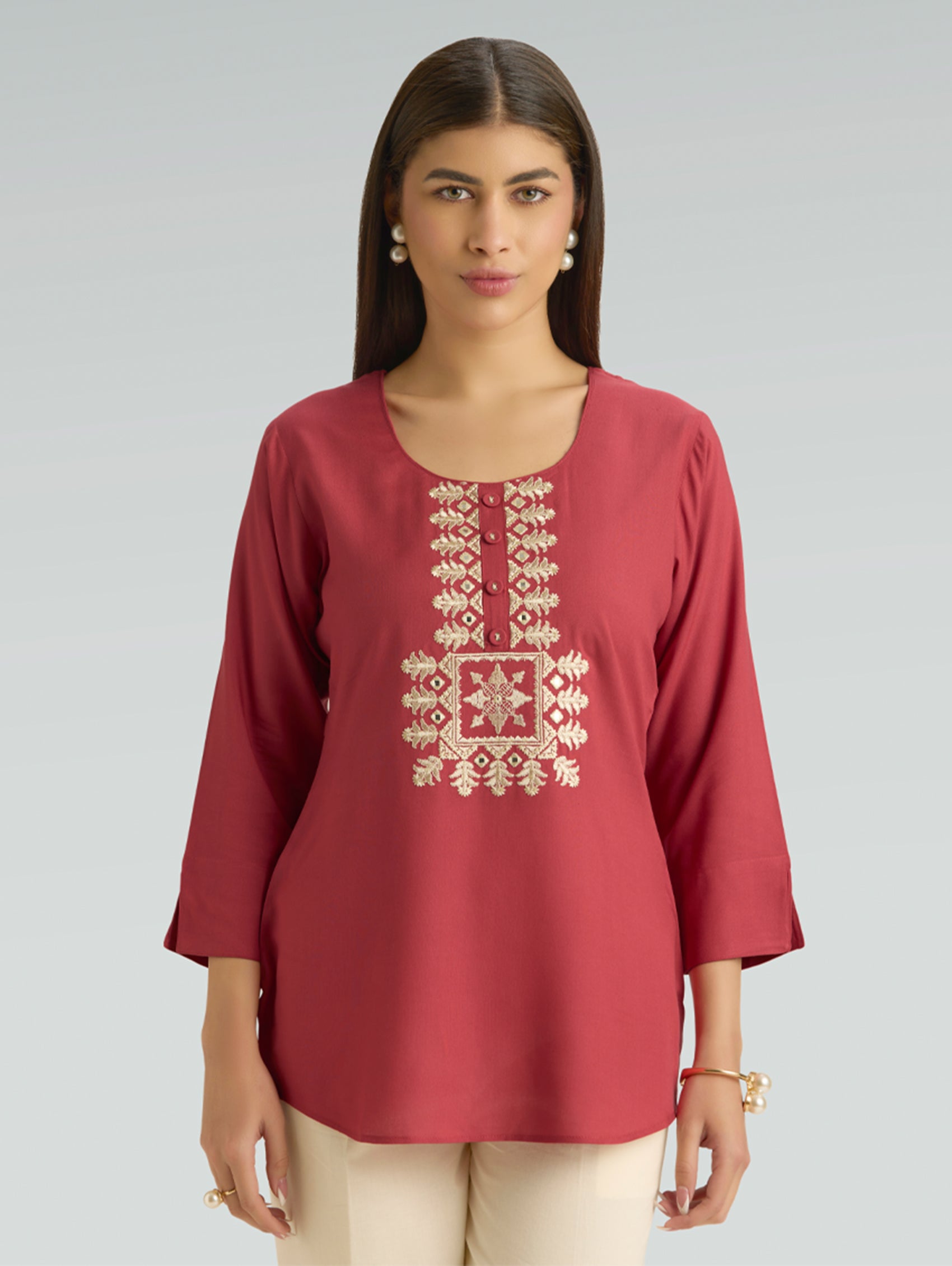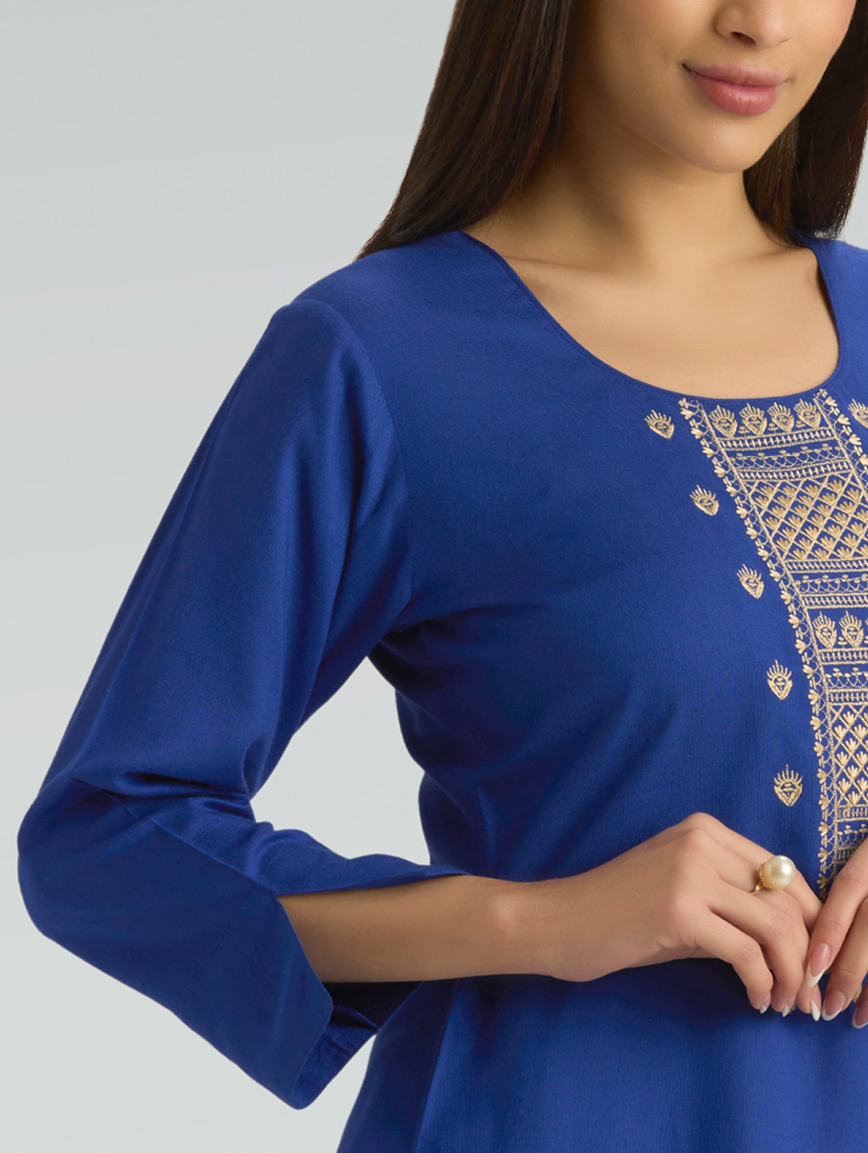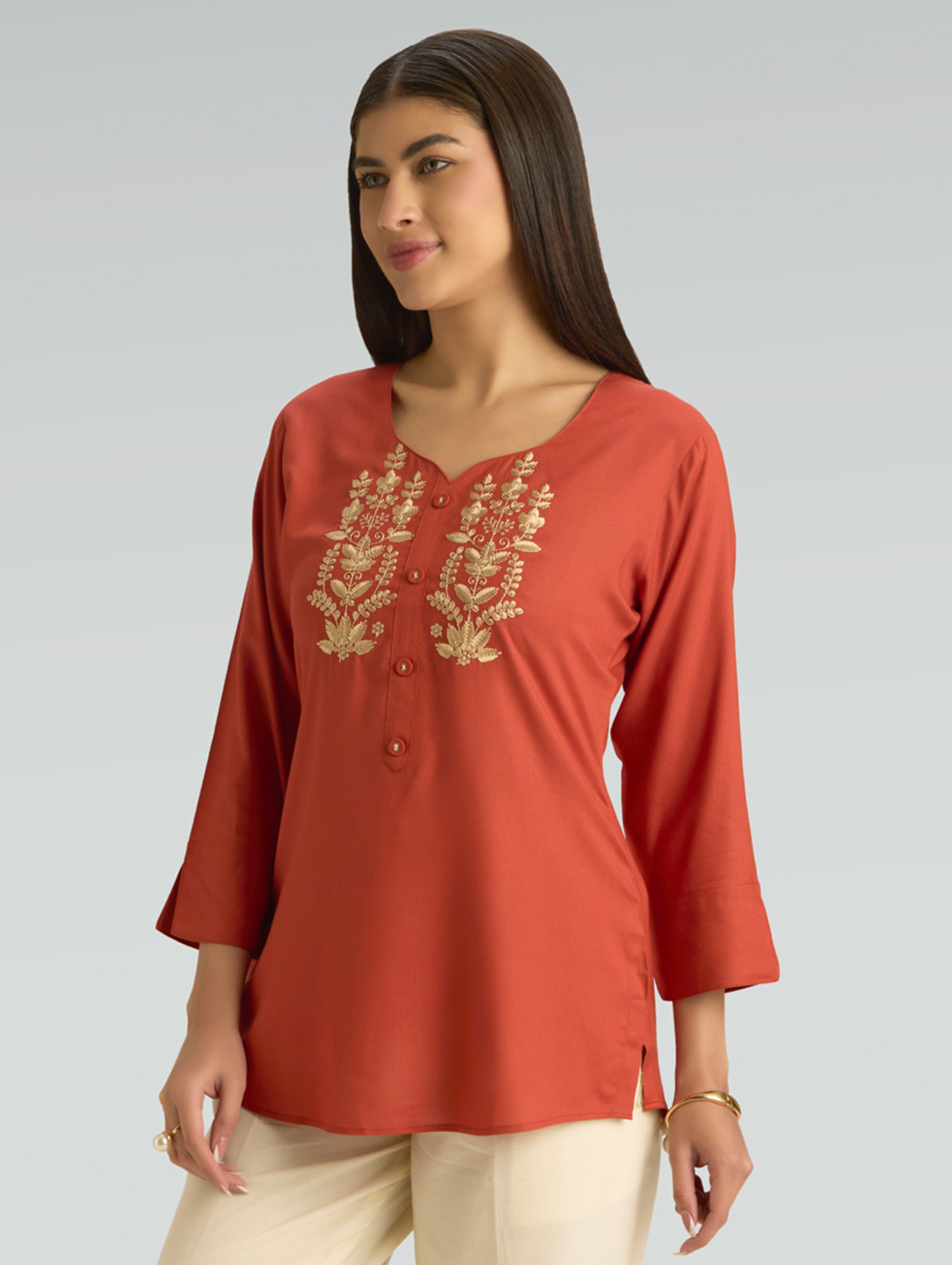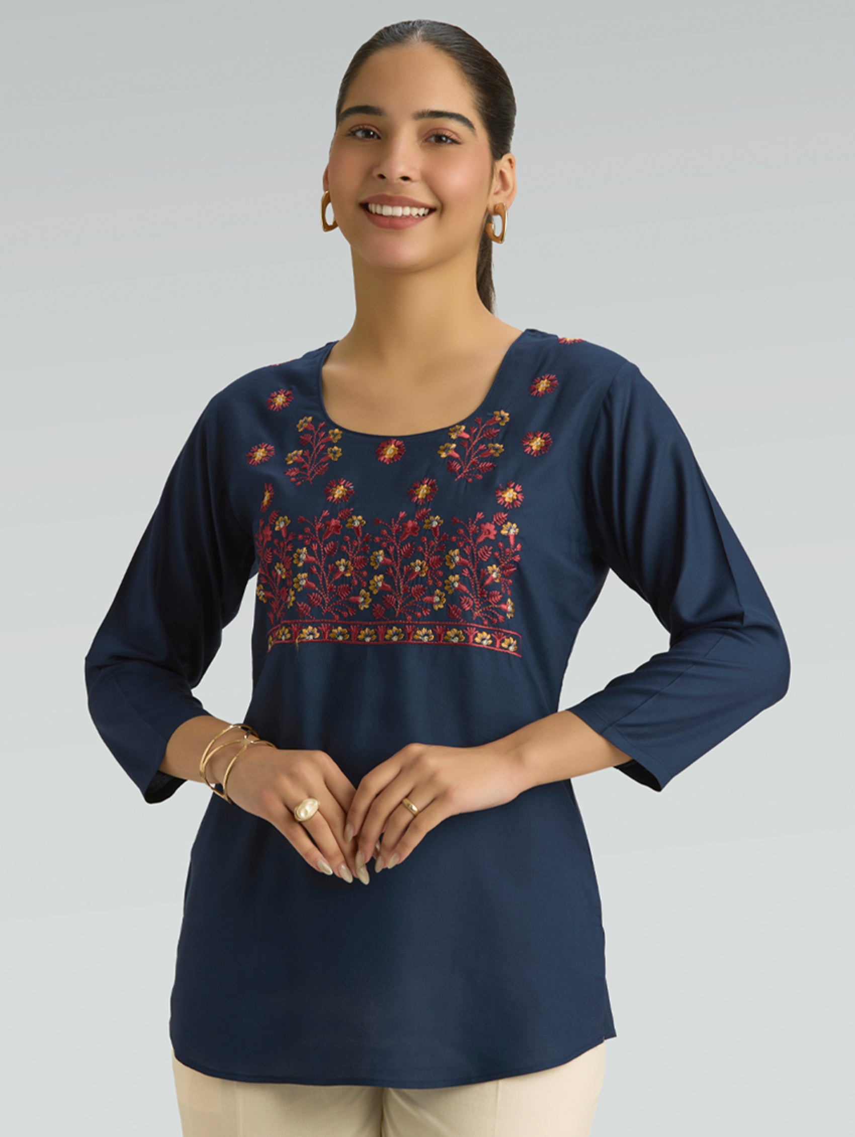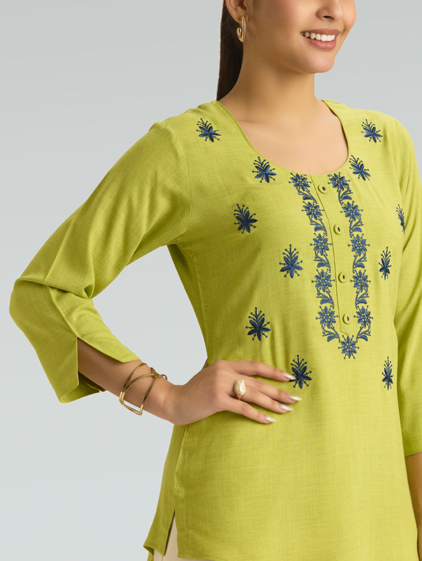 • Tunic with a keyhole round neckline, and three-fourth sleeves.