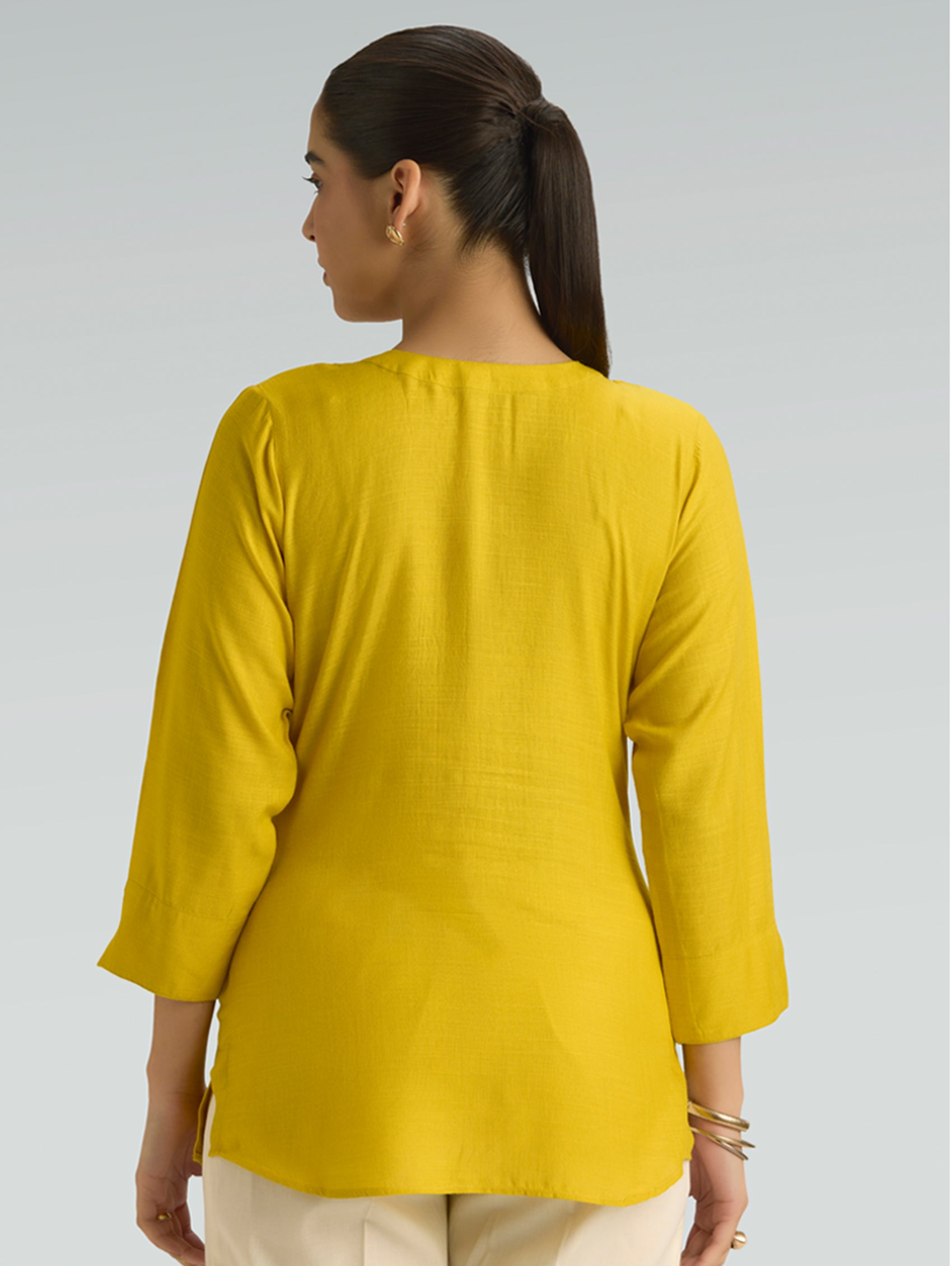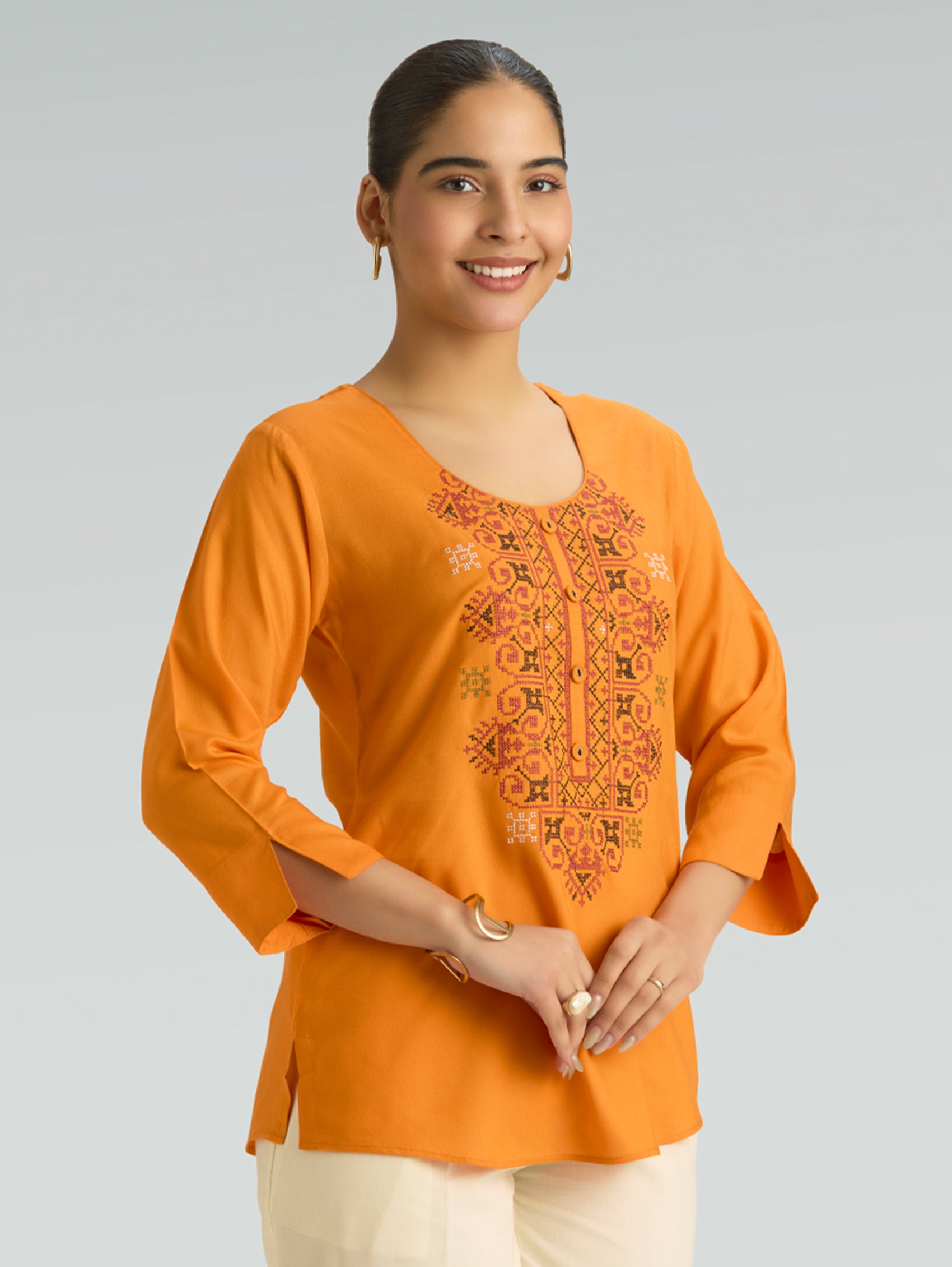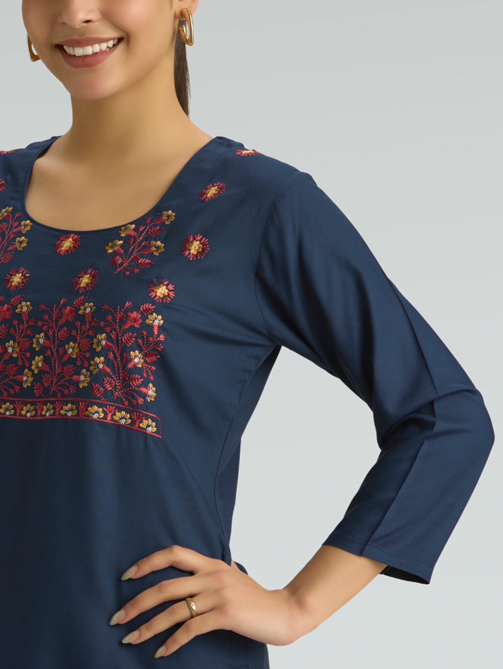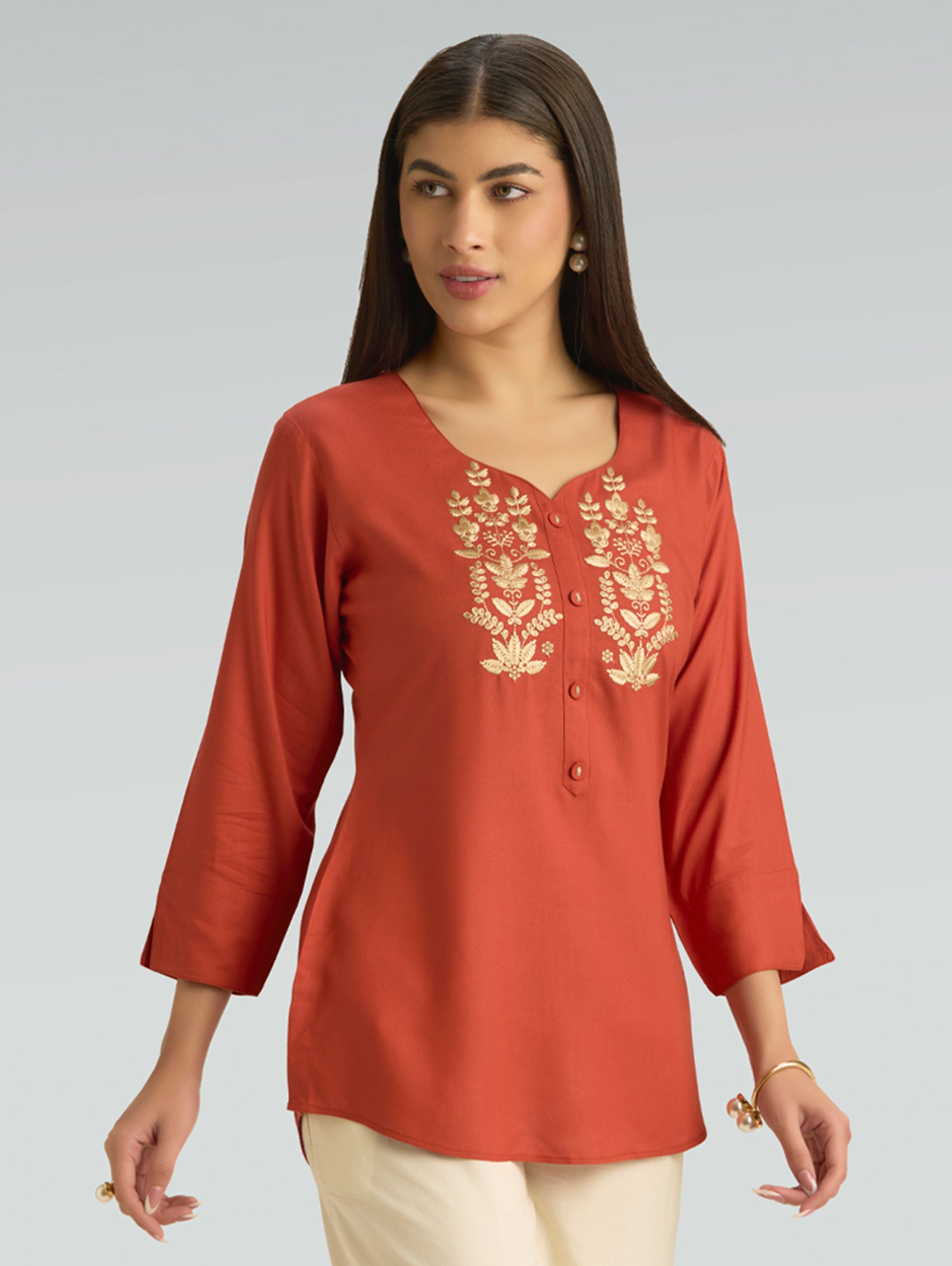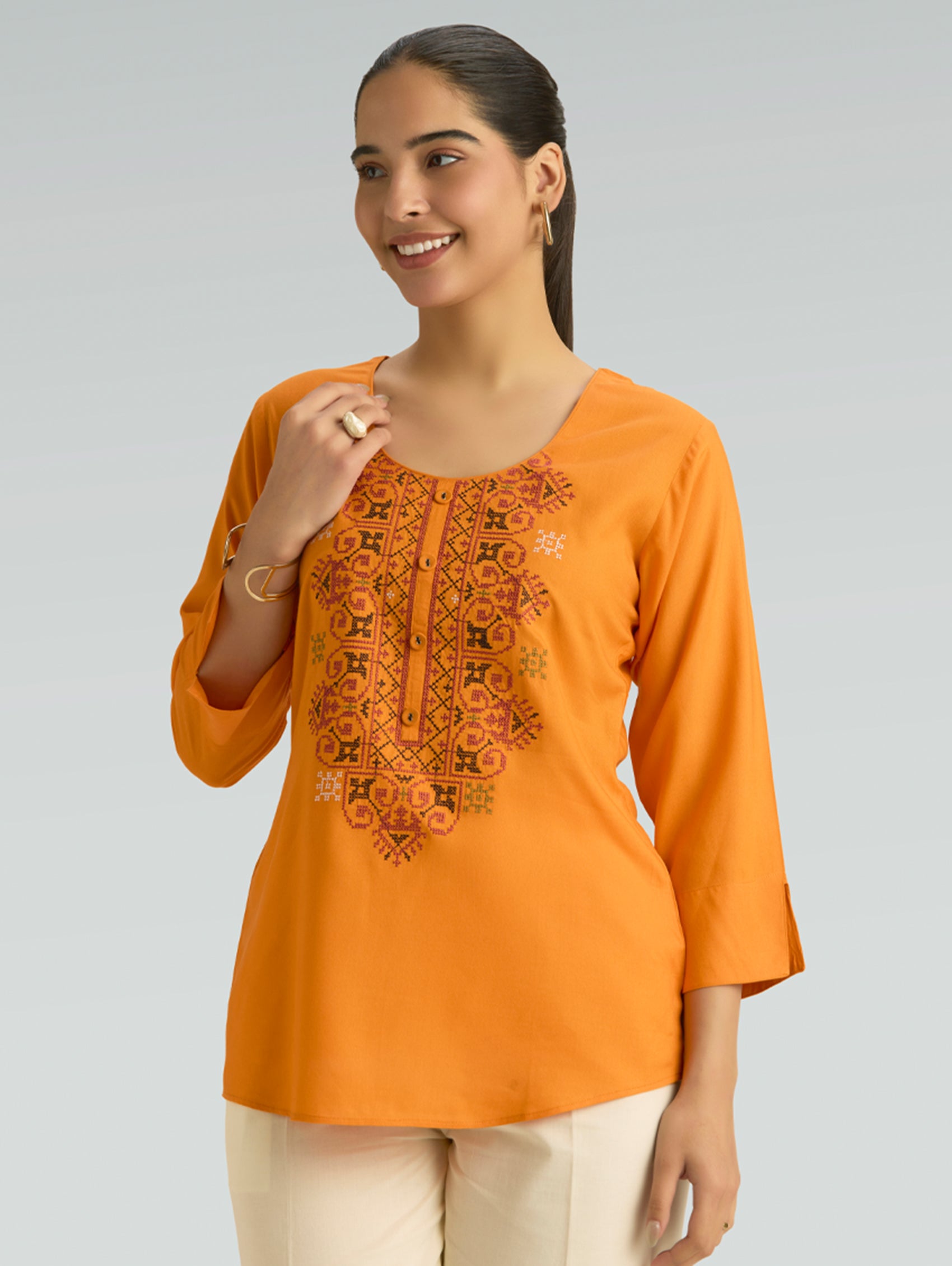 • Tunic with a keyhole round neckline, and three-fourth sleeves.