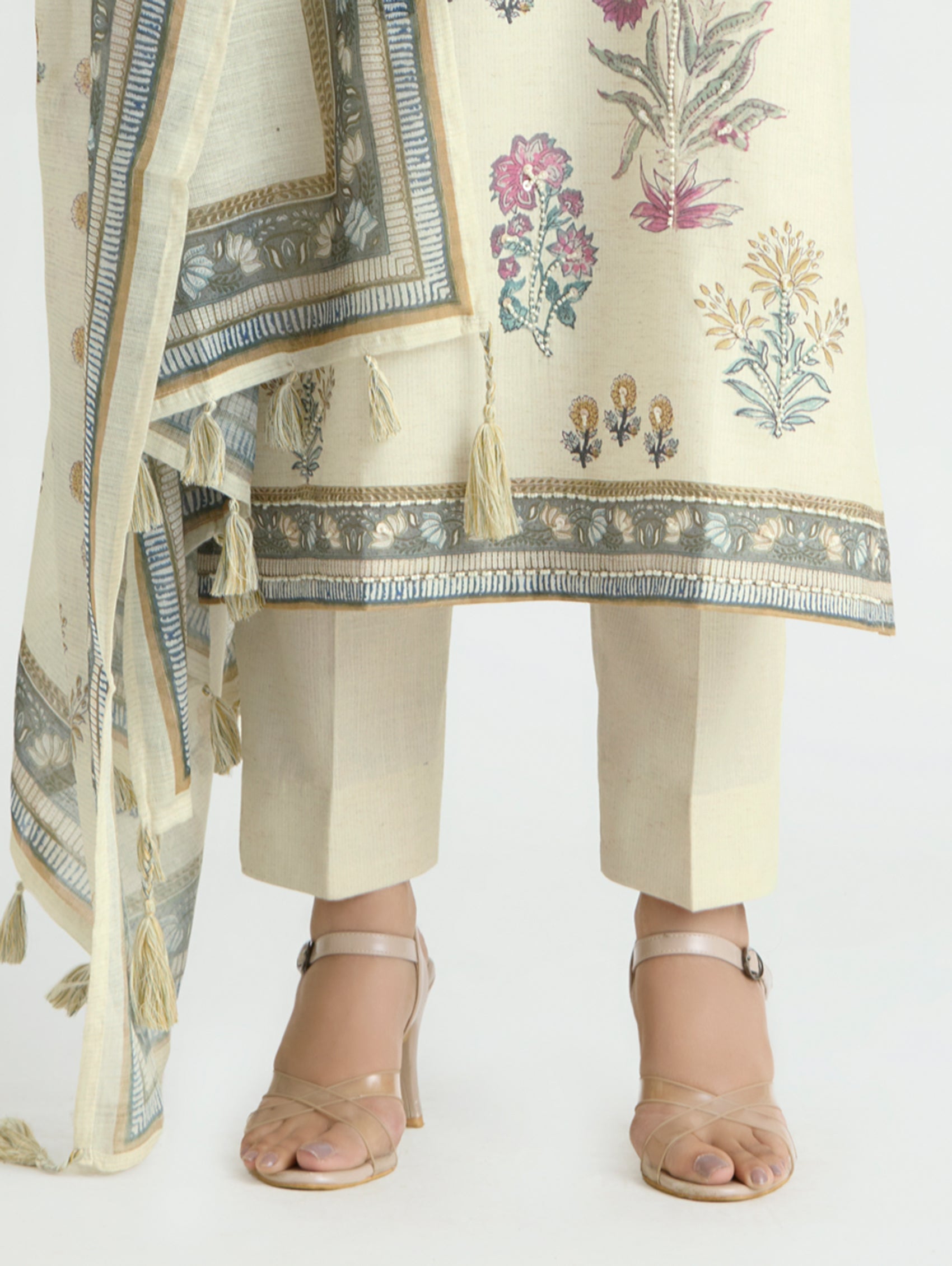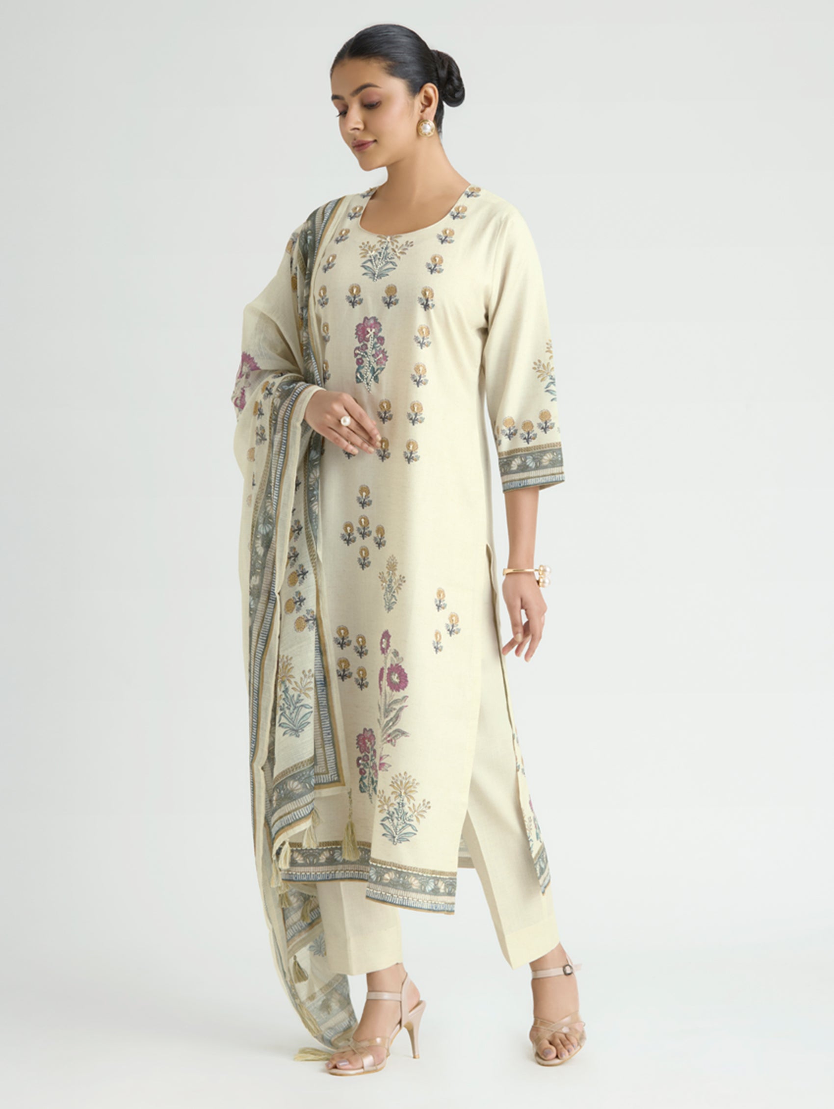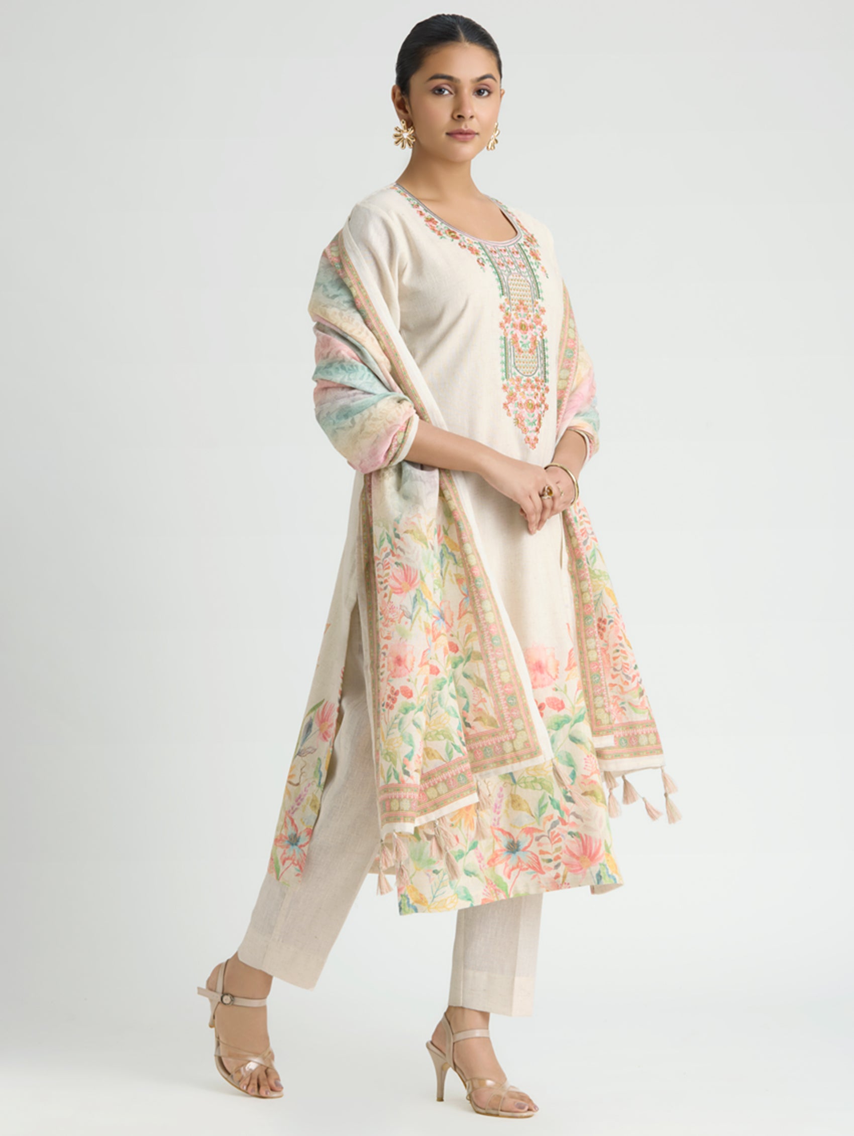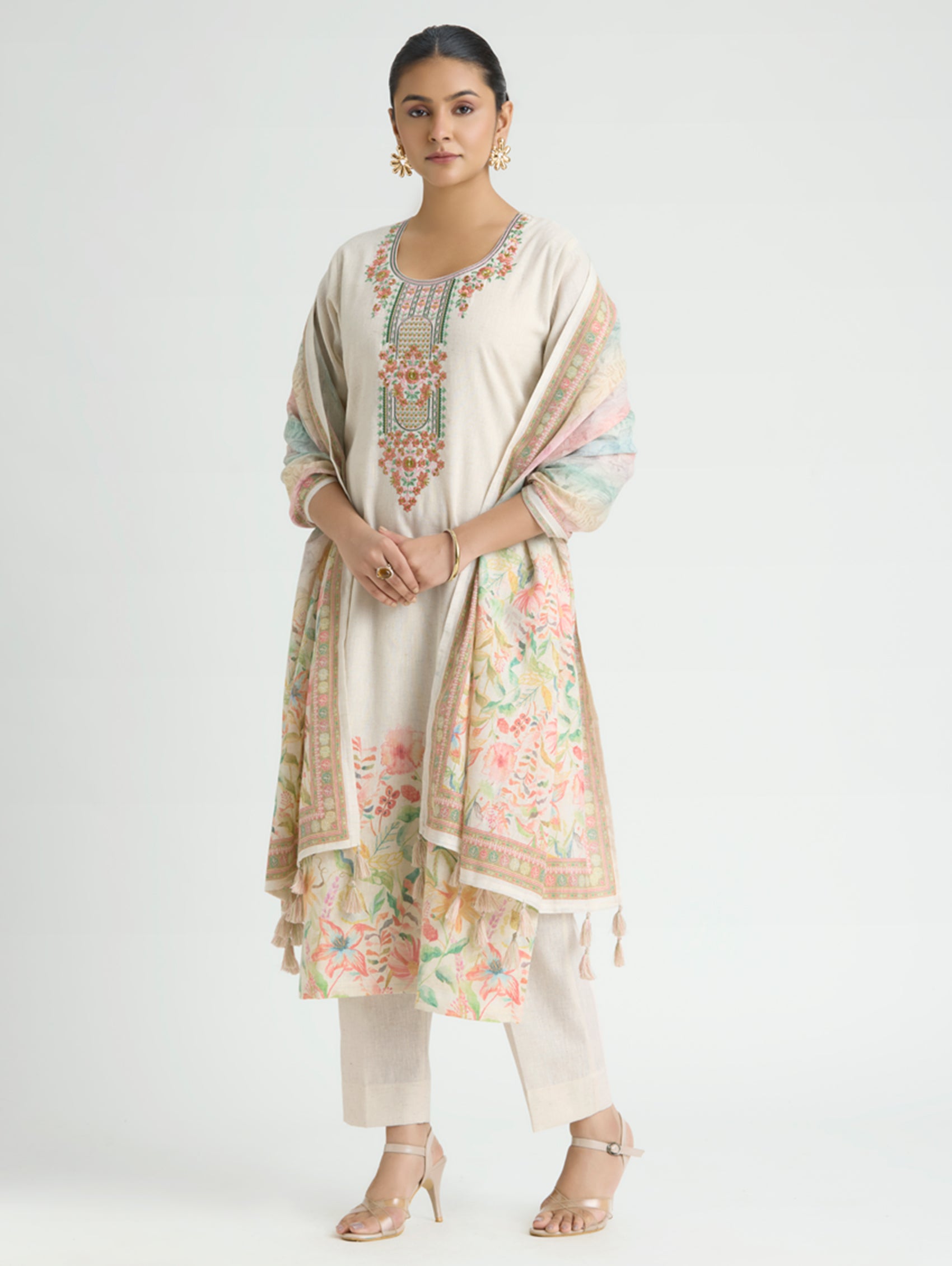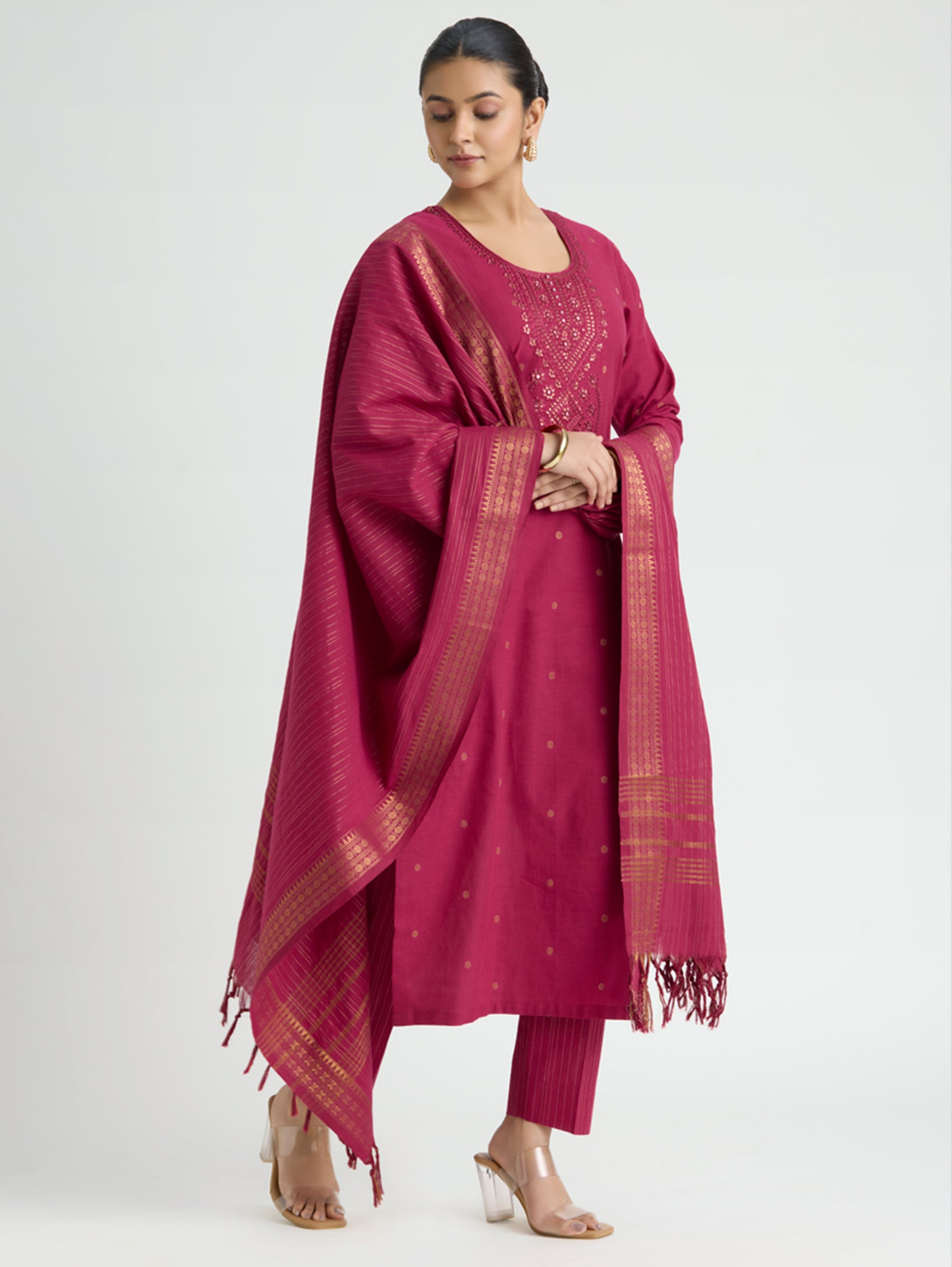 Upgrade your closet with our latest line showcasing an embroidered suit set. This set showcases a solid-colored cotton kurta and regular pants combined with a coordinating cotton dupatta embellished with dazzling sequin-embroidery on the kurta. Take your fashion to the next level with this essential outfit.