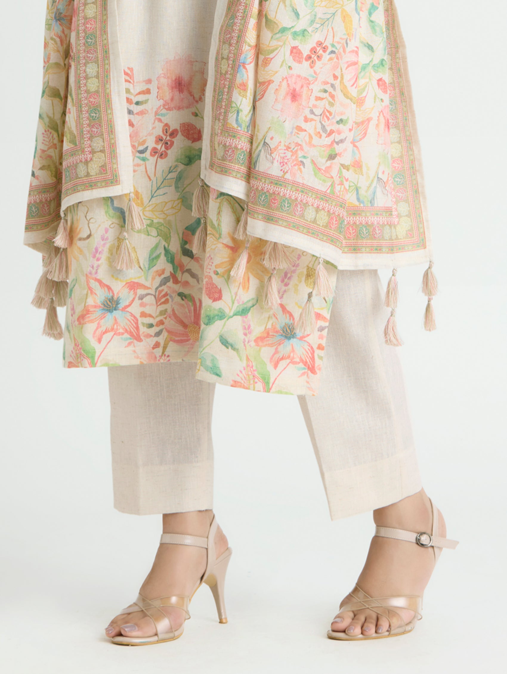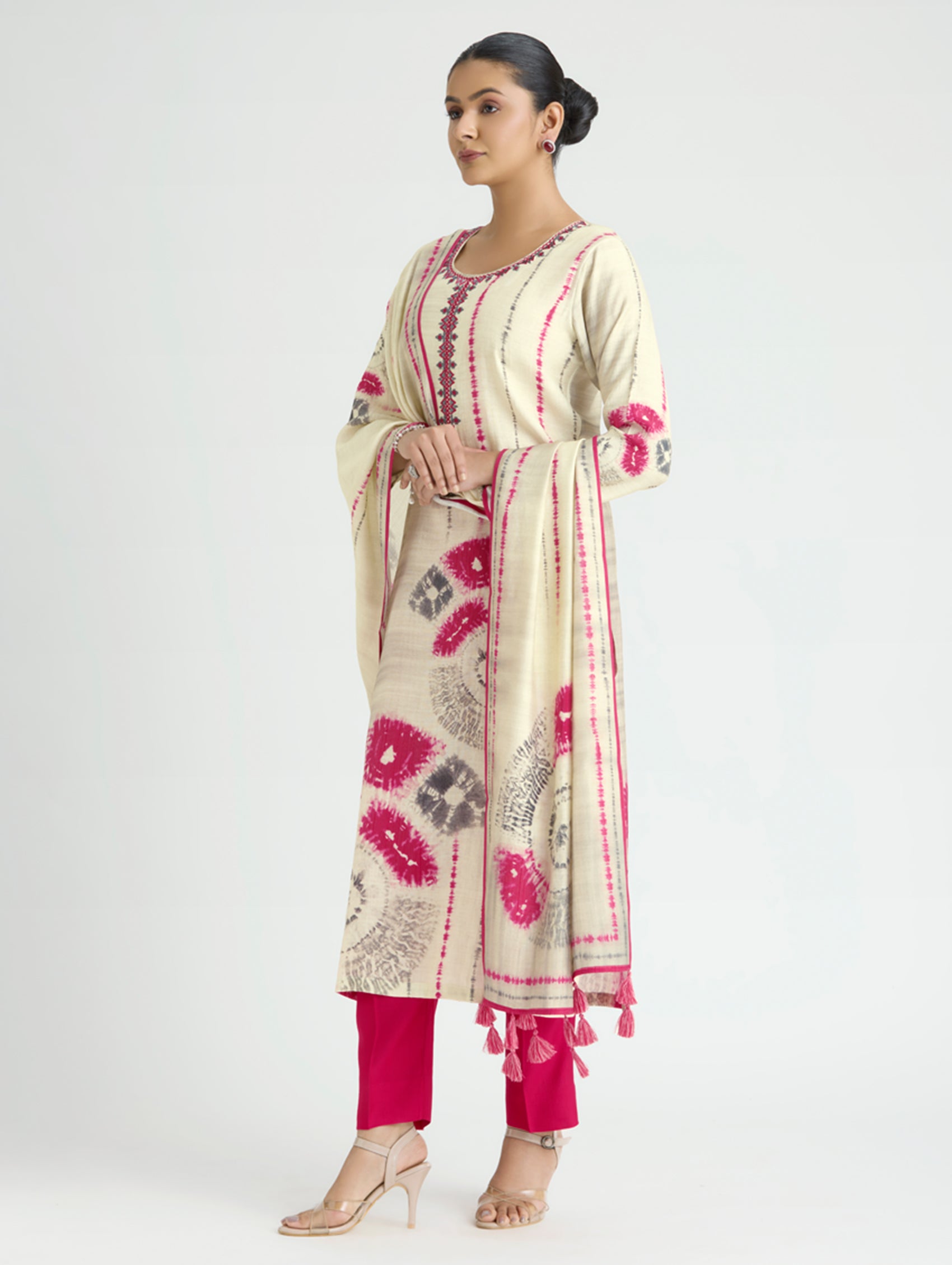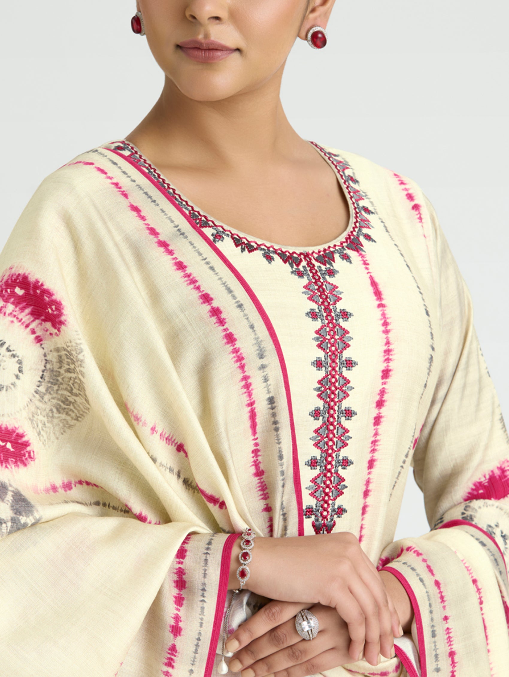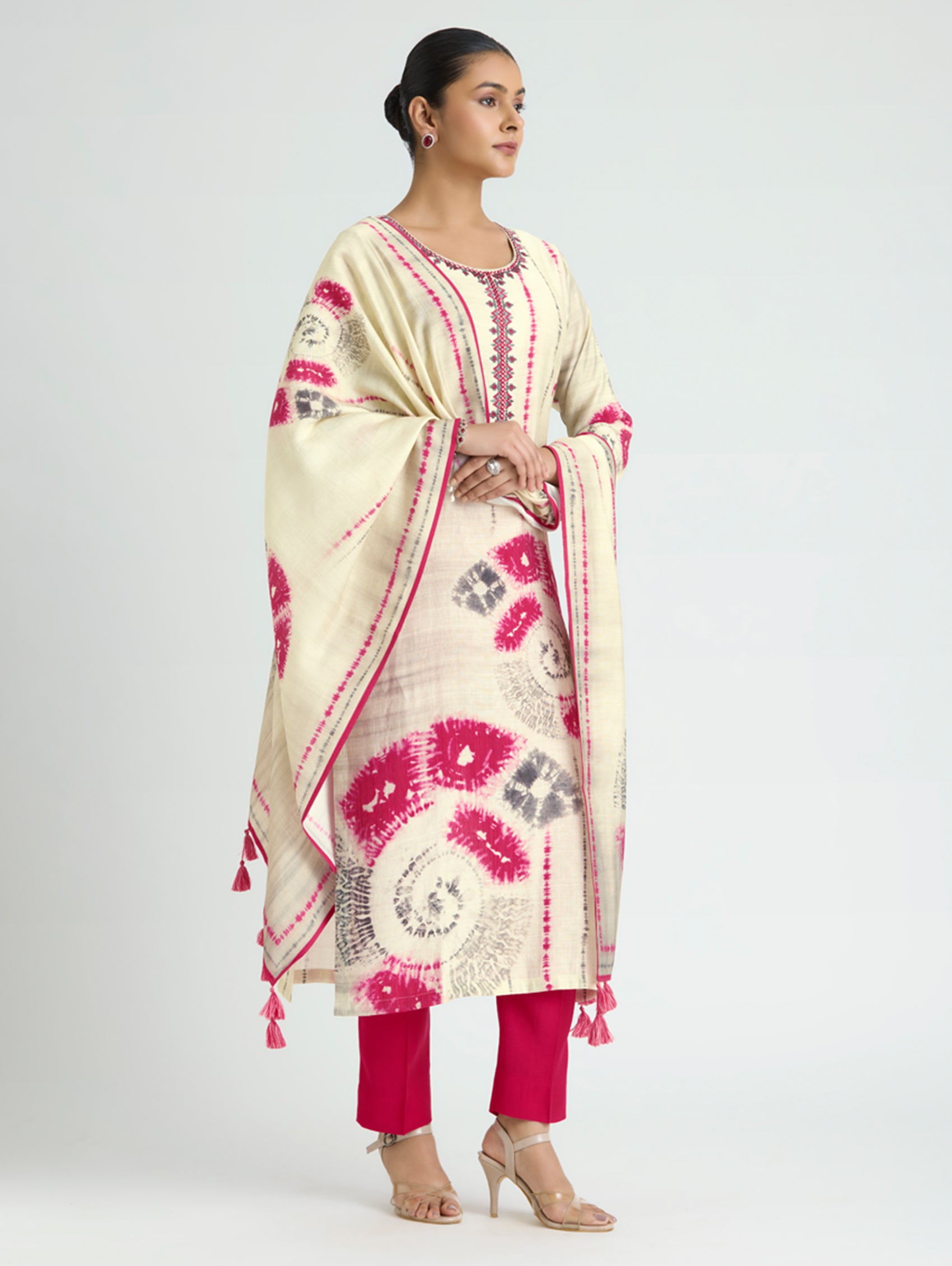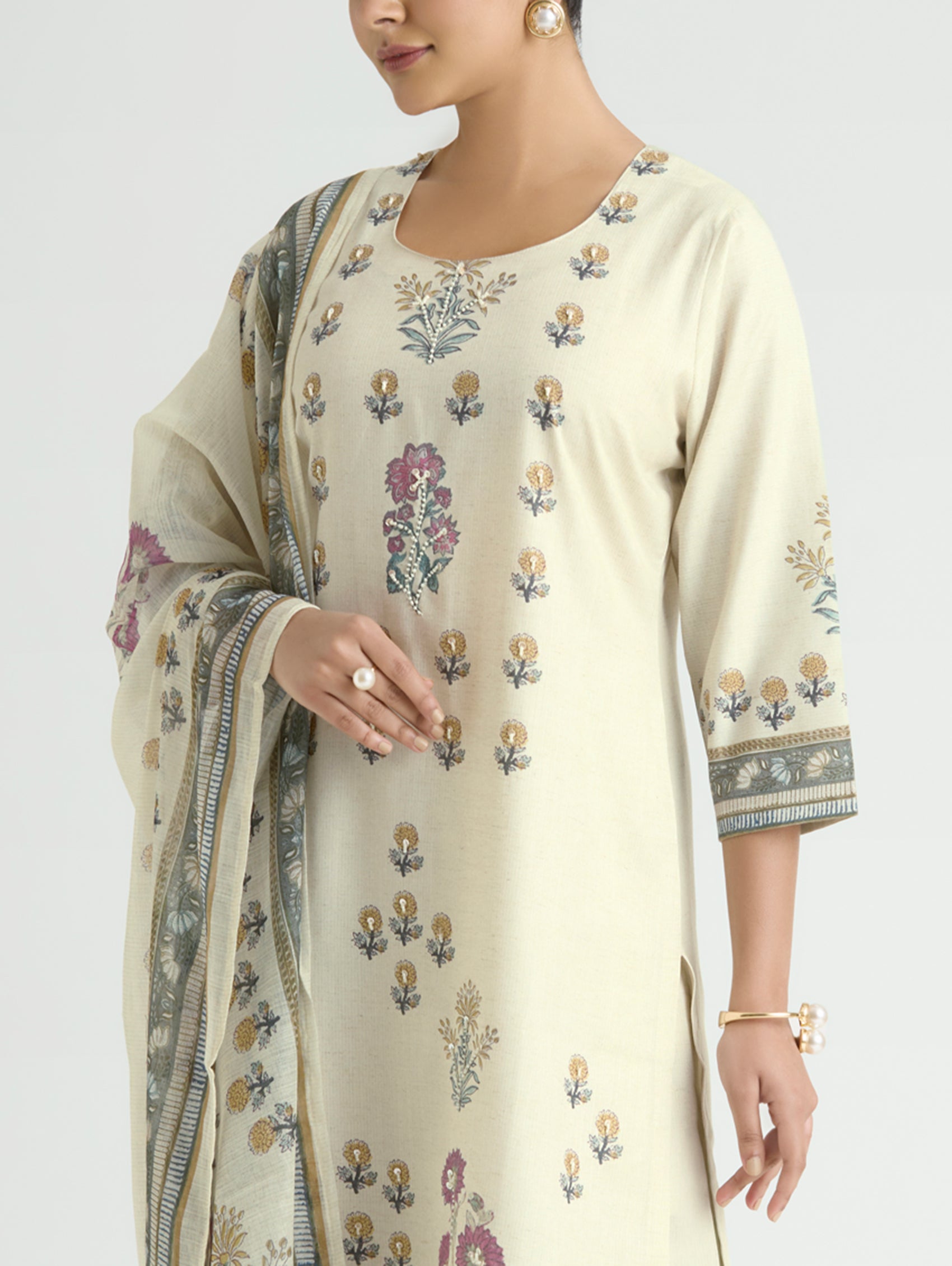 Upgrade your closet with our latest line showcasing an embroidered suit set. This set showcases a solid-colored cotton kurta and regular pants combined with a coordinating cotton dupatta embellished with dazzling sequin-embroidery on the kurta. Take your fashion to the next level with this essential outfit.