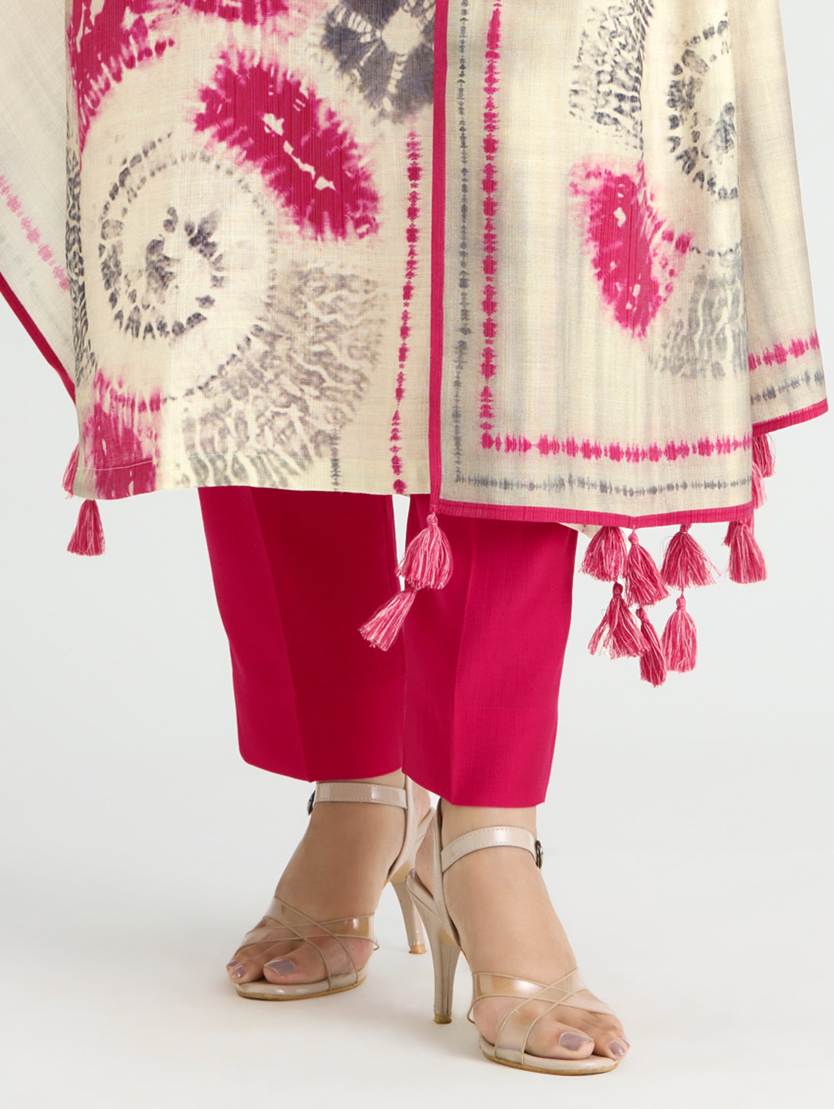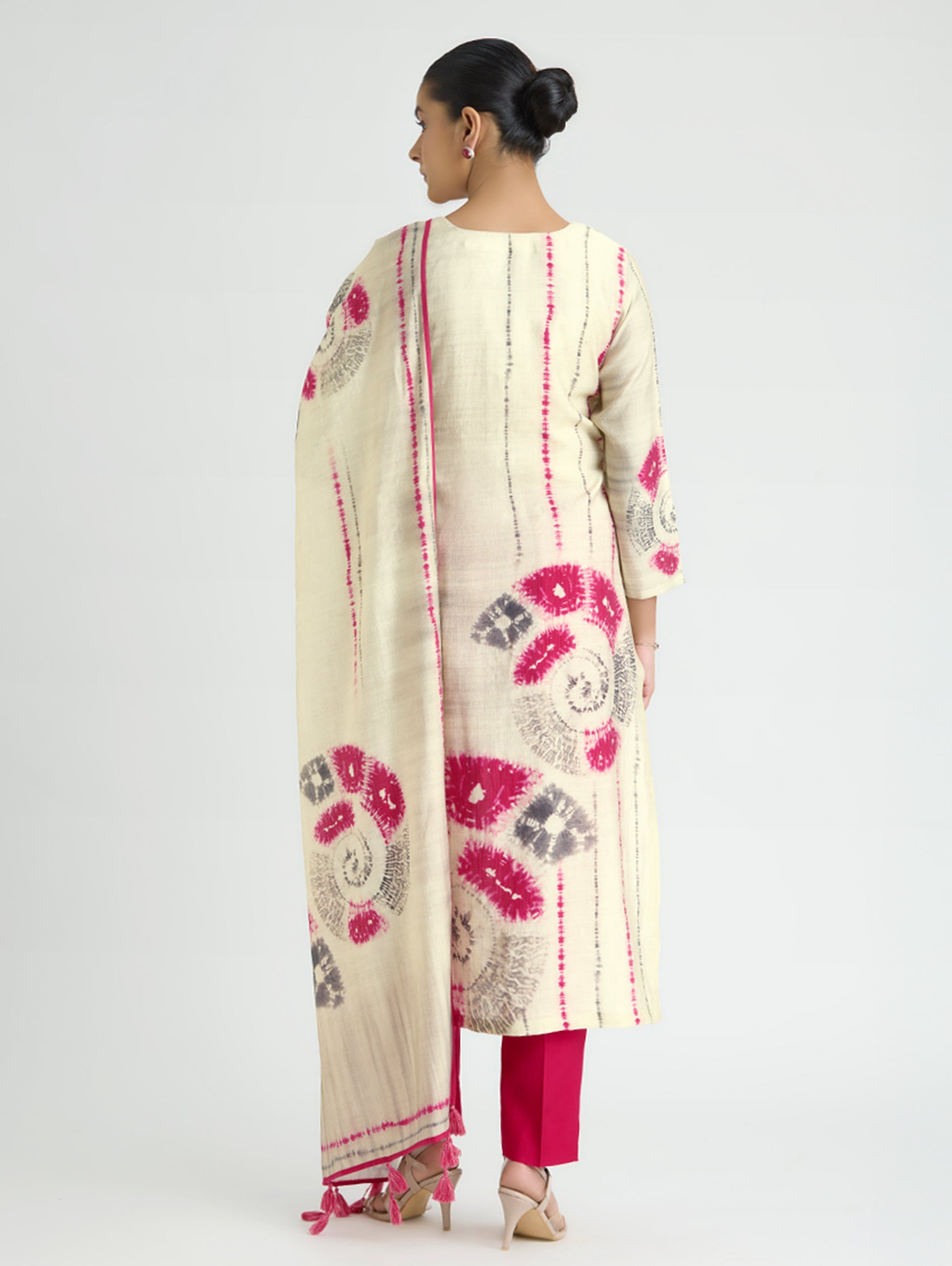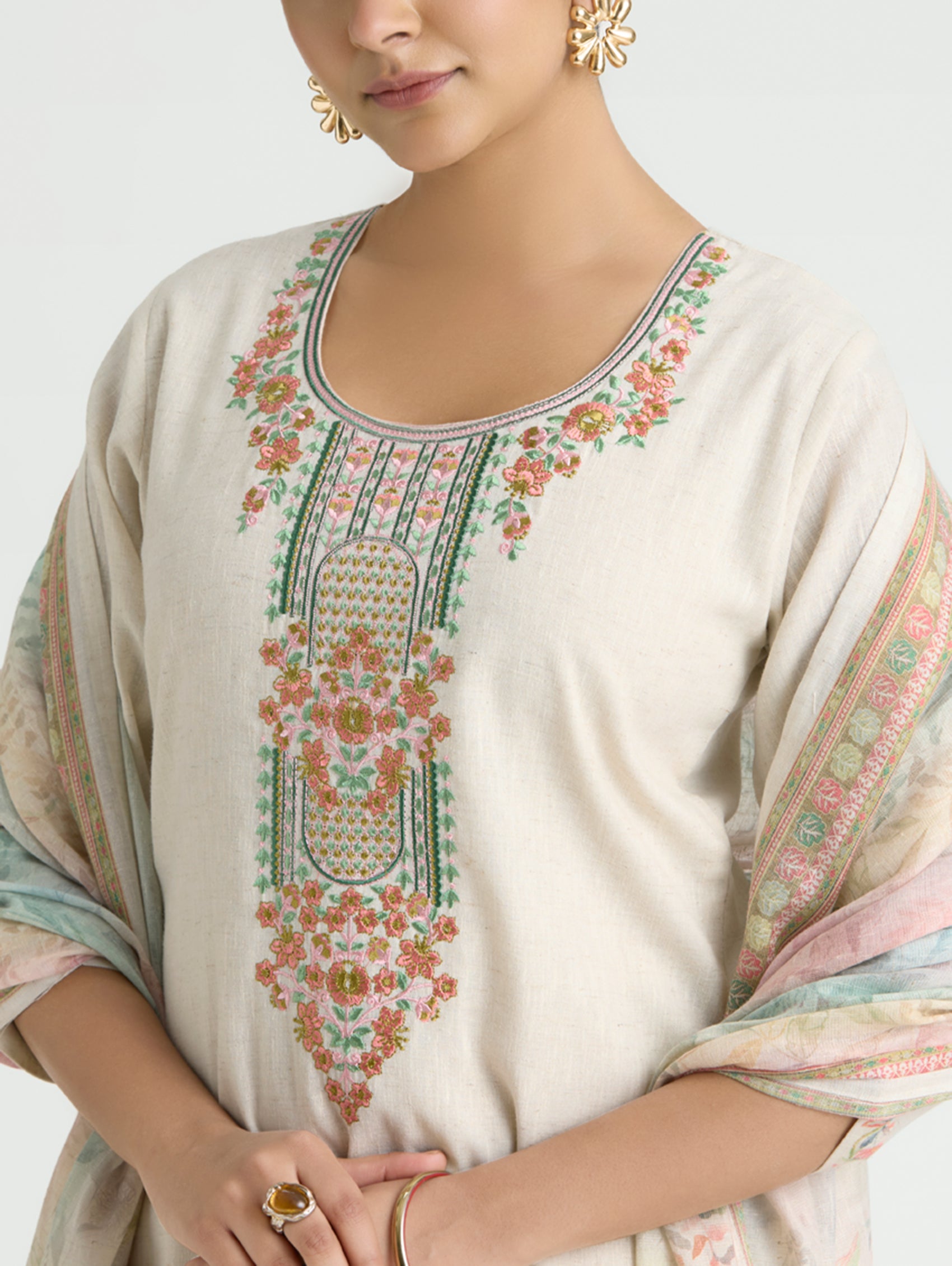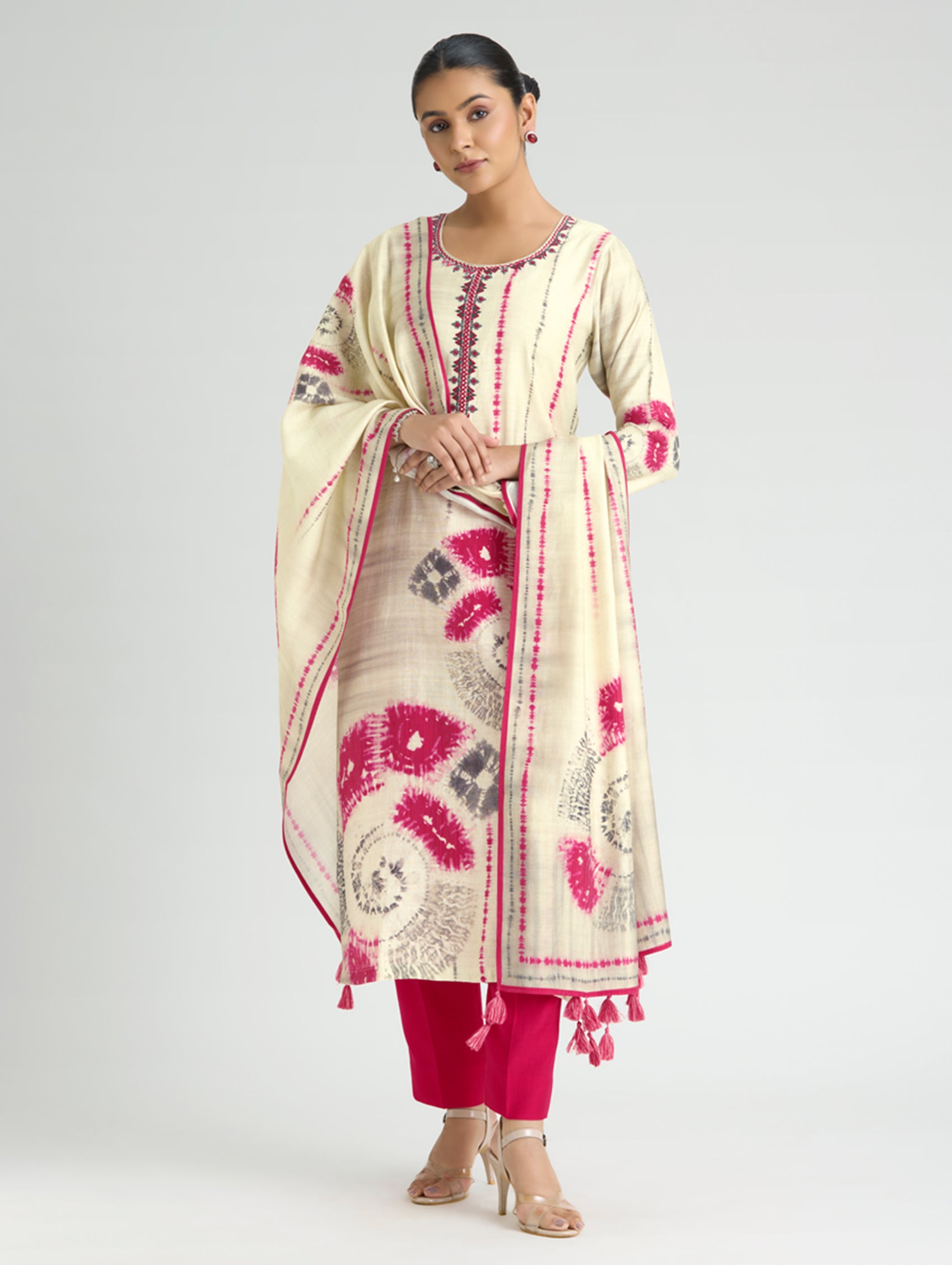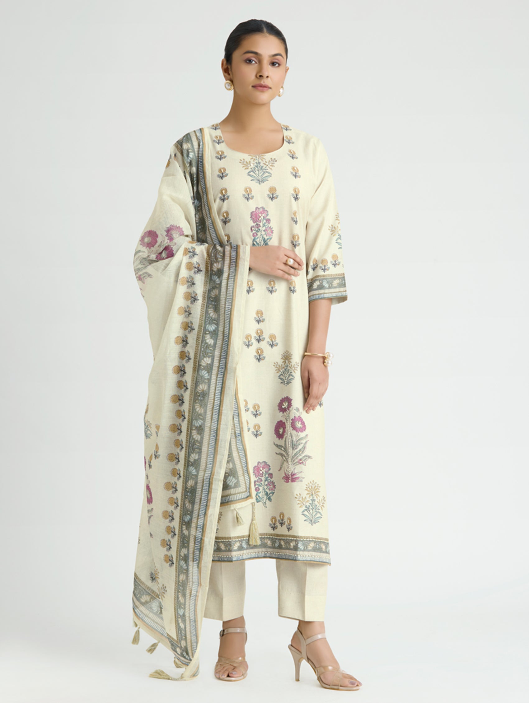Upgrade your closet with our latest line showcasing an embroidered suit set. This set showcases a solid-colored cotton kurta and regular pants combined with a coordinating cotton dupatta embellished with dazzling sequin-embroidery on the kurta. Take your fashion to the next level with this essential outfit.
