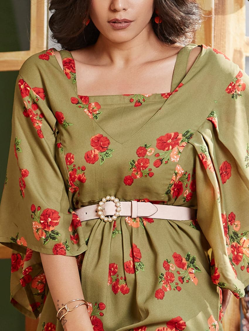 The floral printed tunic features V-neckline and kaftan-like sleeves with a printed inner featuring a square neckline without sleeves. Crafted in the finest summer cool viscose fabric, this tunic is perfect to keep you cool in the summers.