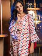The printed tunic features a keyhole round neckline and three-fourth bell sleeves. Crafted in the finest rayon, this tunic is perfect to keep you cool in the summers.