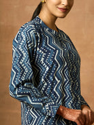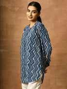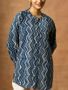 Explore our new arrival - a dazzling pure indigo printed cotton short kurti with a mandarin collar, full sleeves and side slits open. Appreciate the perfectly tailored kurta, radiating sophistication and opulence. Enhance your look with this essential outfit!