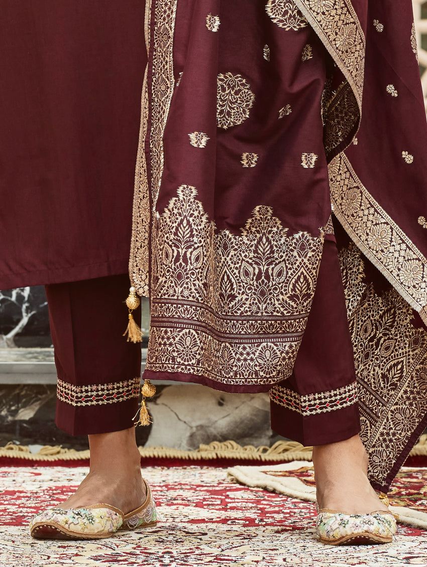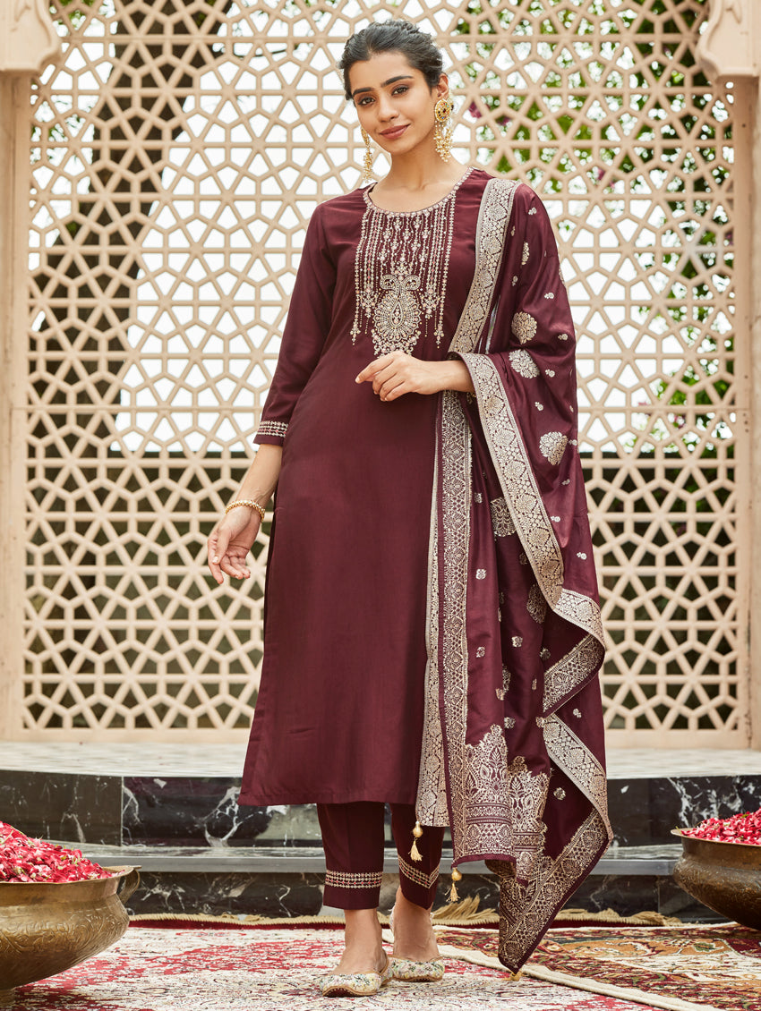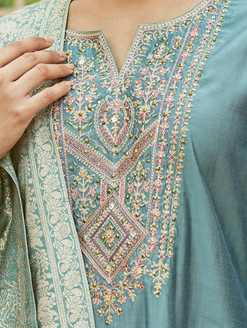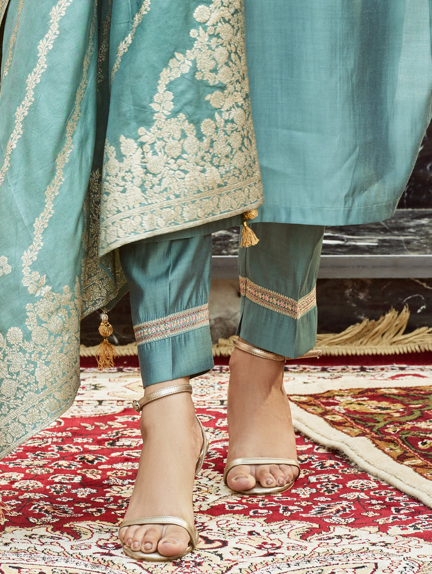 A straight-fit suit set from our latest collection. The set combines a digitally printed muslin silk kurta with hand embroidery, straight pants and a digitally printed muslin silk dupatta.