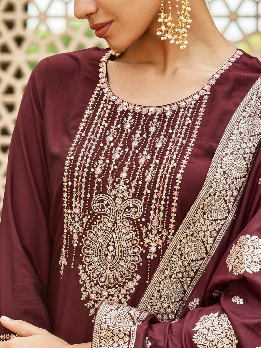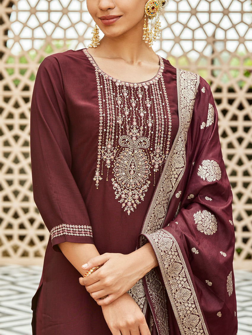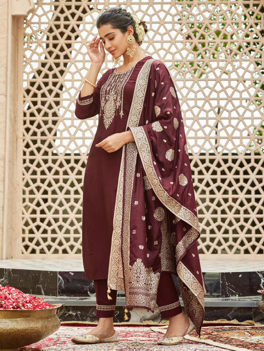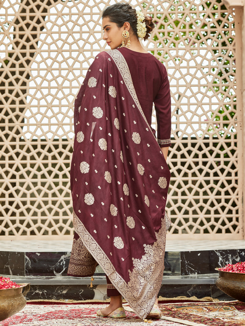 A straight-fit suit set from our latest collection. The set combines a digitally printed muslin silk kurta with hand embroidery, straight pants and a digitally printed muslin silk dupatta.