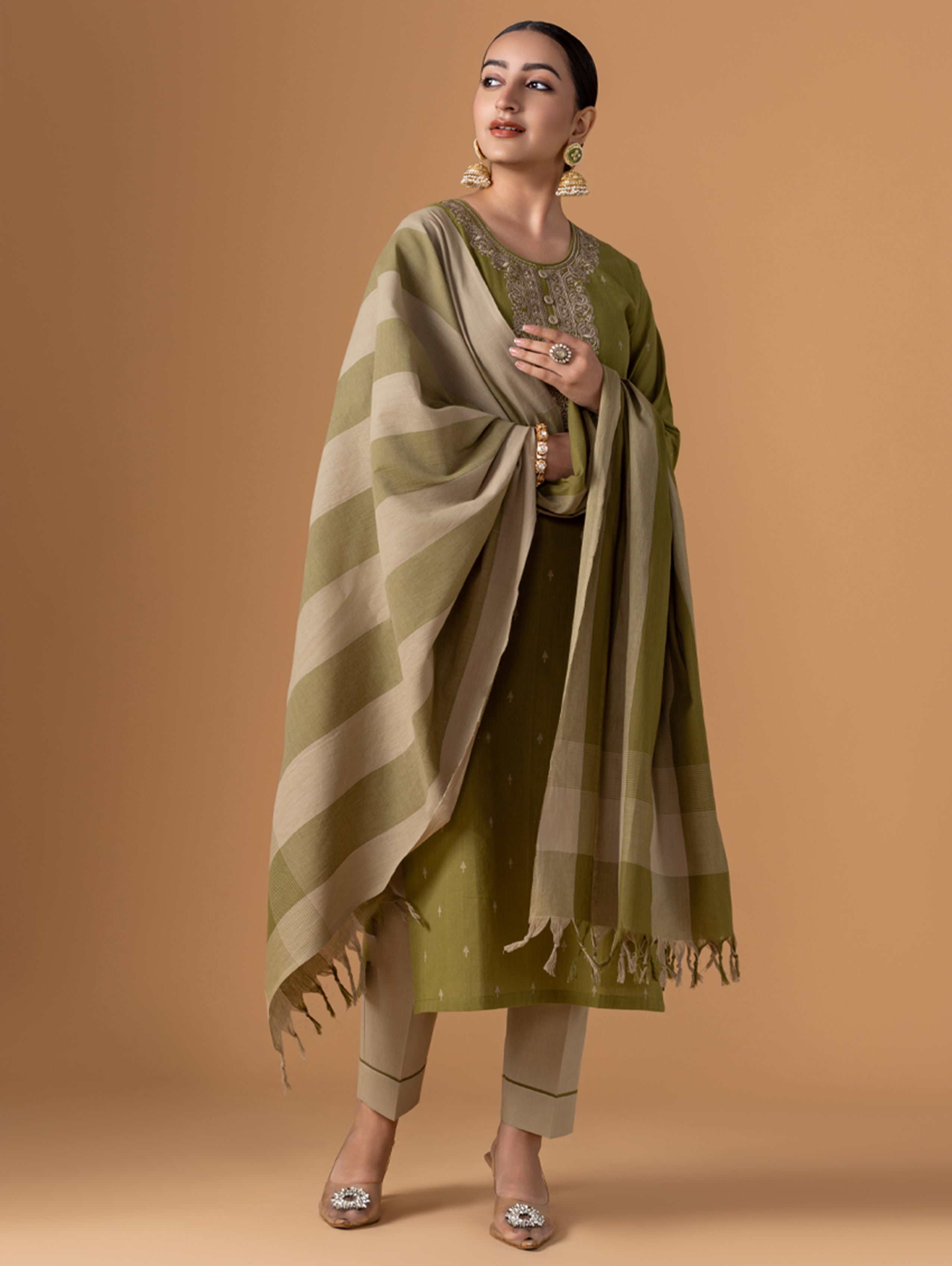 Transform your wardrobe with our latest addition - the stunning straight-cut suit set. This ensemble boasts computerised thread embroidery on the jamdani pure cotton kurta, paired with straight trousers and a jamdani pure cotton mul dupatta. A must-have for style enthusiasts, it exudes elegance and allure to your collection!