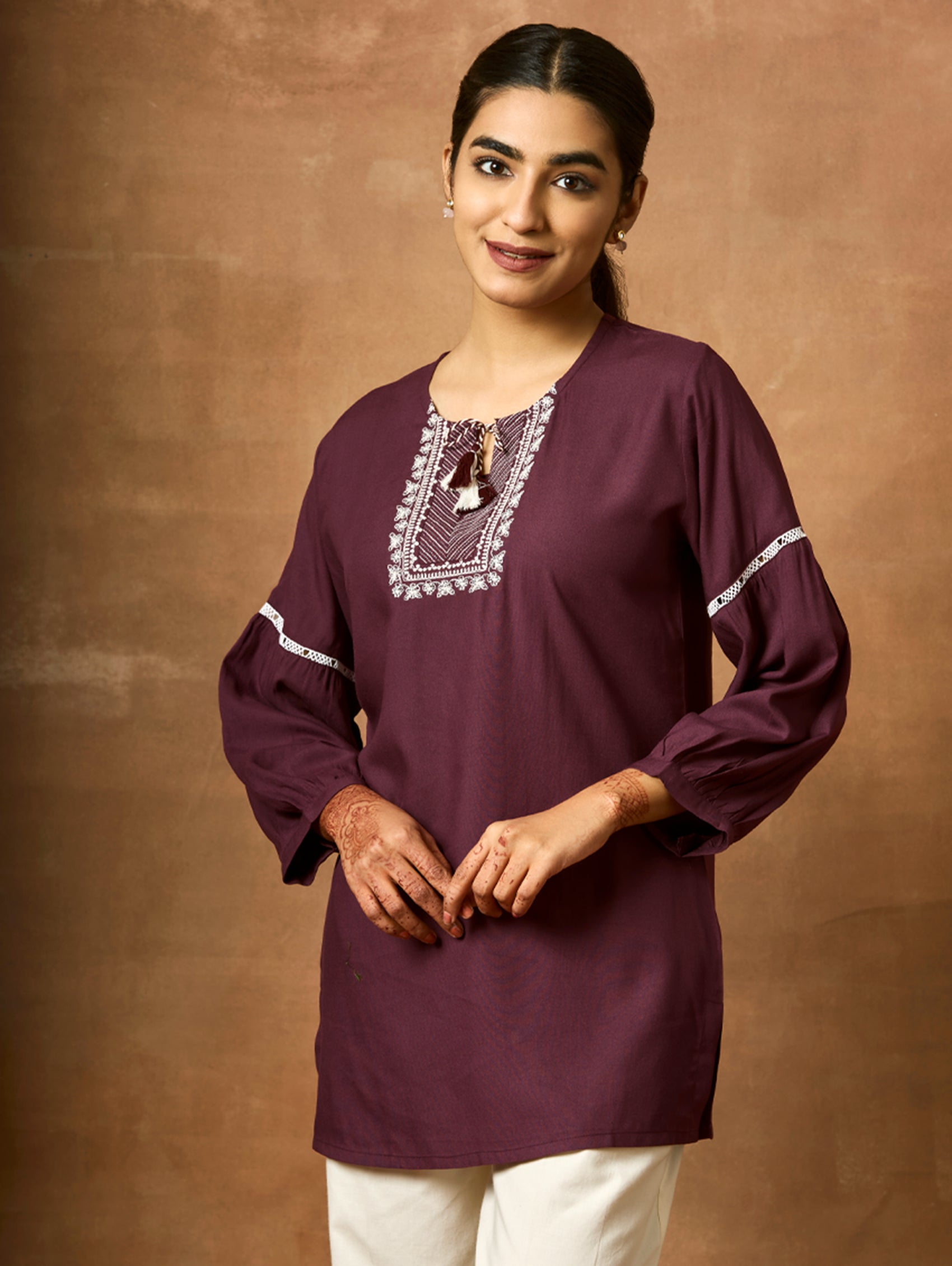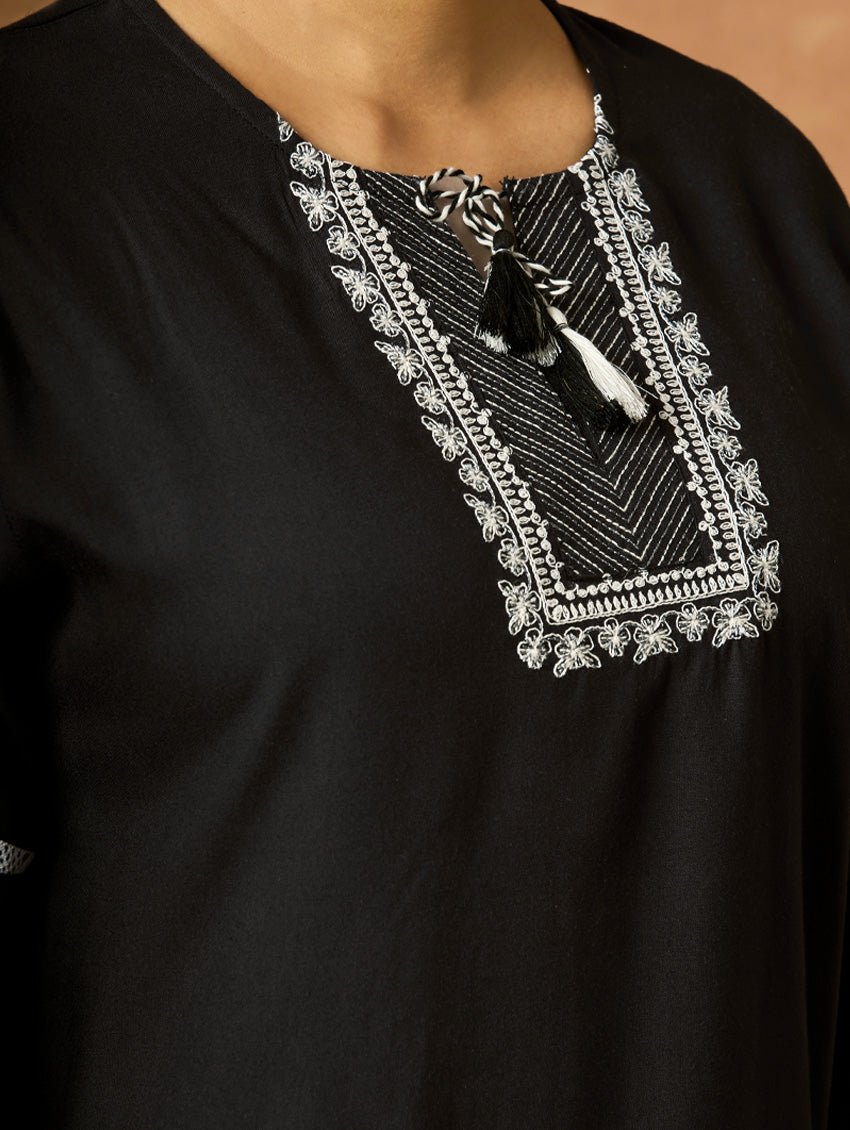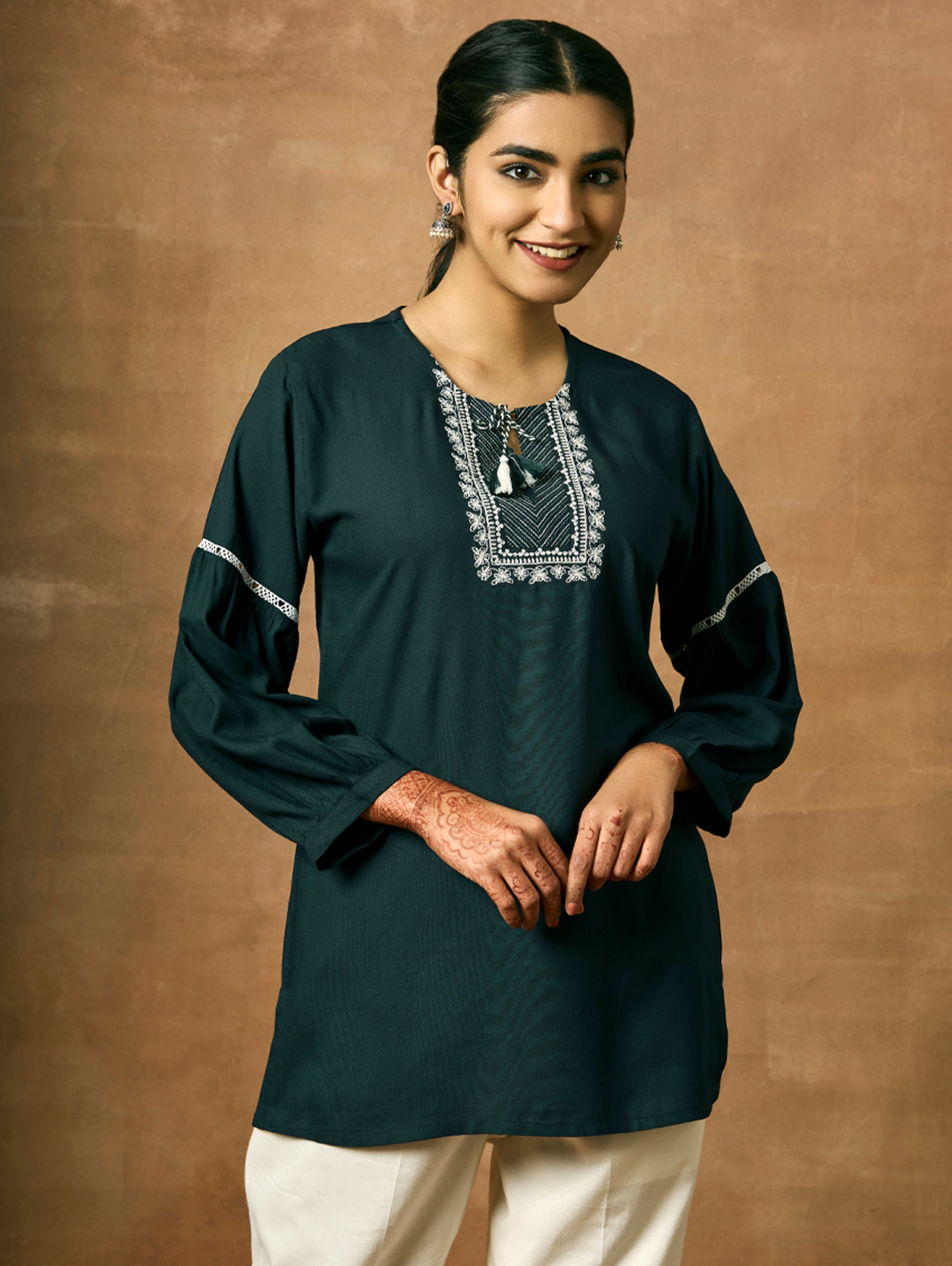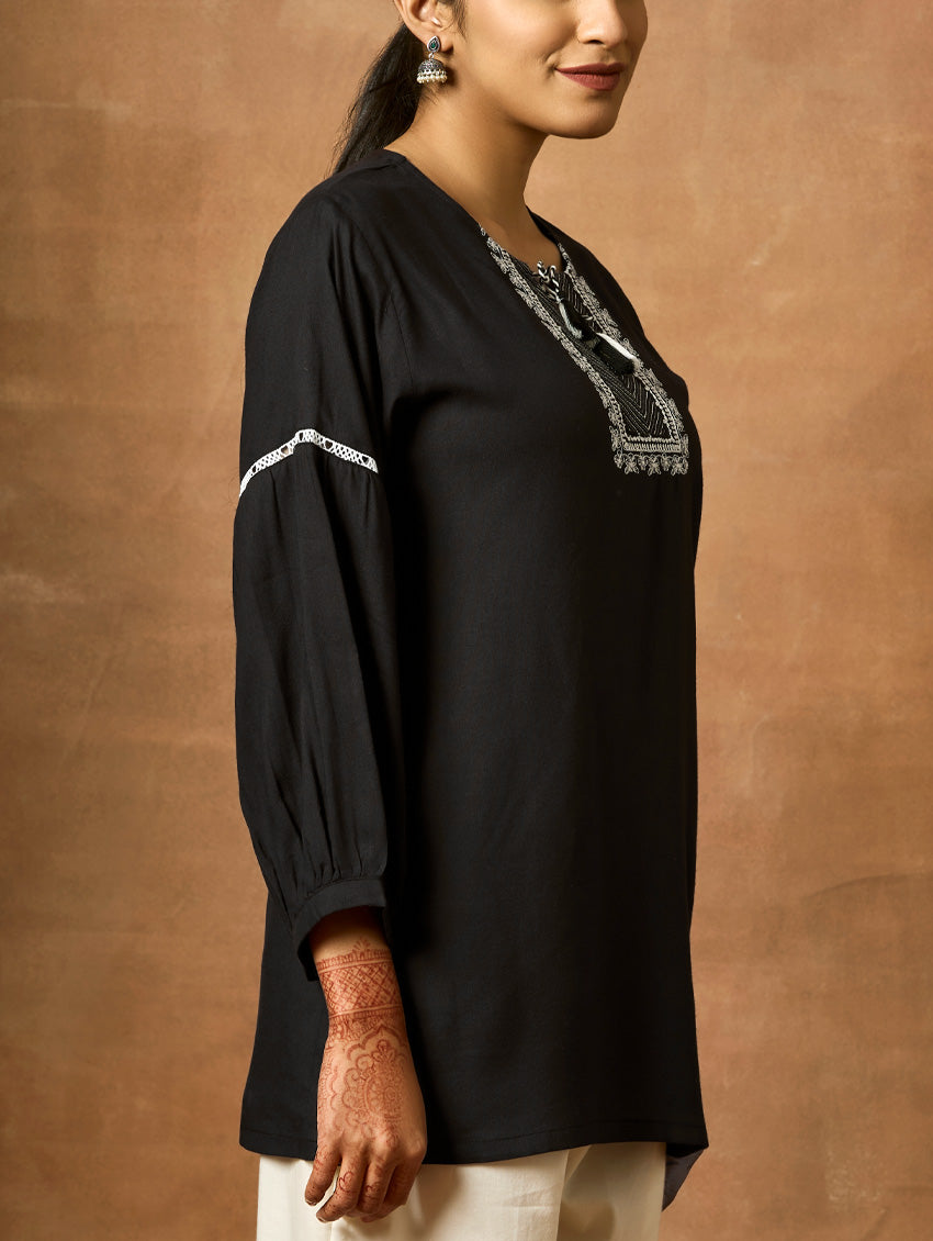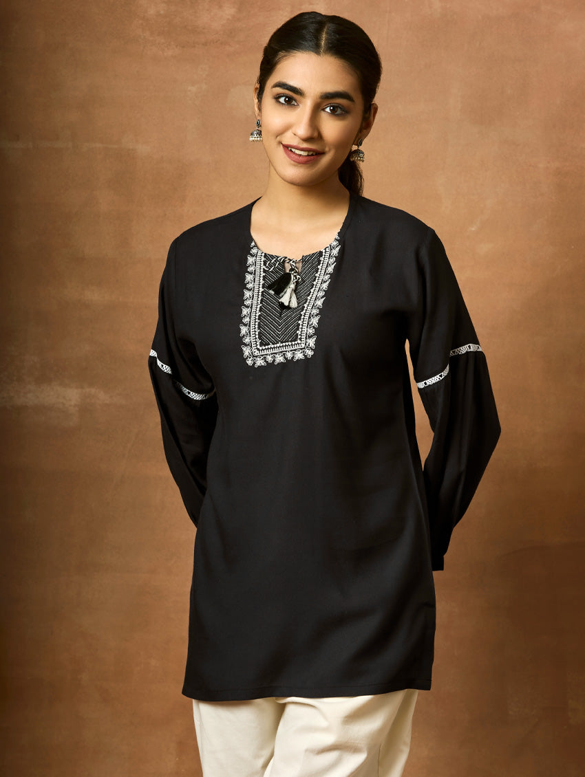 Introducing the newest member of our collection - an embroidered viscose rayon tunic adorned with a round neckline and three-quarter sleeves. Elevate your fashion game with this essential ensemble!