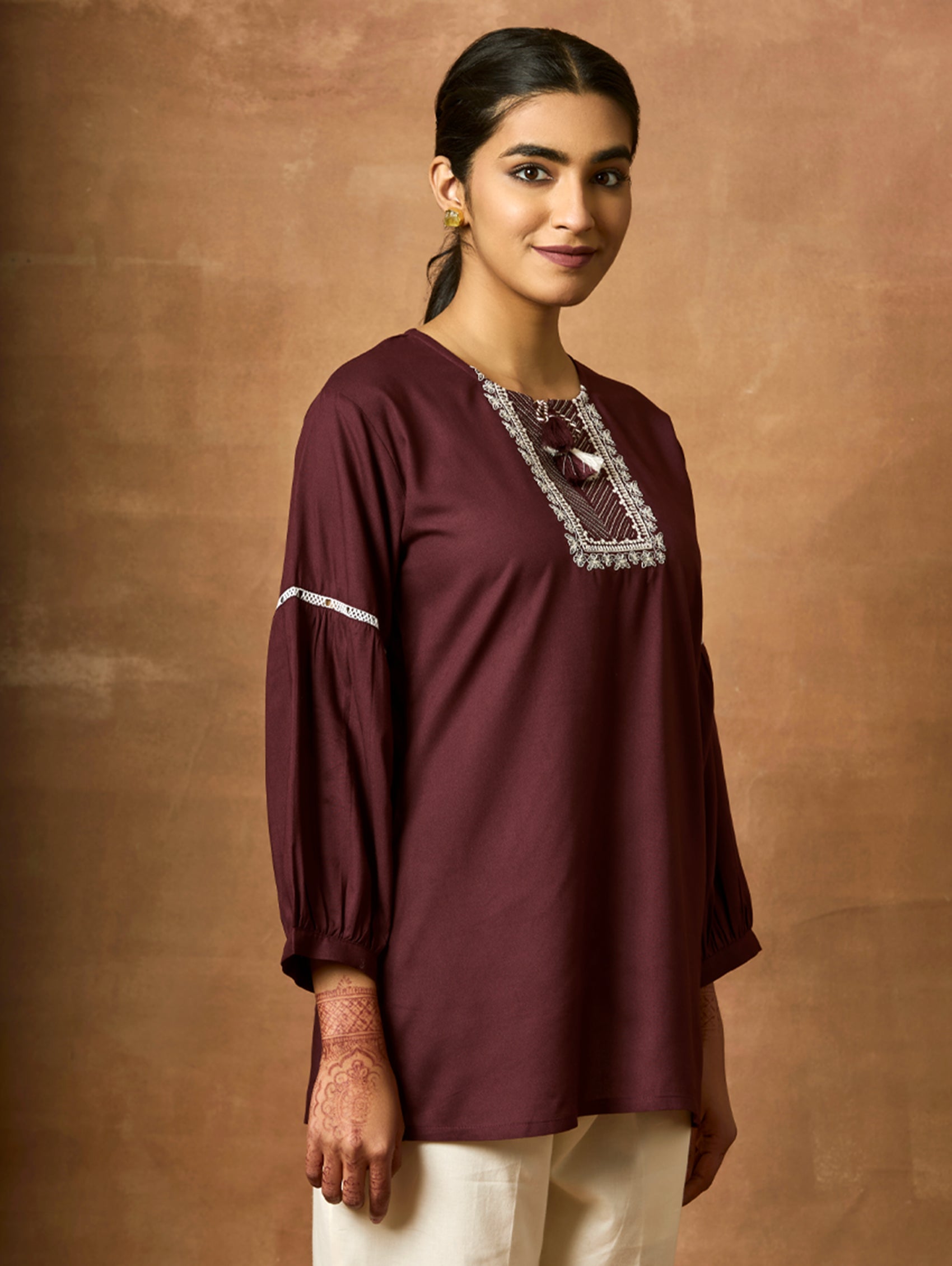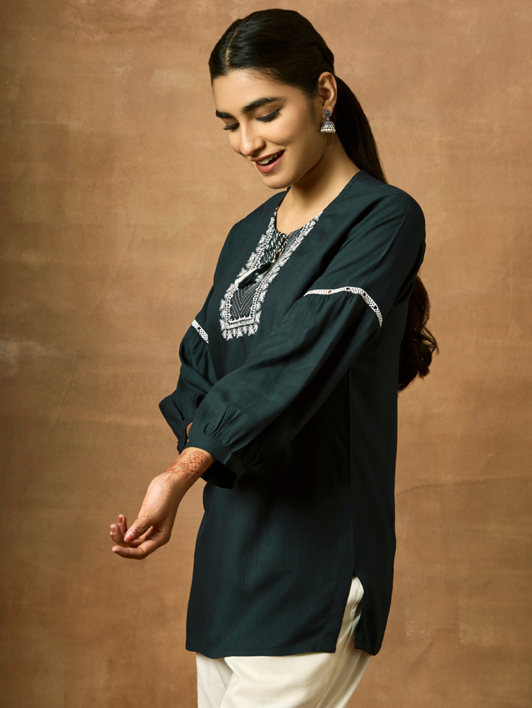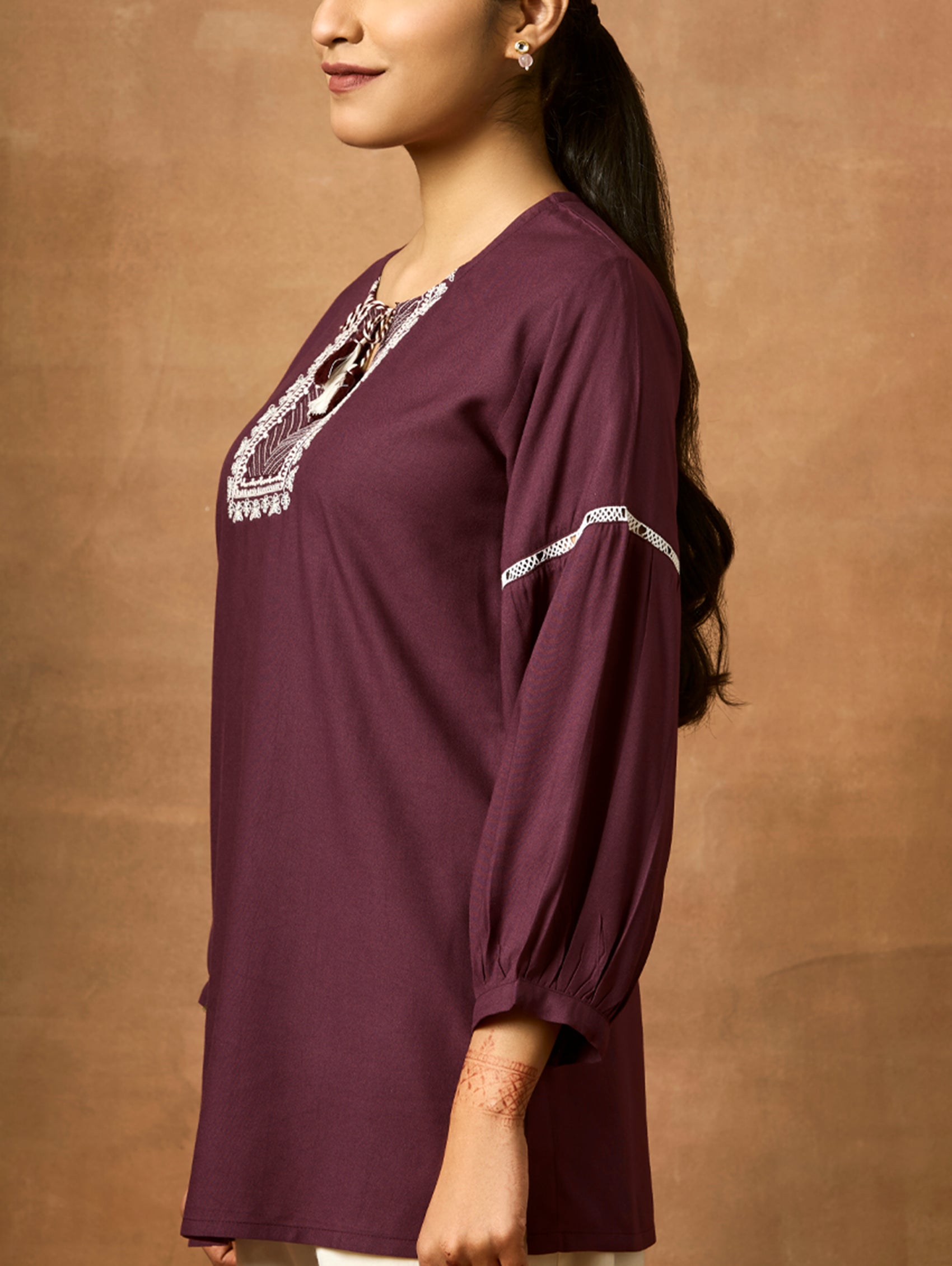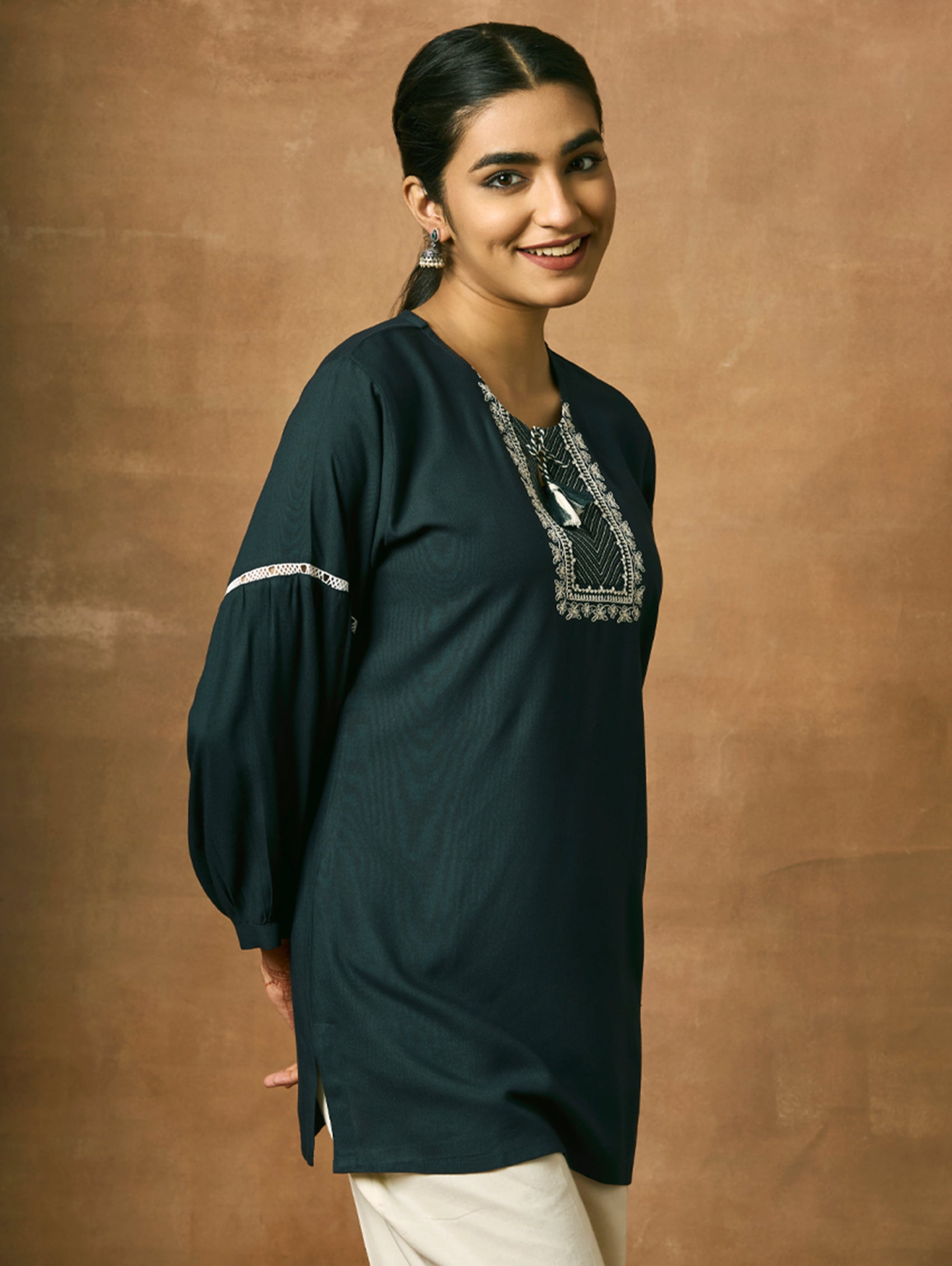 Introducing the newest member of our collection - an embroidered viscose rayon tunic adorned with a round neckline and three-quarter sleeves. Elevate your fashion game with this essential ensemble!