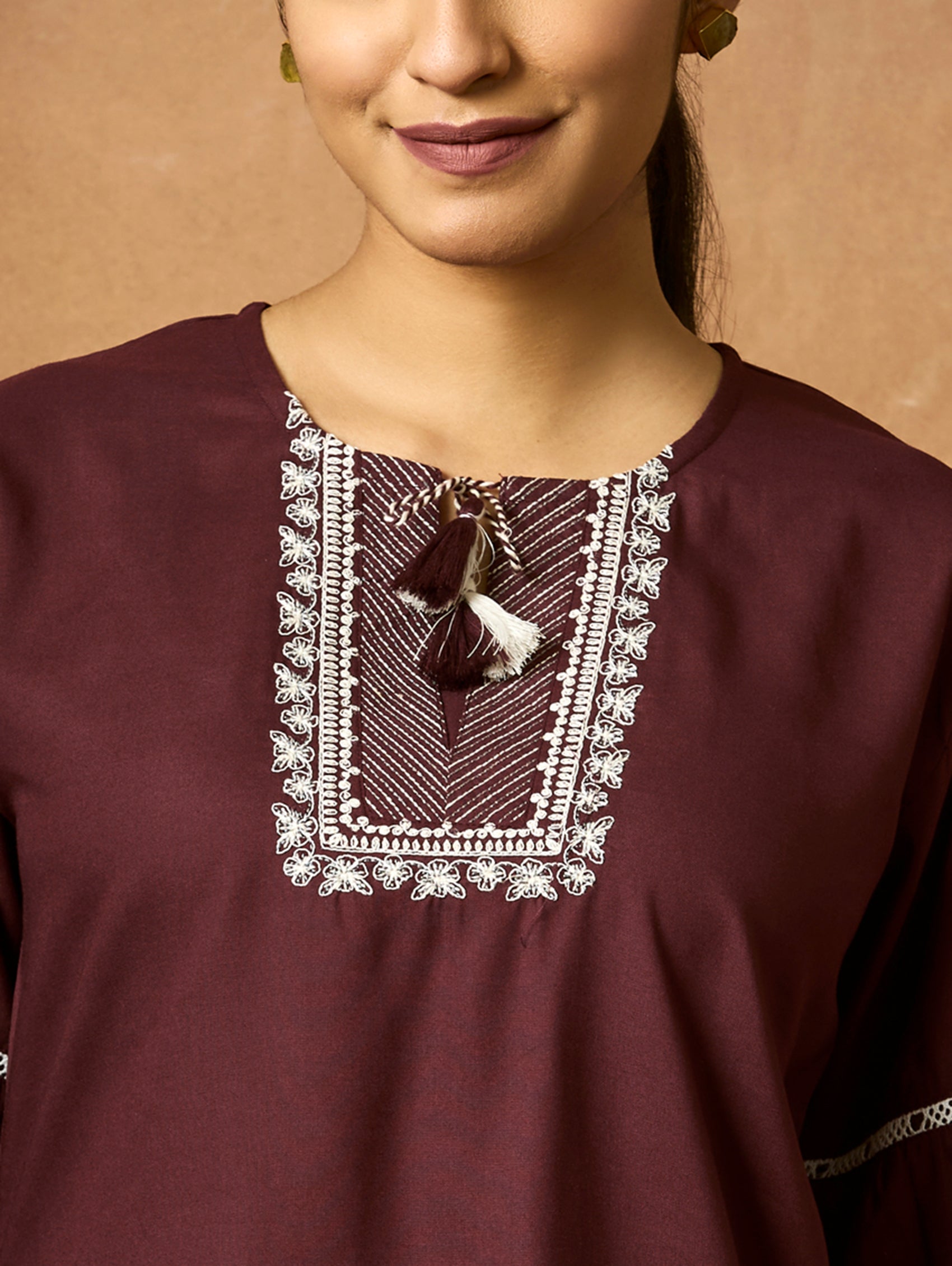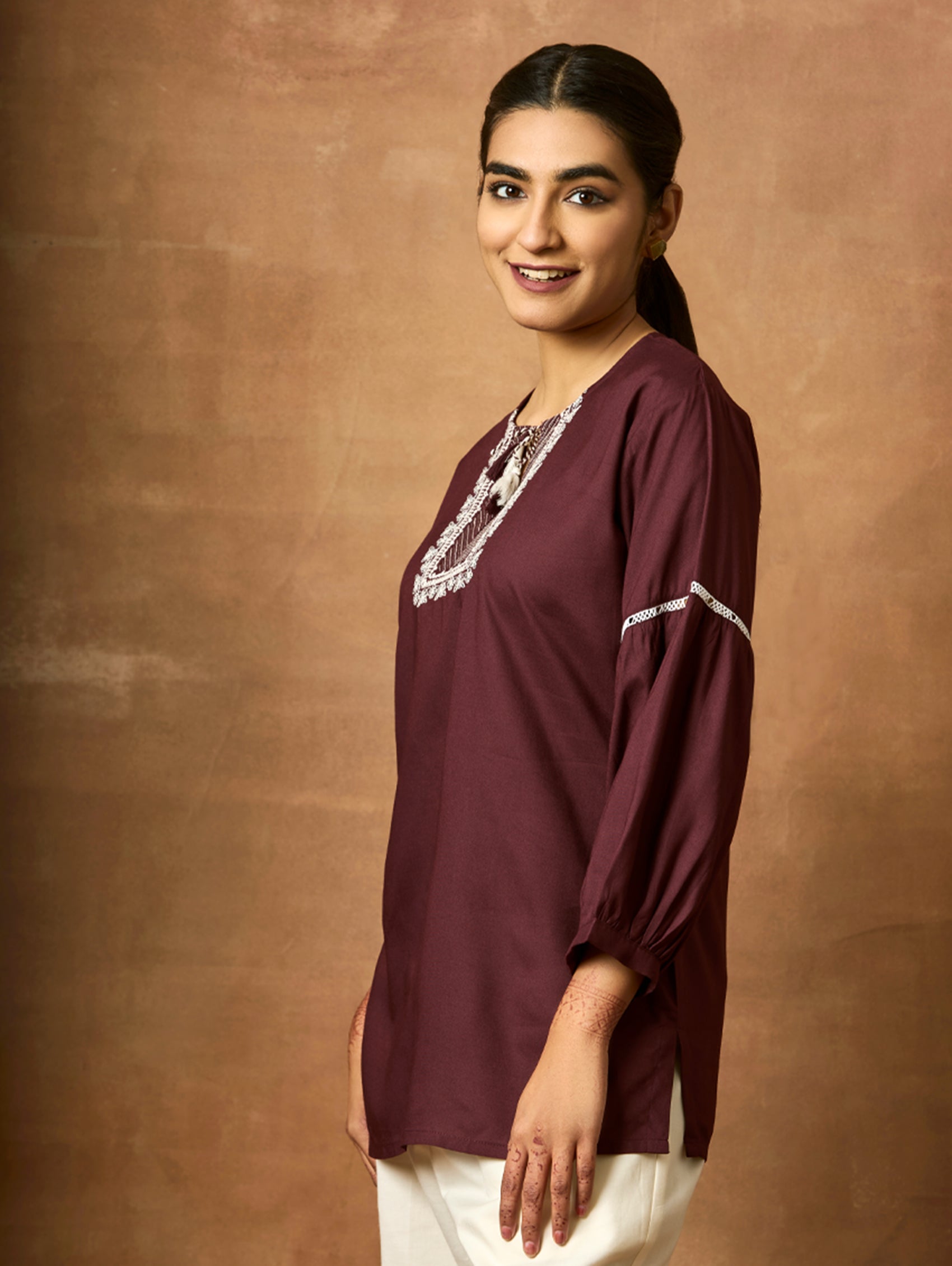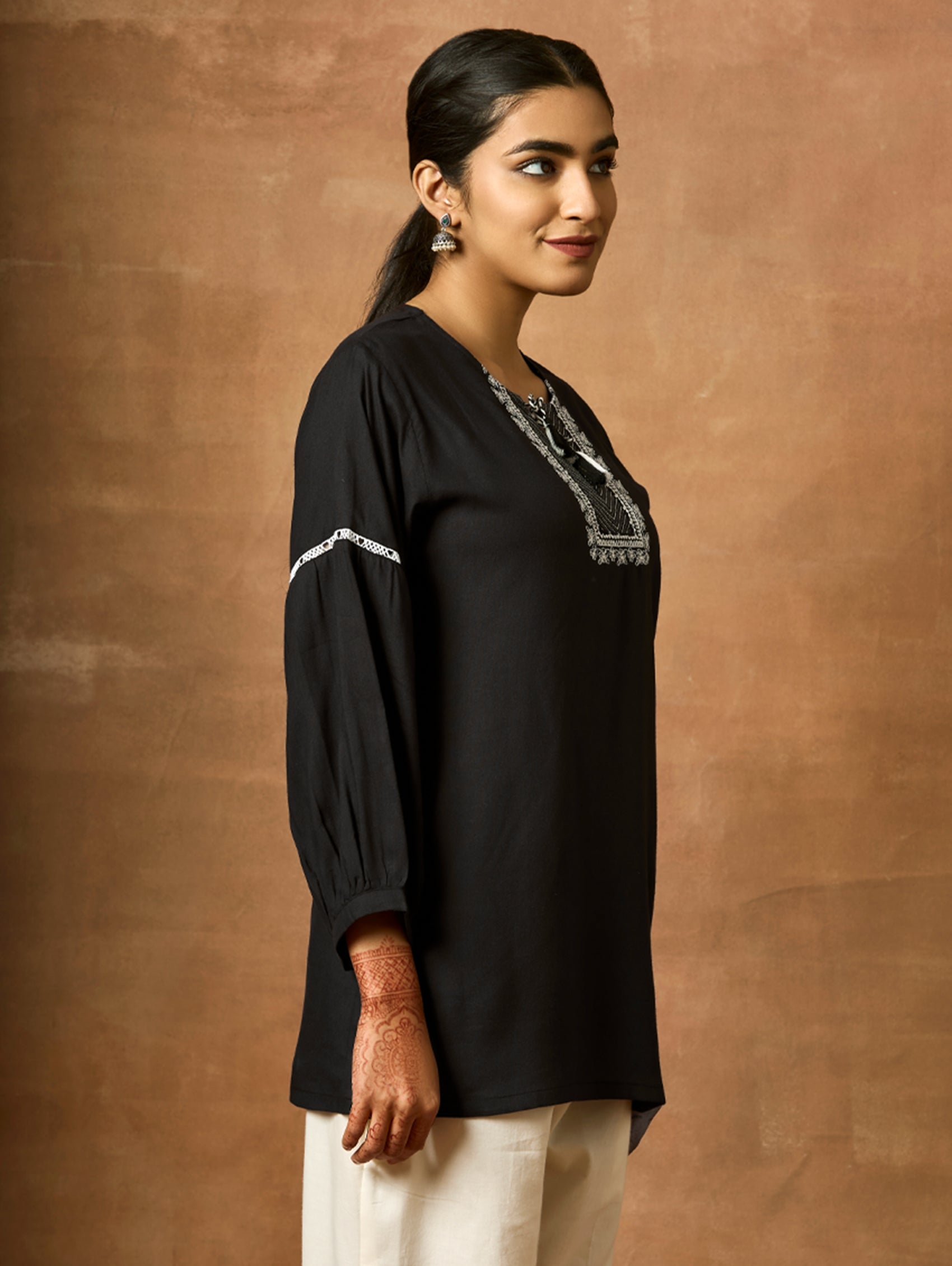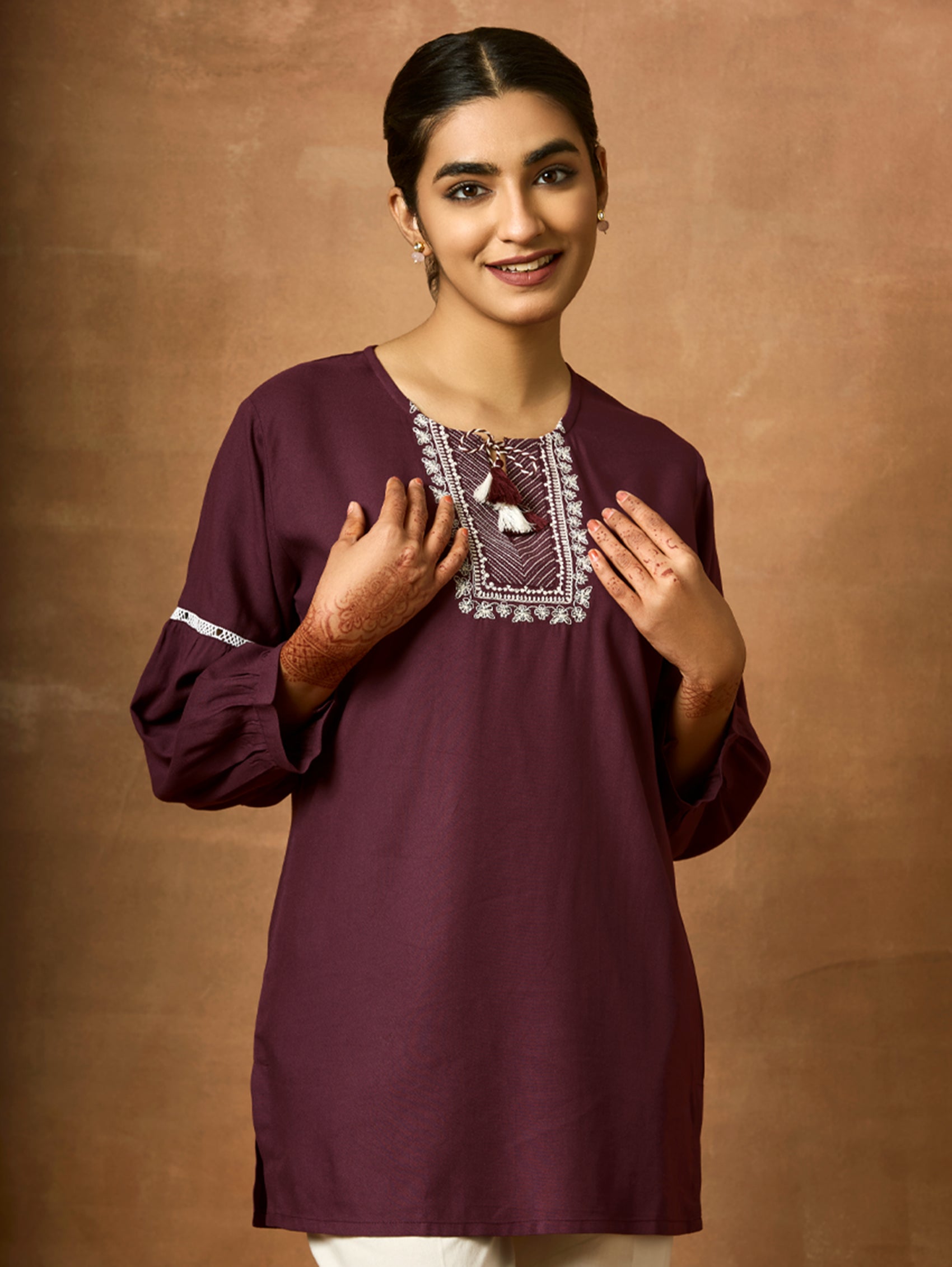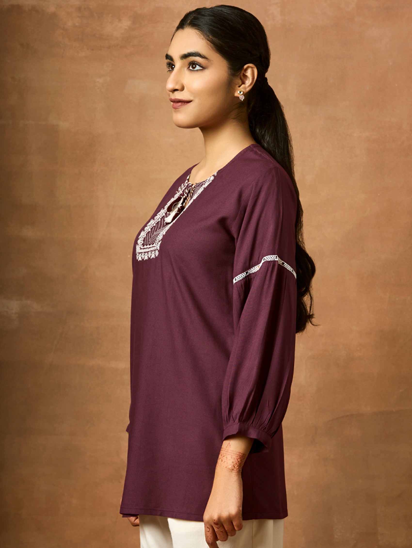 Introducing the newest member of our collection - an embroidered viscose rayon tunic adorned with a round neckline and three-quarter sleeves. Elevate your fashion game with this essential ensemble!