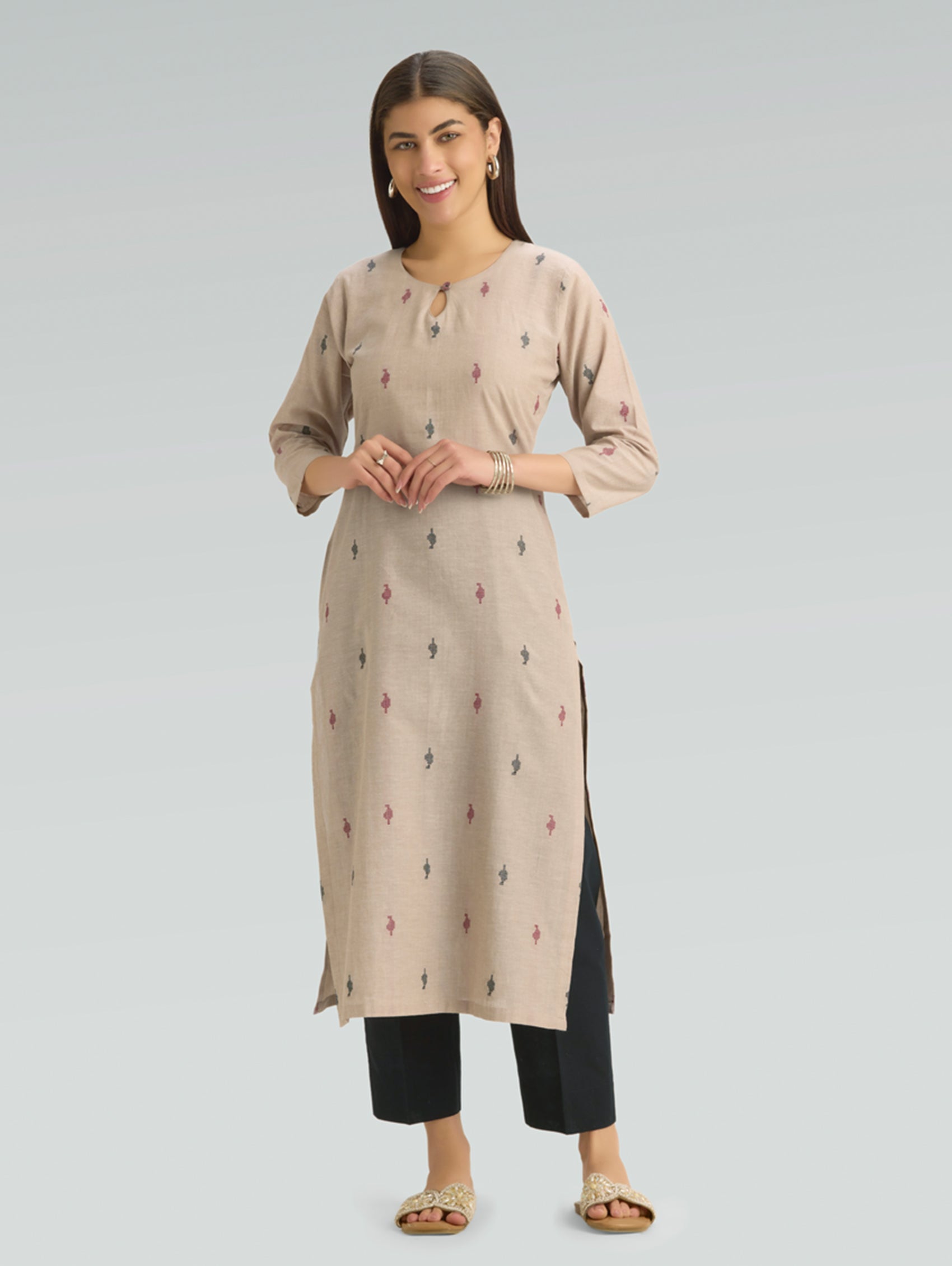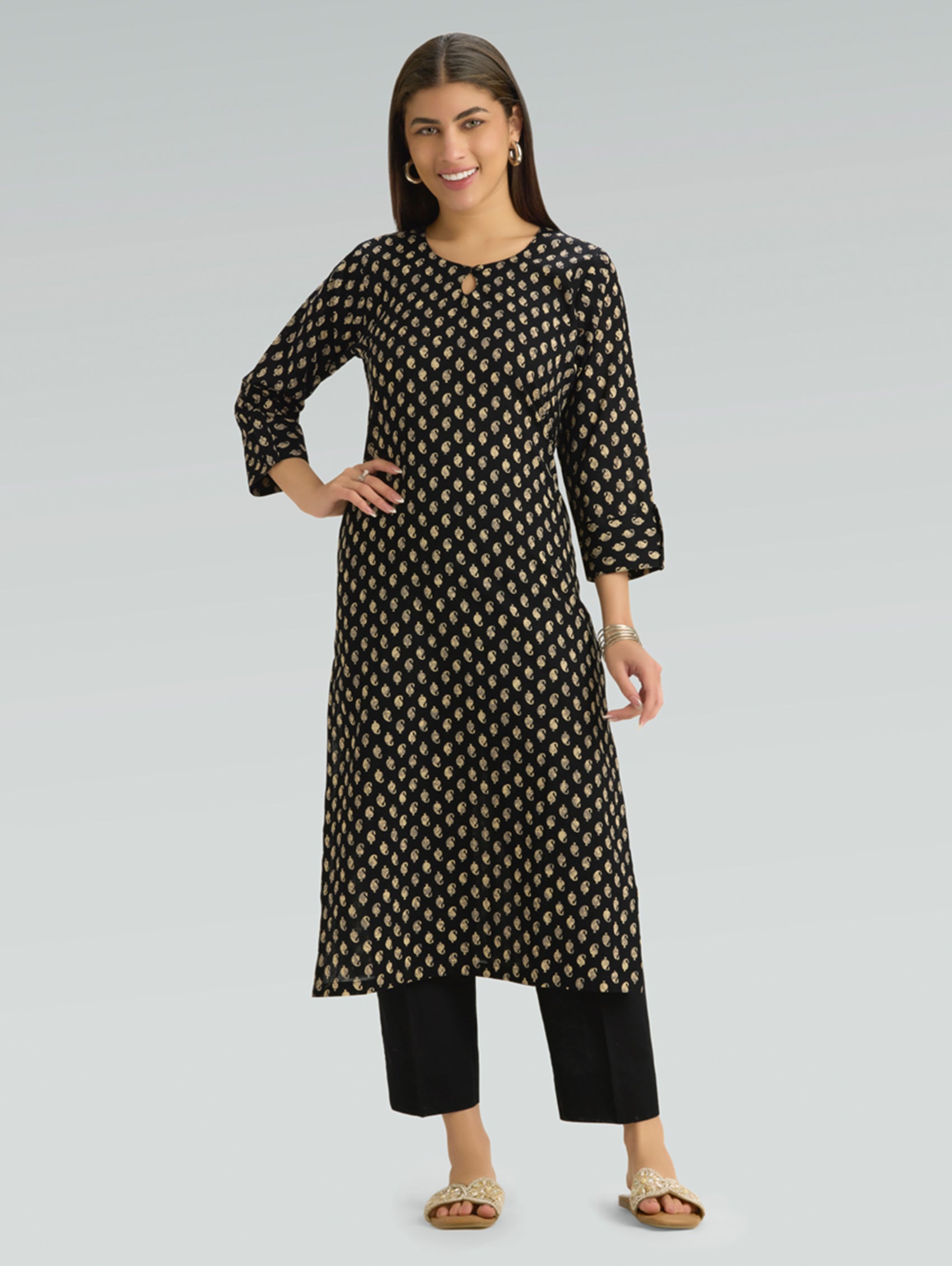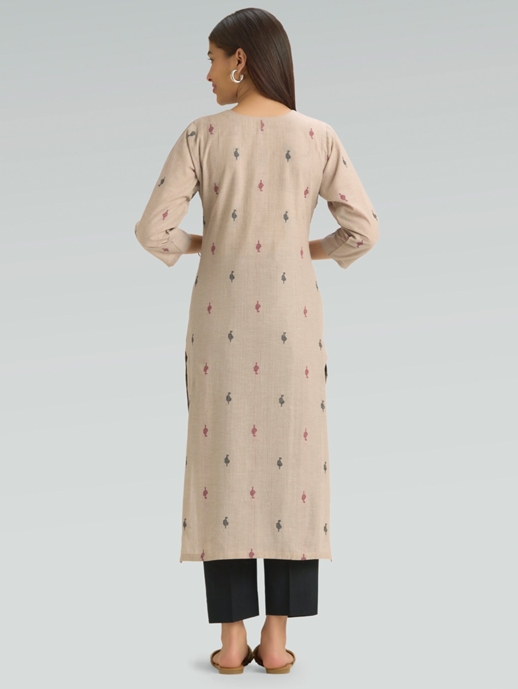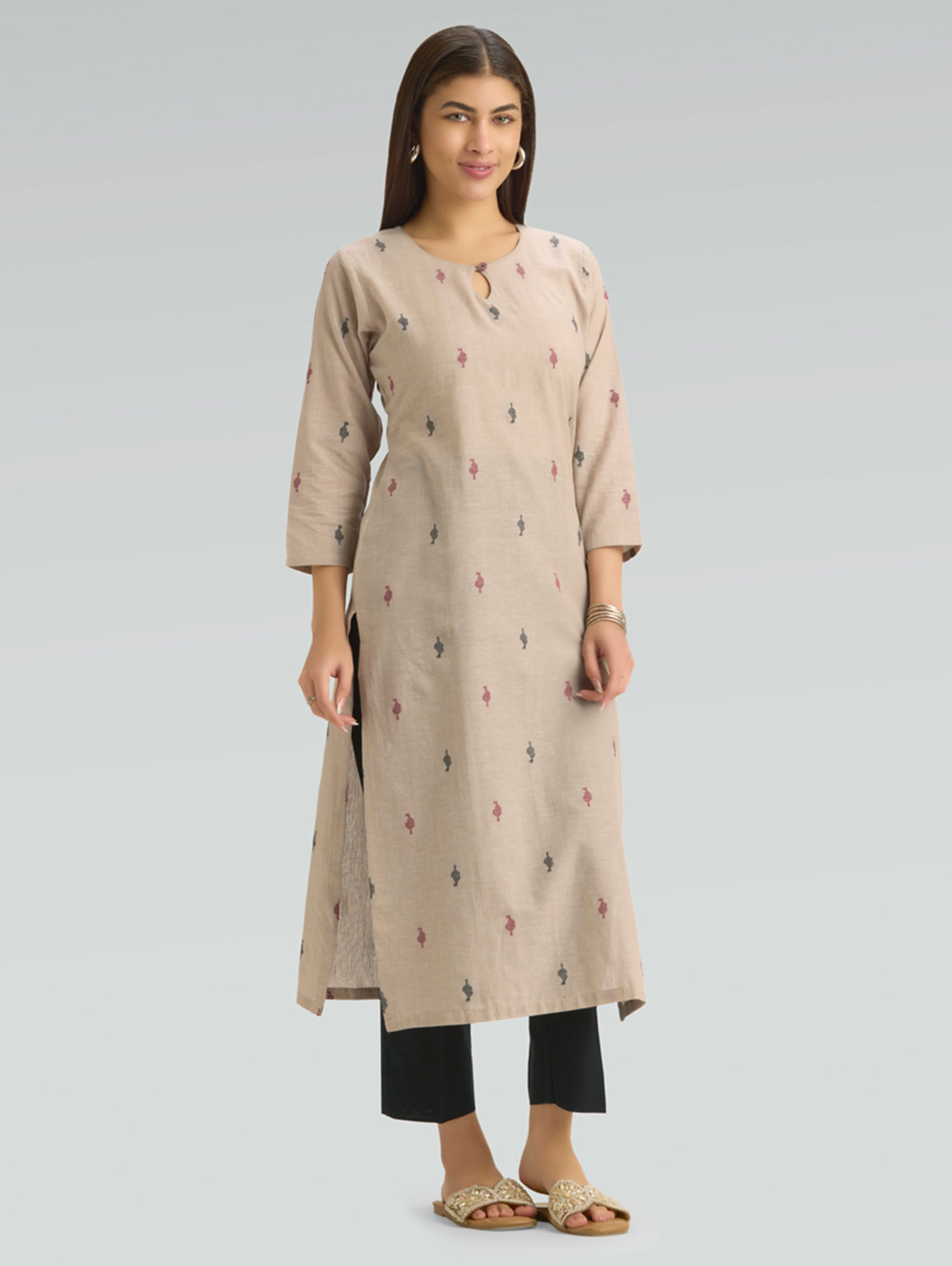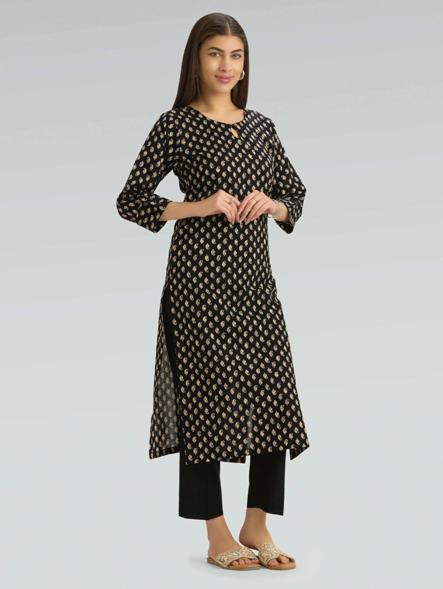 • Kurta with notch-round neckline, three-fourth sleeves, and side slits open.