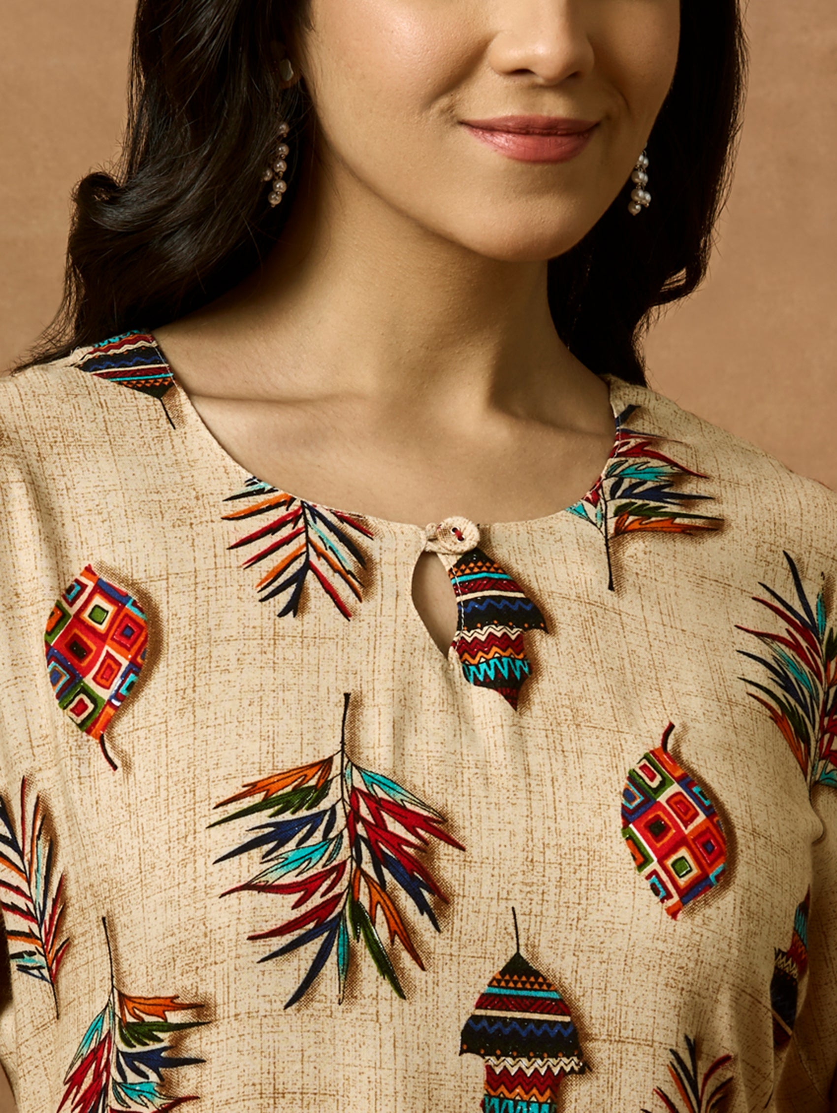 Discover the effortless style of this Women Plus kurta. With its keyhole-round neckline and three-fourth sleeves, this kurta is crafted from printed viscose rayon to keep you comfortable and cool during even the hottest summer days.