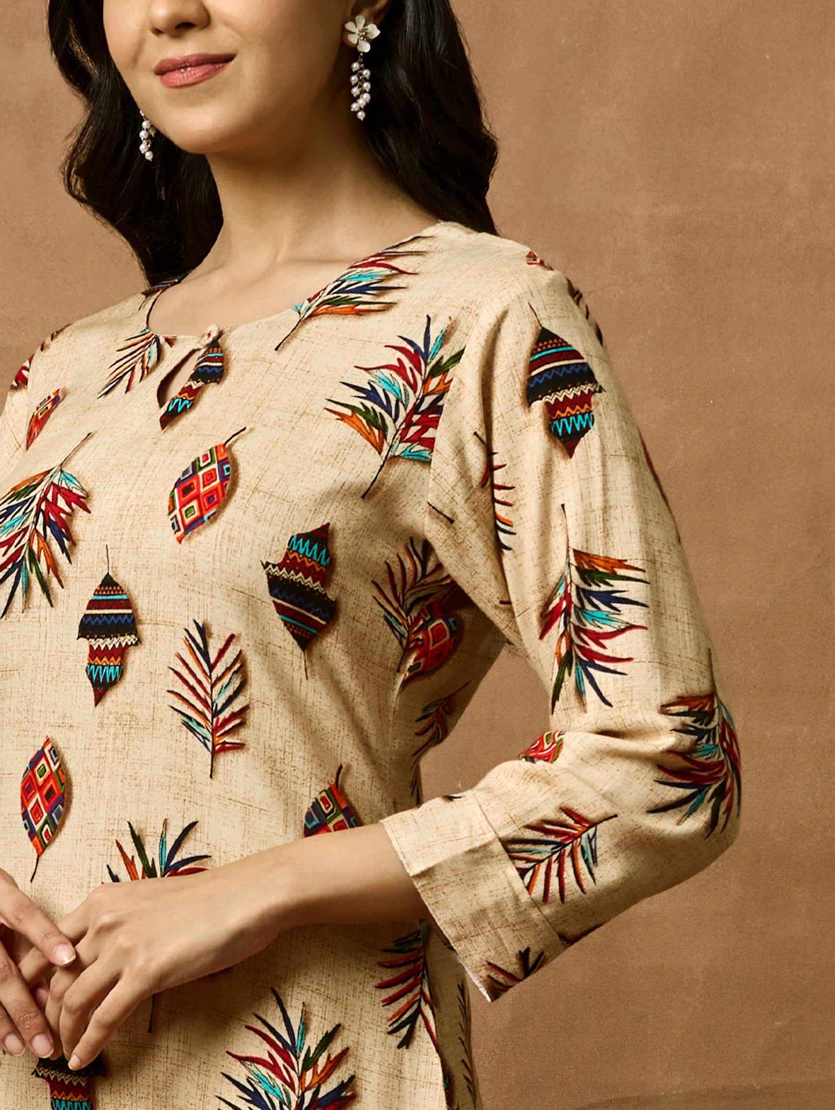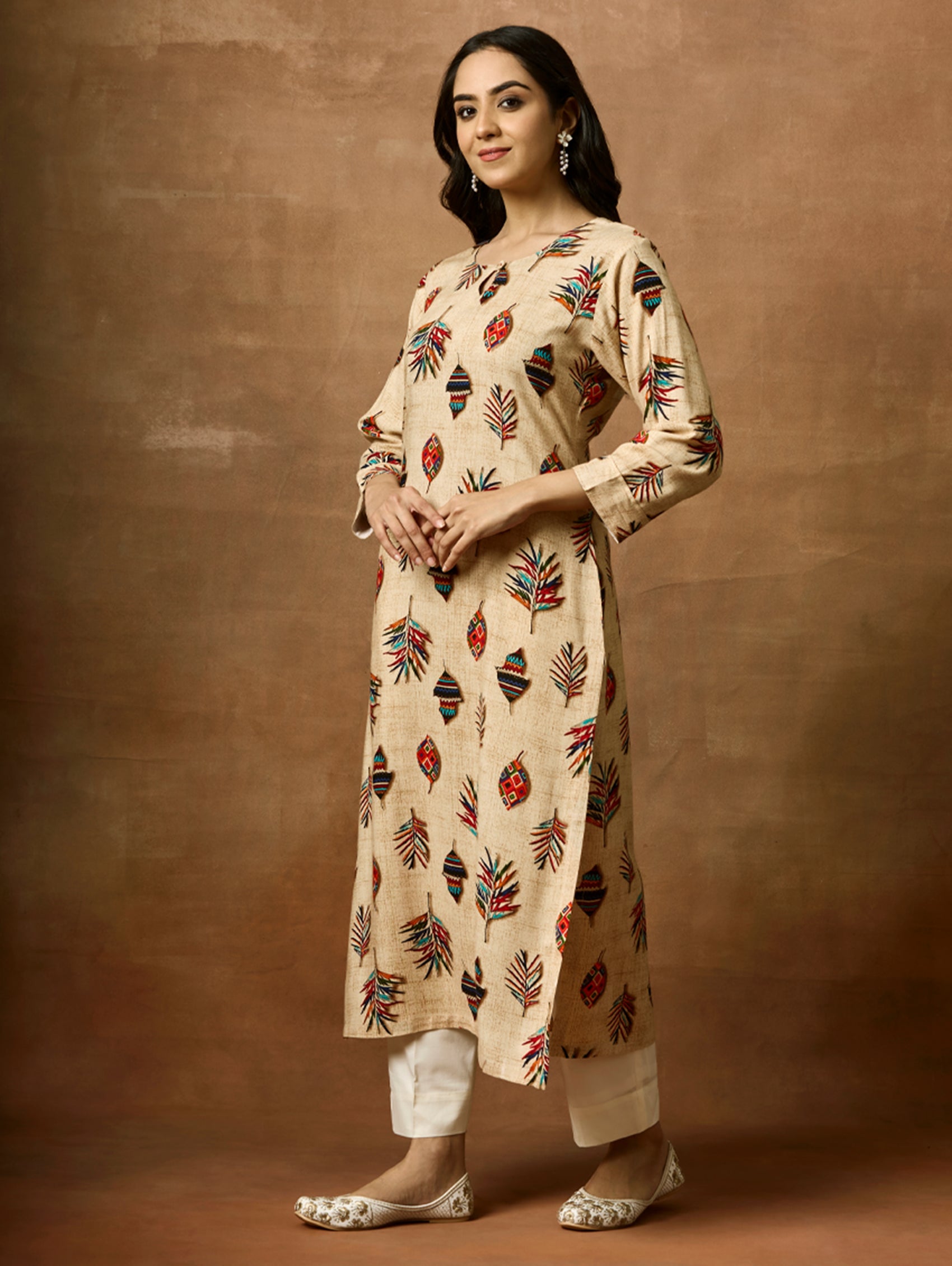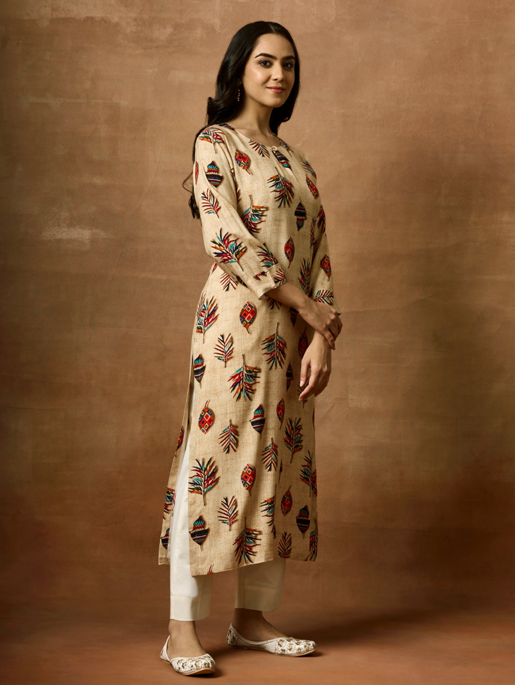 • Kurta with keyhole-round neckline, three-fourth sleeves, and side slits open.