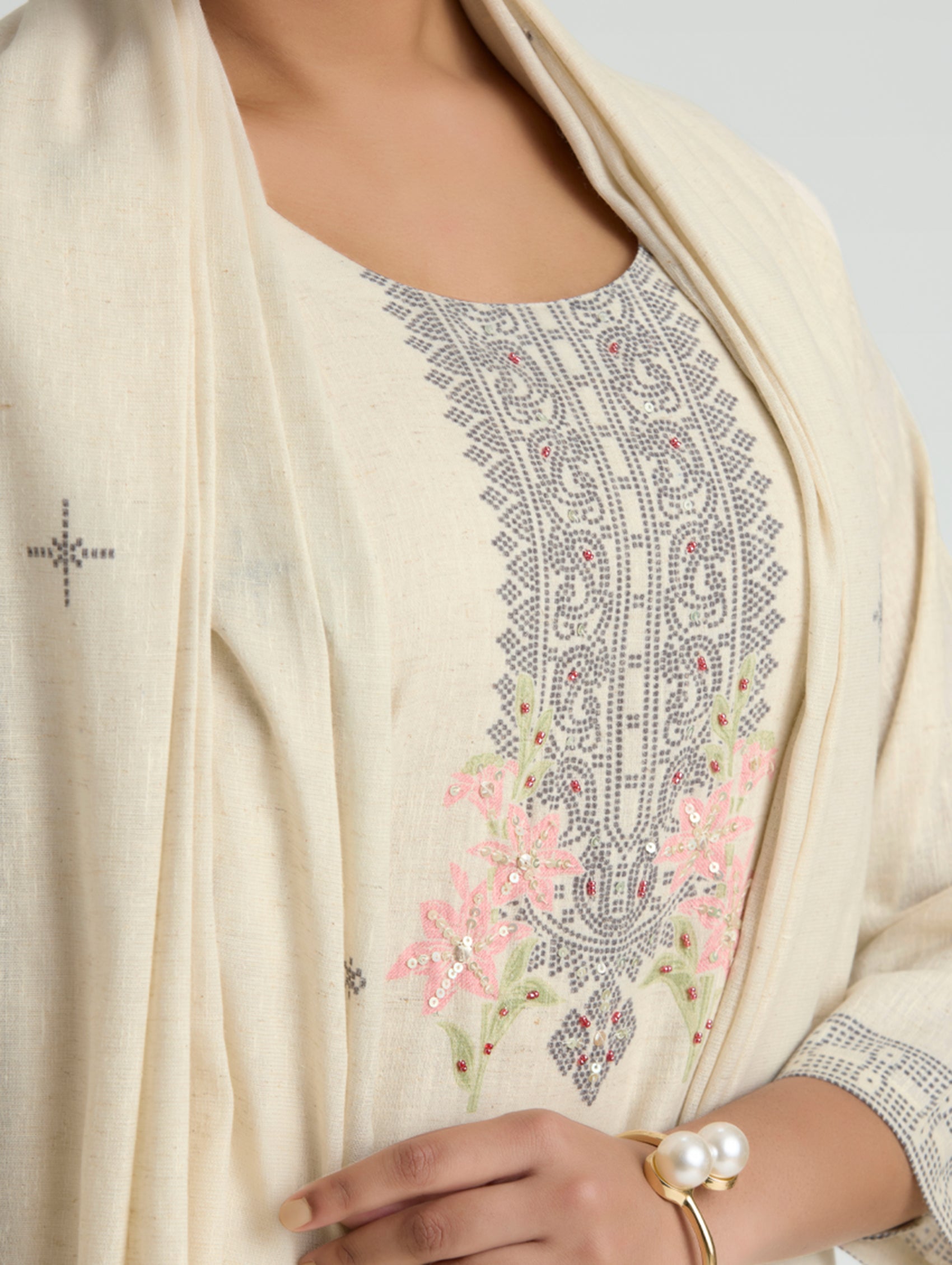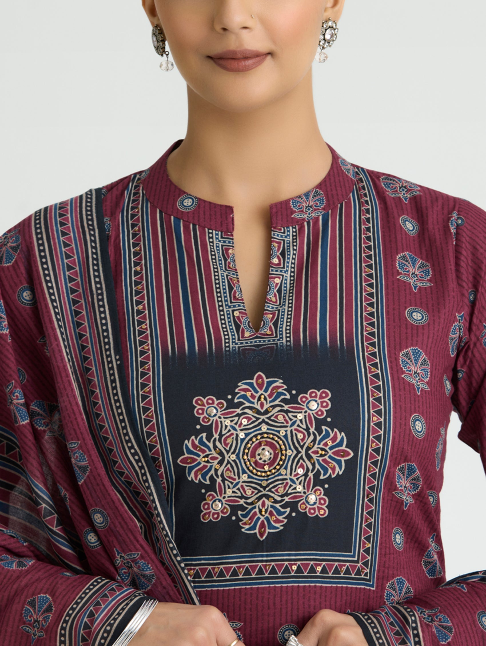 Elevate your ethnic wardrobe with this stunning digitally printed cotton flex suit set with dupatta. The intricately designed kurta showcases sophisticated computerised thread embroidery that catches every eye, while the coordinating digitally printed pants offer comfortable everyday wear. Complete the look with the matching digitally printed dupatta that ties the entire set together seamlessly. Perfect for everyday wear, gatherings, or whenever you want to radiate confidence and grace, this versatile collection lets you express your personal style with effortless elegance and timeless appeal.