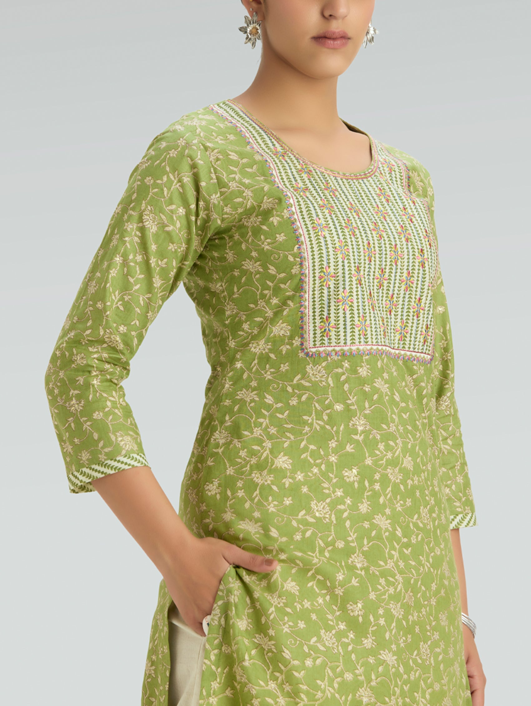 • Kurta with round neckline, three-fourth sleeves, and side slits open