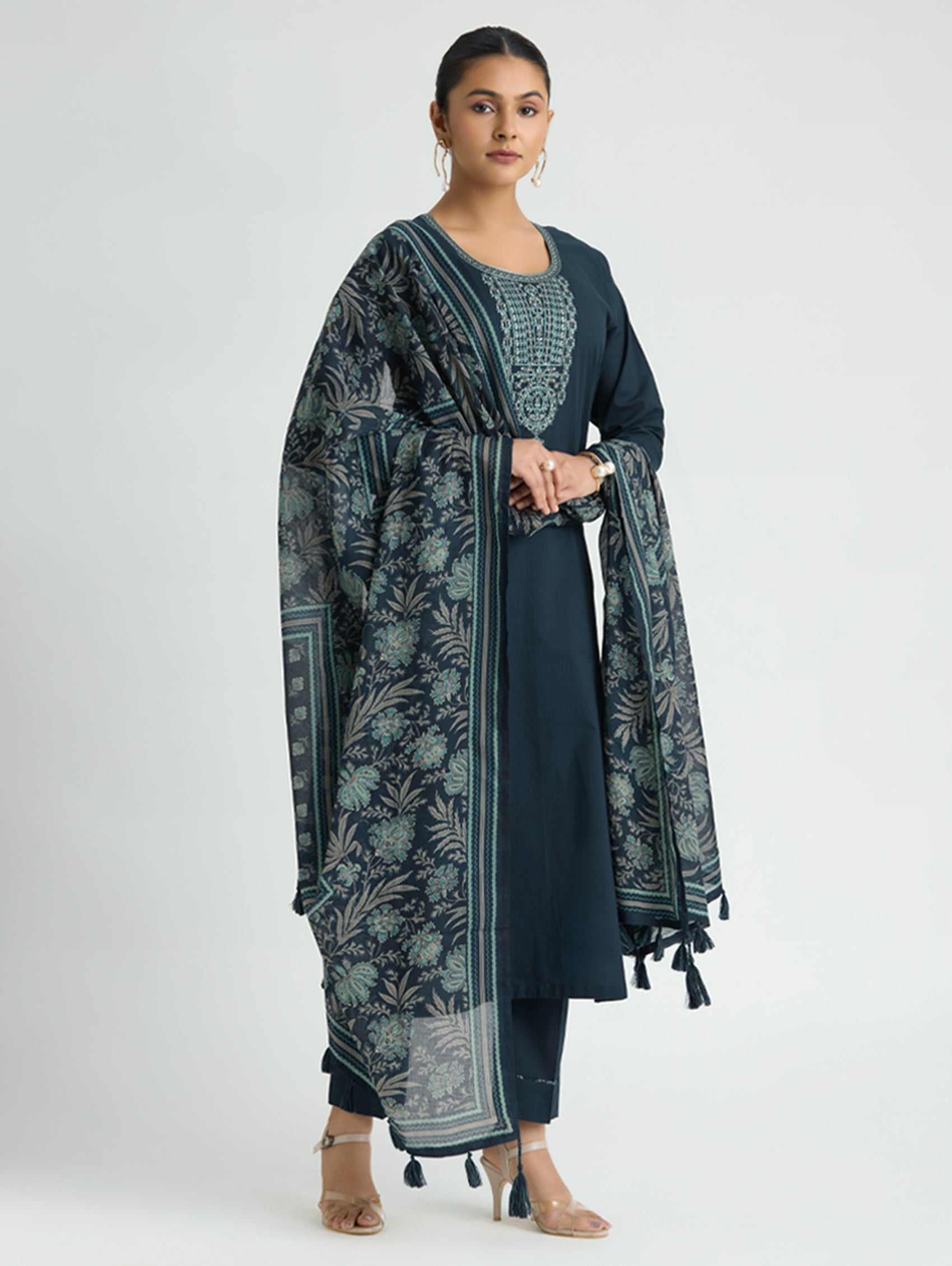Discover timeless elegance with this sophisticated pure cotton suit set that seamlessly merges heritage craftsmanship with contemporary design. The beautifully embroidered kurta features precision computerised thread work that adds depth and character to your everyday look. Paired with tailored straight pants and a delicately printed pure cotton mul dupatta, this ensemble offers versatility for both casual gatherings and special occasions. Perfect for the modern woman who values quality, comfort, and refined style without compromising on authenticity.